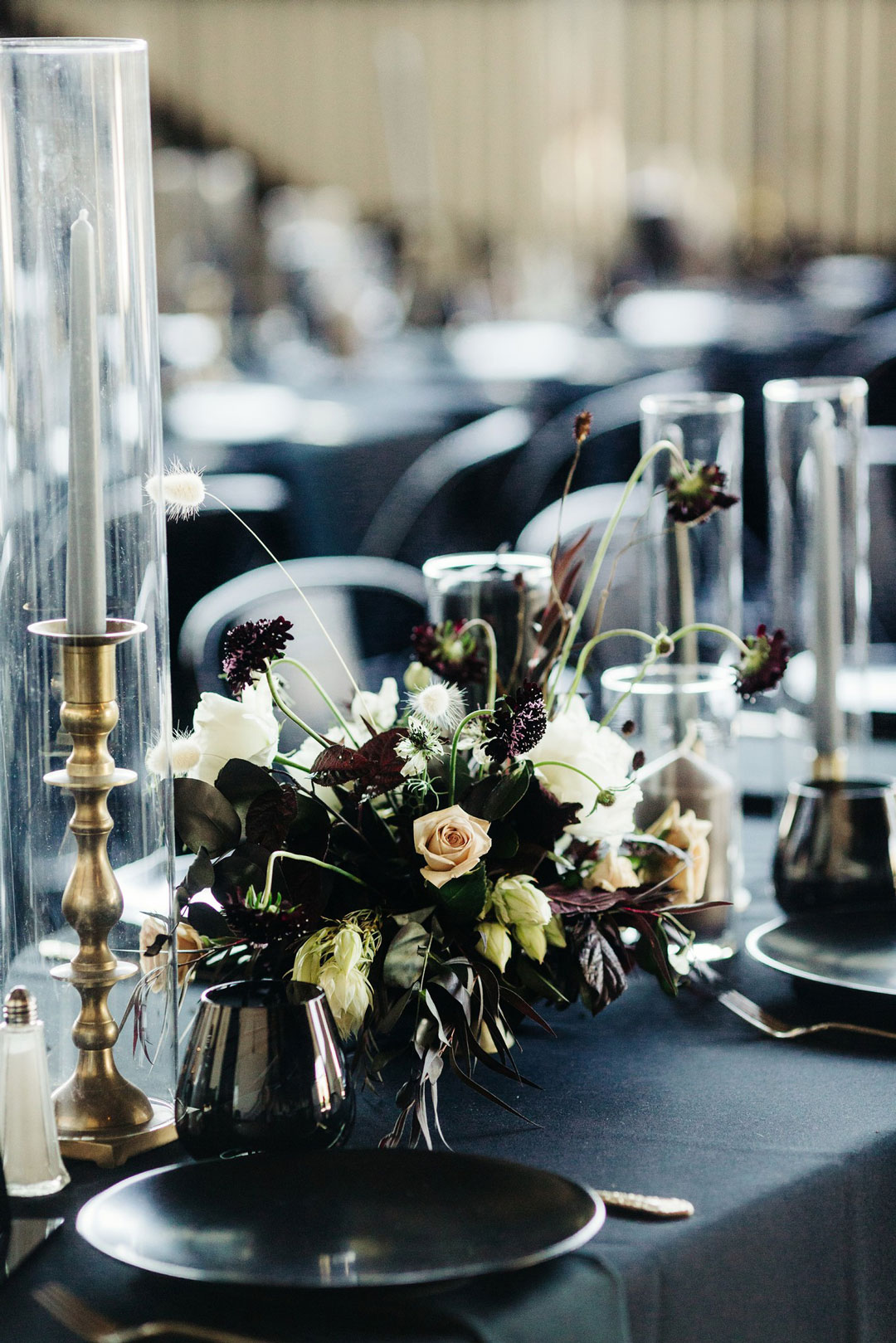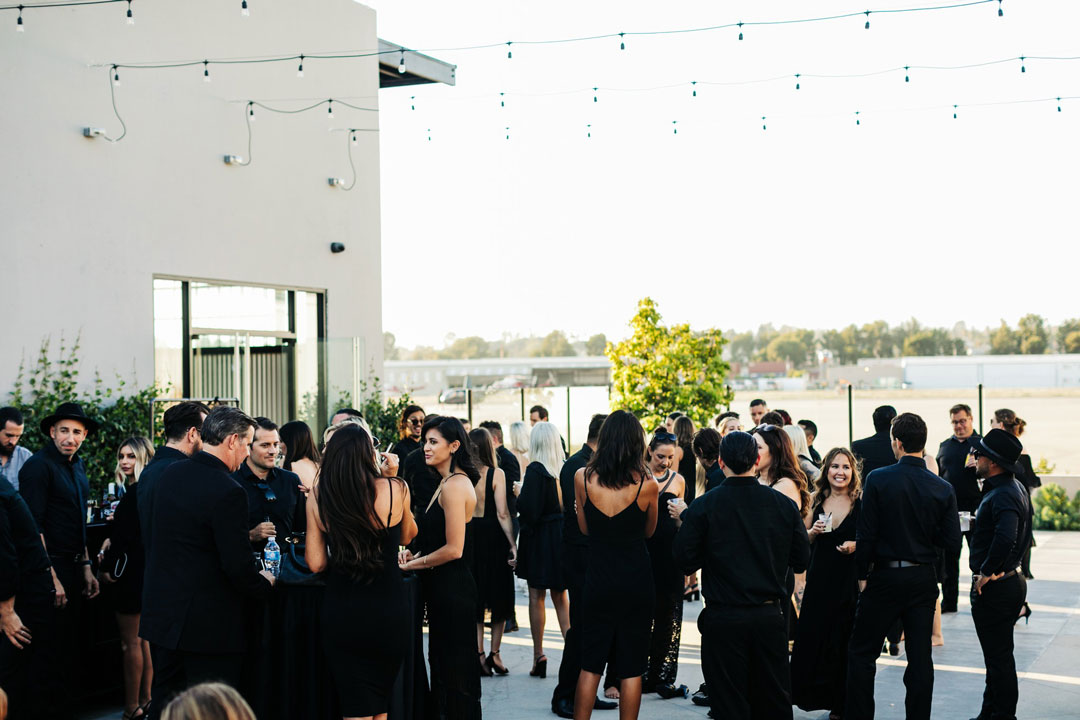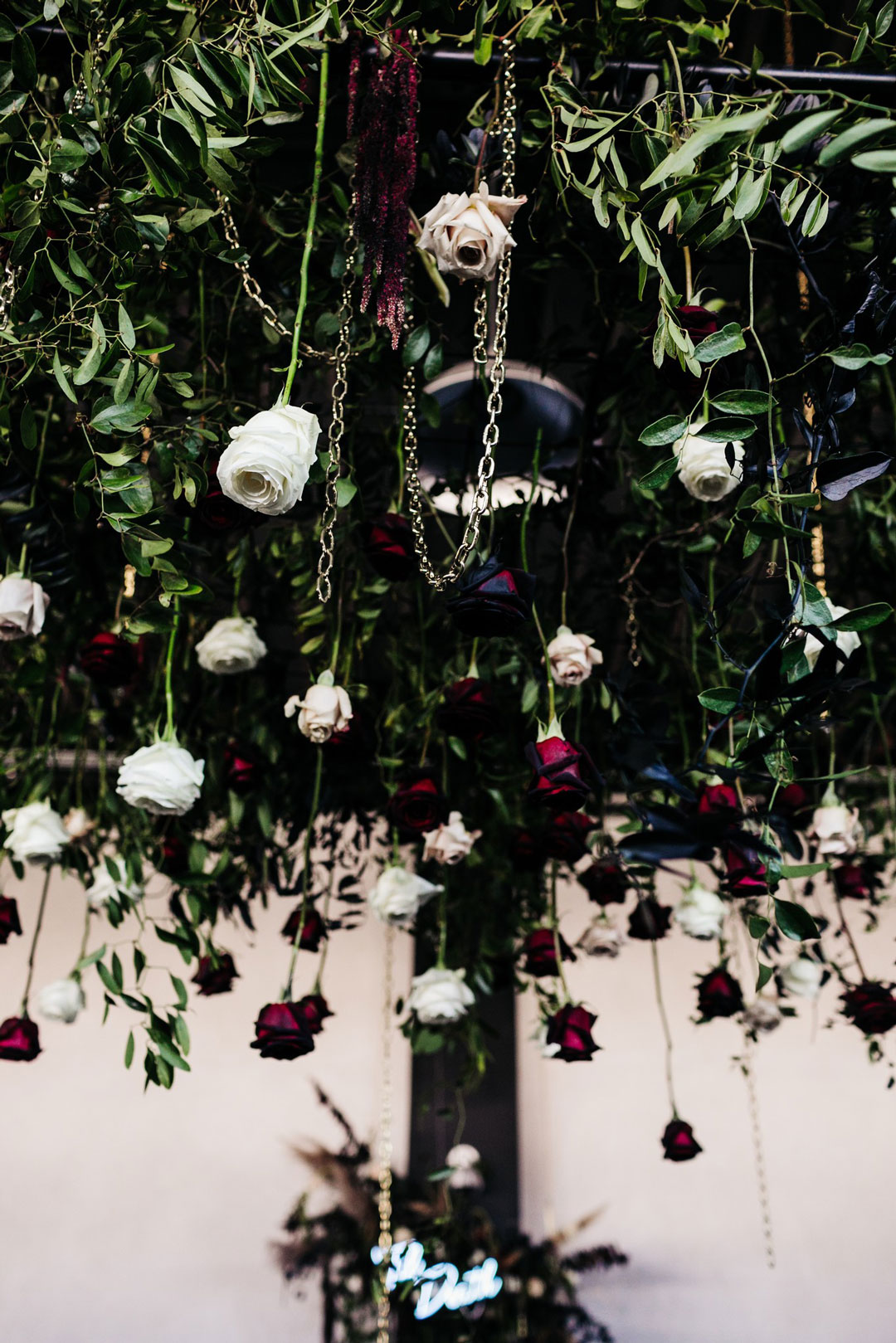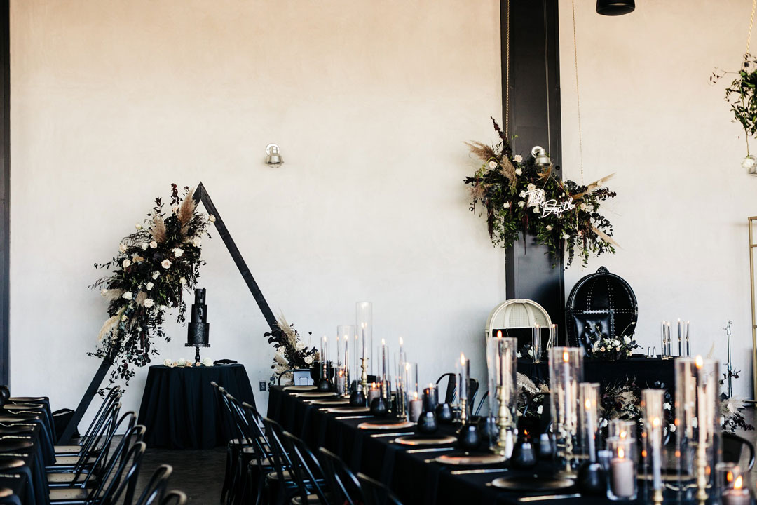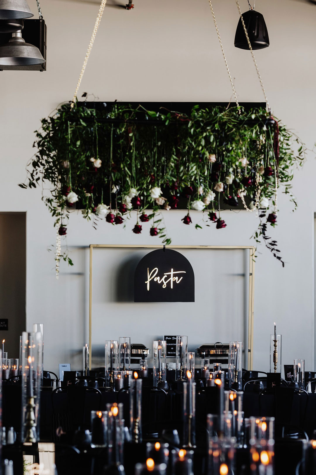 TKay and Ryan had the most epic wedding anniversary at Hangar 21 South. Dark romance and goth vibes inspired the décor for their special day from the guests’ black attire to the deep red and purple roses decorating arches, tabletops and the dance floor. Tkay wore a gorgeous white lace dress with button back detailing and gold studded Louboutins while her bridesmaids wore all black, mermaid style dresses and had matching “girl gang” black leather jackets. Ryan was dressed in a black coat with white lapel, joggers and studded Oxford Louboutins. The two met under a triangular arch where they exchanged loving words surrounded by friends and family before heading into cocktail hour where Vegan Grilled Polenta with Roasted Sweet Corn and Braised Pork Belly Steamed Buns were served. TKay and Ryan were on the tarmac taking pictures with each other and their wedding party before heading back into the venue for toasts and dinner. The couple opted for our Stations Menu. A Slider Station with Smoked Beef Brisket Sliders and Impossible Vegan Sliders, Salad Station with Vegan Pear & Walnut Salad and Caesar Salad, and Pasta Station with Vegan Penne Alla Checca and Tortellini with Creamy Pesto were located around the inside of Hangar 21 South and decorated in dark florals and black signs to match the theme. TKay and Ryan’s sweetheart table was draped in black linen and surrounded by pampas grass and dark shades of roses. Two Victorian balloon chairs sat behind the table and above them was a neon sign that read, “’Til Death.” The cake was cut and guests enjoyed our Vegan Chocolate Chip Cookies, Elanor's Old Fashioned Carrot Cupcakes, S'mores Cupcakes and assorted French Macarons. Then everyone hit the dance floor that had deep red and white roses hanging over it. Not one detail was left unthought of for their anniversary and we’re swooning over the outcome.