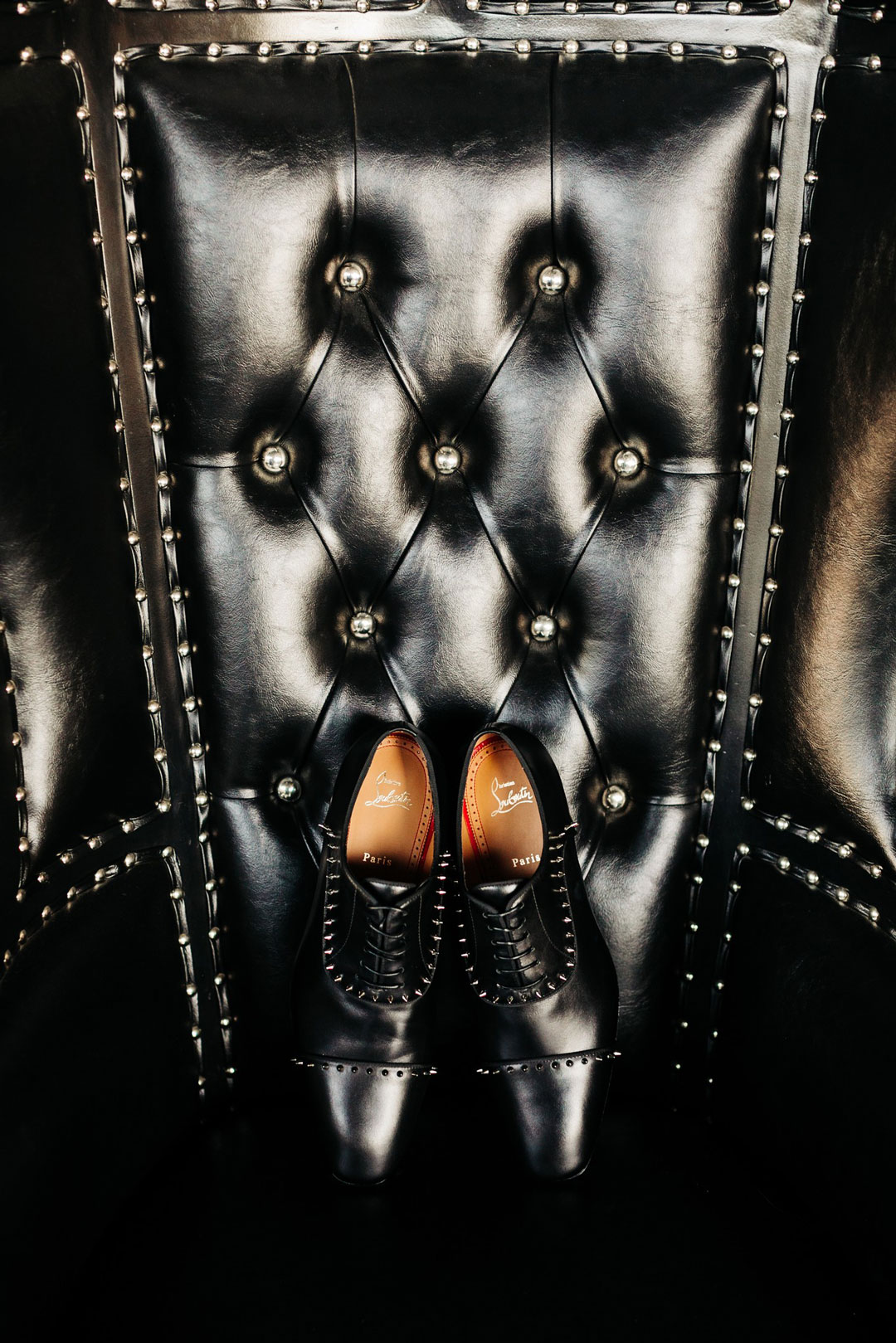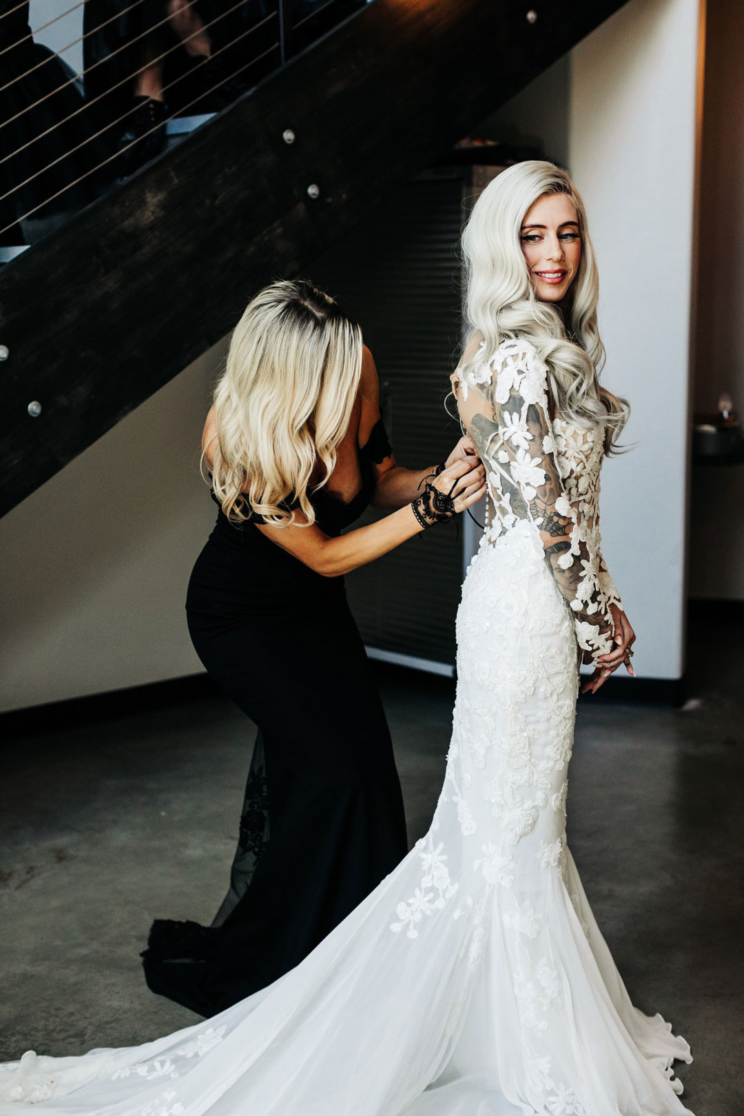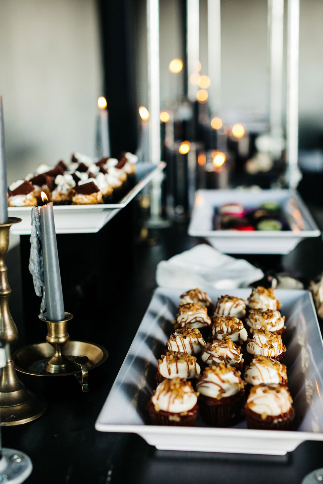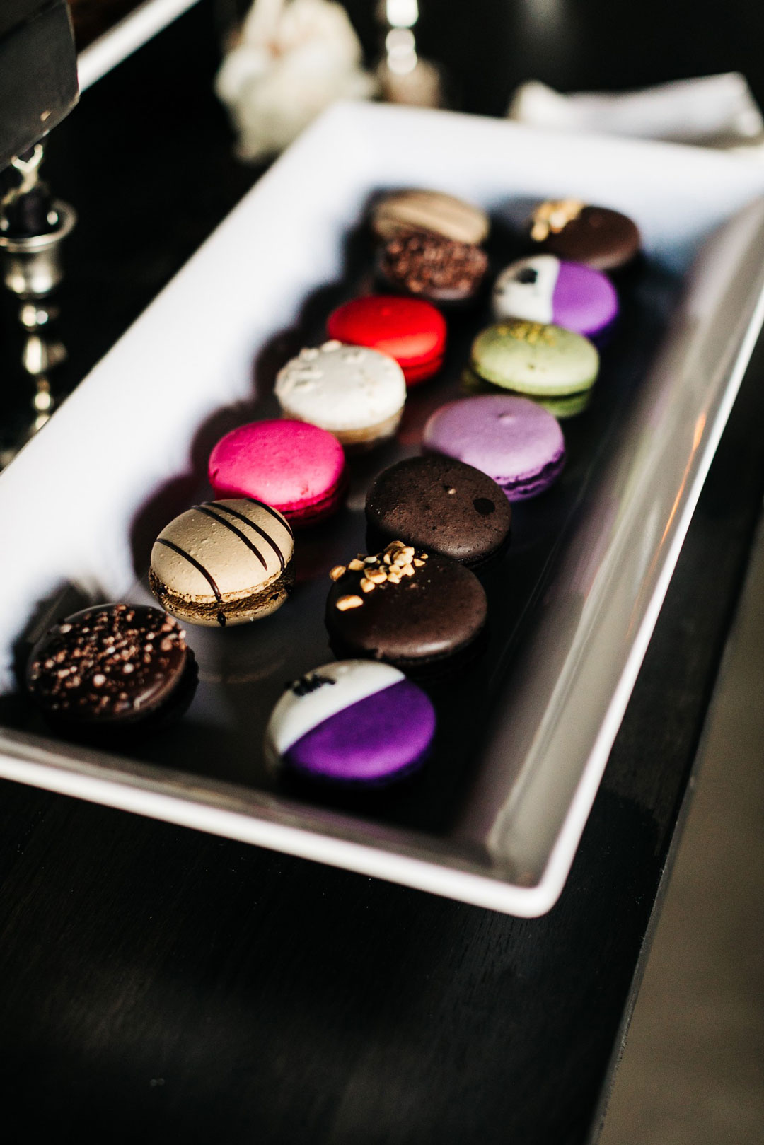TKay and Ryan had the most epic wedding anniversary at Hangar 21 South. Dark romance and goth vibes inspired the décor for their special day from the guests’ black attire to the deep red and purple roses decorating arches, tabletops and the dance floor. Tkay wore a gorgeous white lace dress with button back detailing and gold studded Louboutins while her bridesmaids wore all black, mermaid style dresses and had matching “girl gang” black leather jackets. Ryan was dressed in a black coat with white lapel, joggers and studded Oxford Louboutins. The two met under a triangular arch where they exchanged loving words surrounded by friends and family before heading into cocktail hour where Vegan Grilled Polenta with Roasted Sweet Corn and Braised Pork Belly Steamed Buns were served. TKay and Ryan were on the tarmac taking pictures with each other and their wedding party before heading back into the venue for toasts and dinner. The couple opted for our Stations Menu. A Slider Station with Smoked Beef Brisket Sliders and Impossible Vegan Sliders, Salad Station with Vegan Pear & Walnut Salad and Caesar Salad, and Pasta Station with Vegan Penne Alla Checca and Tortellini with Creamy Pesto were located around the inside of Hangar 21 South and decorated in dark florals and black signs to match the theme. TKay and Ryan’s sweetheart table was draped in black linen and surrounded by pampas grass and dark shades of roses. Two Victorian balloon chairs sat behind the table and above them was a neon sign that read, “’Til Death.” The cake was cut and guests enjoyed our Vegan Chocolate Chip Cookies, Elanor's Old Fashioned Carrot Cupcakes, S'mores Cupcakes and assorted French Macarons. Then everyone hit the dance floor that had deep red and white roses hanging over it. Not one detail was left unthought of for their anniversary and we’re swooning over the outcome.