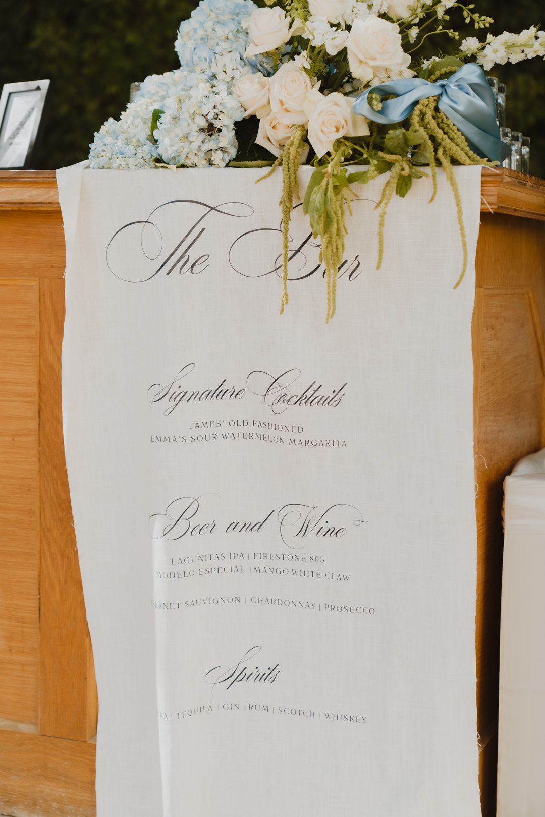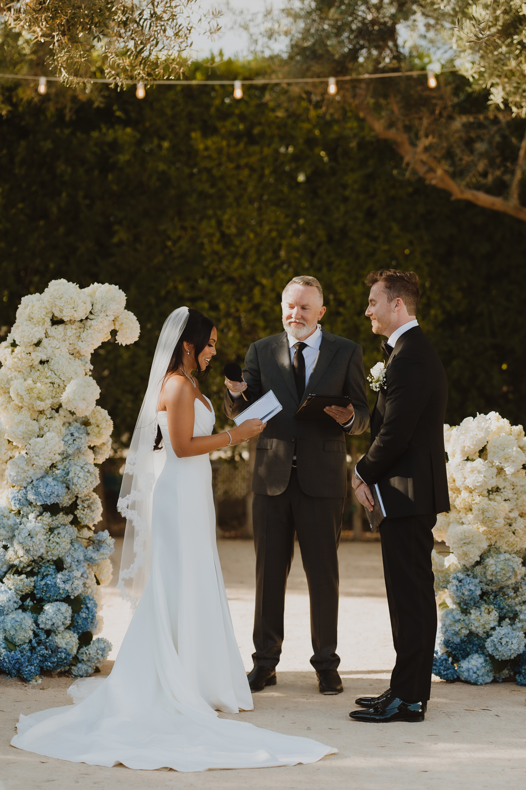 Guests entered the Olive Grove, signed James and Emma’s guest book, then took a seat. Plumes of white floral arrangements lined the aisle with baby blue bows, and at the head, two tall blue-to-white ombre floral arrangements stood tall framing in the bride and groom’s ceremony space. Once everyone was seated, the wedding party made their entrances. In front of all their closest friends and loving family, Emma and James read personalized vows, exchanged rings, and sealed the ceremony with a kiss.