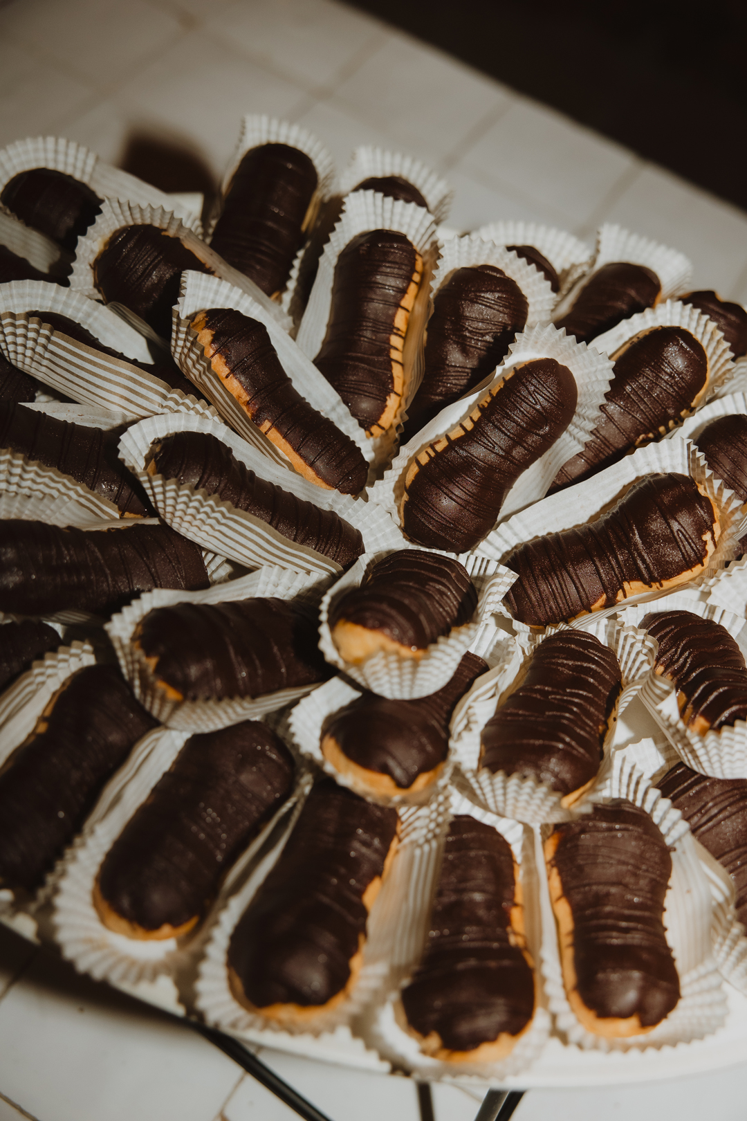 Inside, tables were topped with white flower centerpieces, table lamps, custom printed menus, and blue floral-patterned plates. Emma and James made their grand entrance, shared their first dance, then took a seat at their sweetheart table. Toasts were shared and Chicken Marsala, Filet Mignon Carvery, Tortellini with Creamy Pesto, Mashed Potatoes, Grilled Marinated Vegetables, and Pear and Walnut Salad was served. The dinner menu was selected by the bride and groom with help from our event specialist, Selena. After dinner, Emma changed into a second look and cut our Lemon Blueberry Vintage Heart Cake with Citrus Honey Creme Filling with James. After sharing a bite, the couple invited everyone to indulge in our Classic Dessert Station with a collection of Raspberry Chocolate Decadence Cakes, Fresh Fruit Tarts, Vanilla Bean Chocolate Eclairs, Mango and Passion Fruit Macarons, and French Apple Tarts. The evening ended with everyone out on the dance floor showing off their best moves.