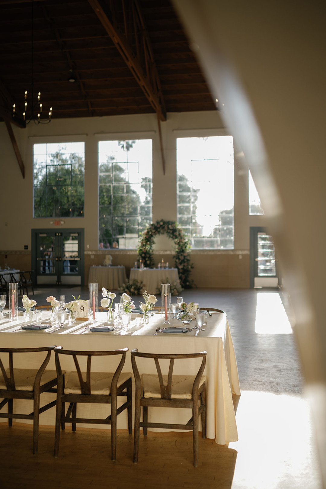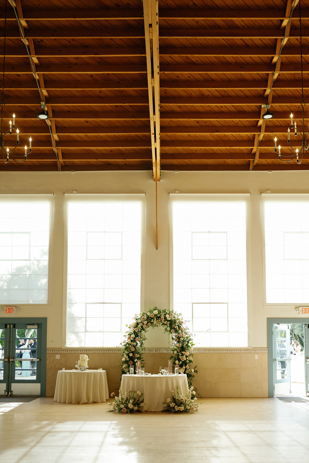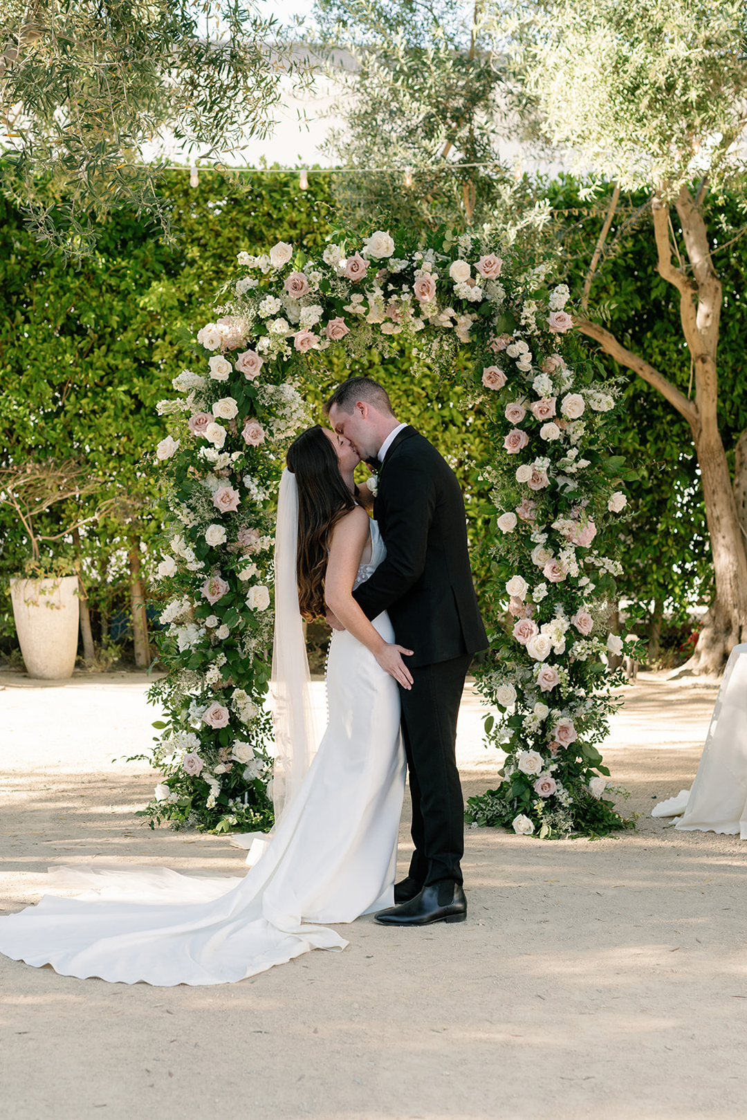Cassie and her bridesmaids and Michael and his groomsmen got ready inside the Powder Room and Parlor at Grand Gimeno, then lined up for the ceremony as guests began arriving at the venue. White and blush pink roses decorated the ceremony arch that stood tall under the Olive Grove trees. Once everyone had taken a seat, the music cued up and the wedding party made their entrances ending with Cassie. Happy tears filled Cassie and Michael’s eyes when they saw each other for the first time that day. Joined together at the headed of the aisle, the couple recited their vows, broke bread, exchanged rings, and sealed the ceremony with a kiss.