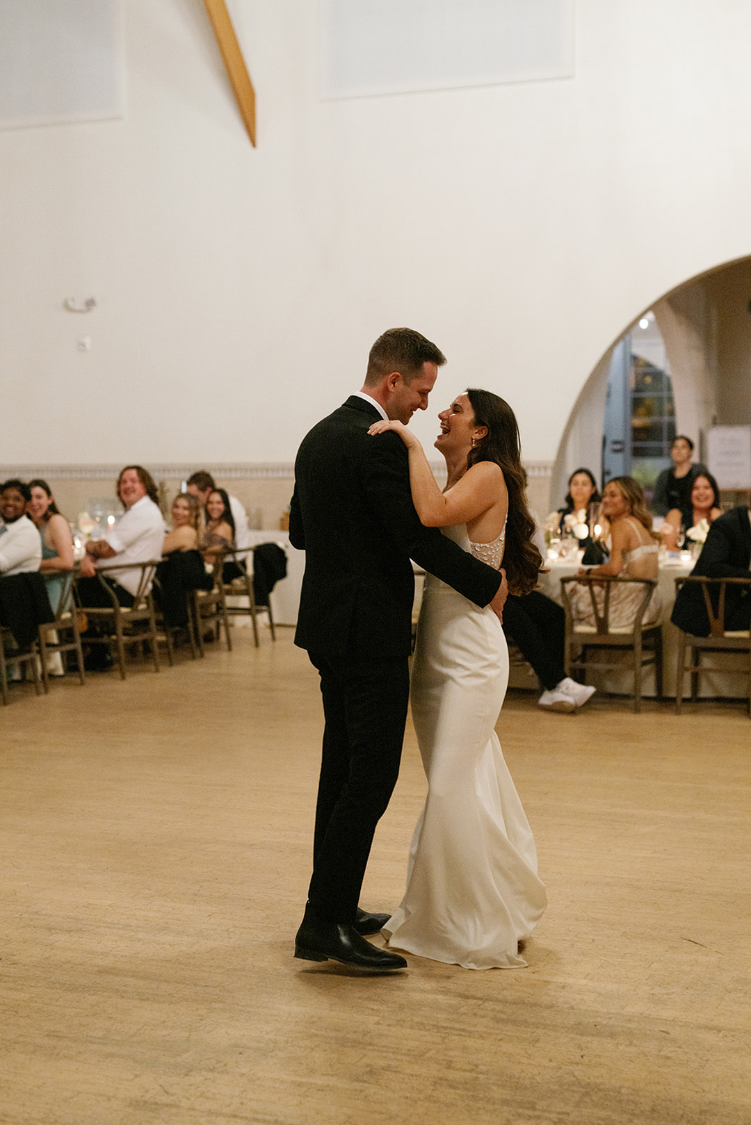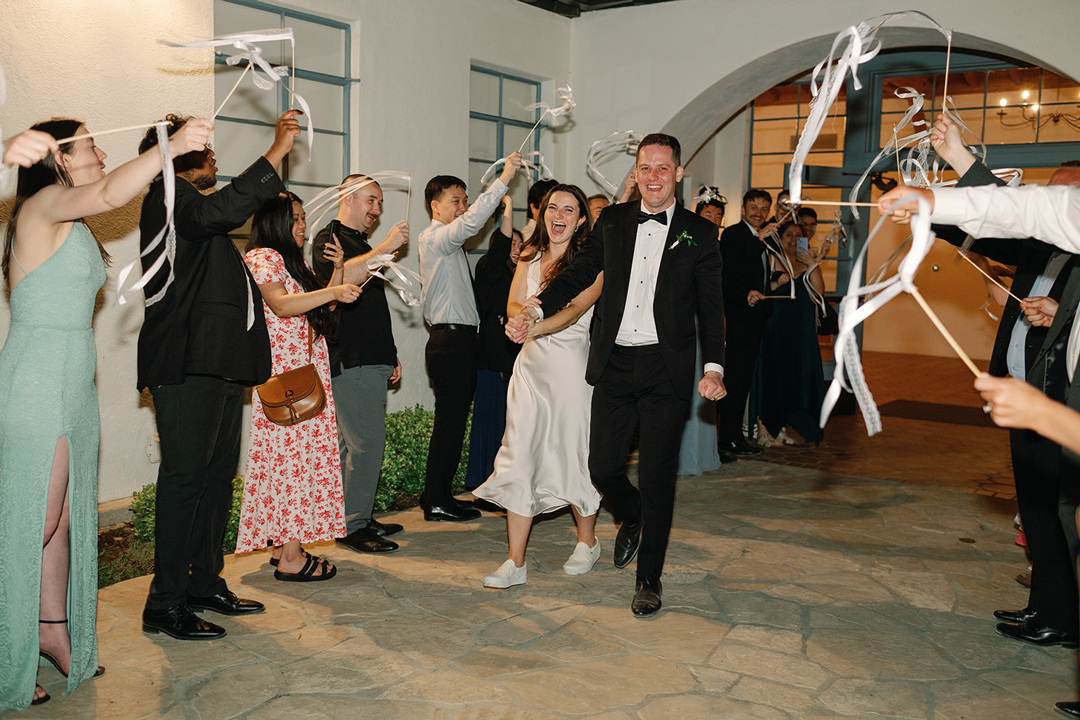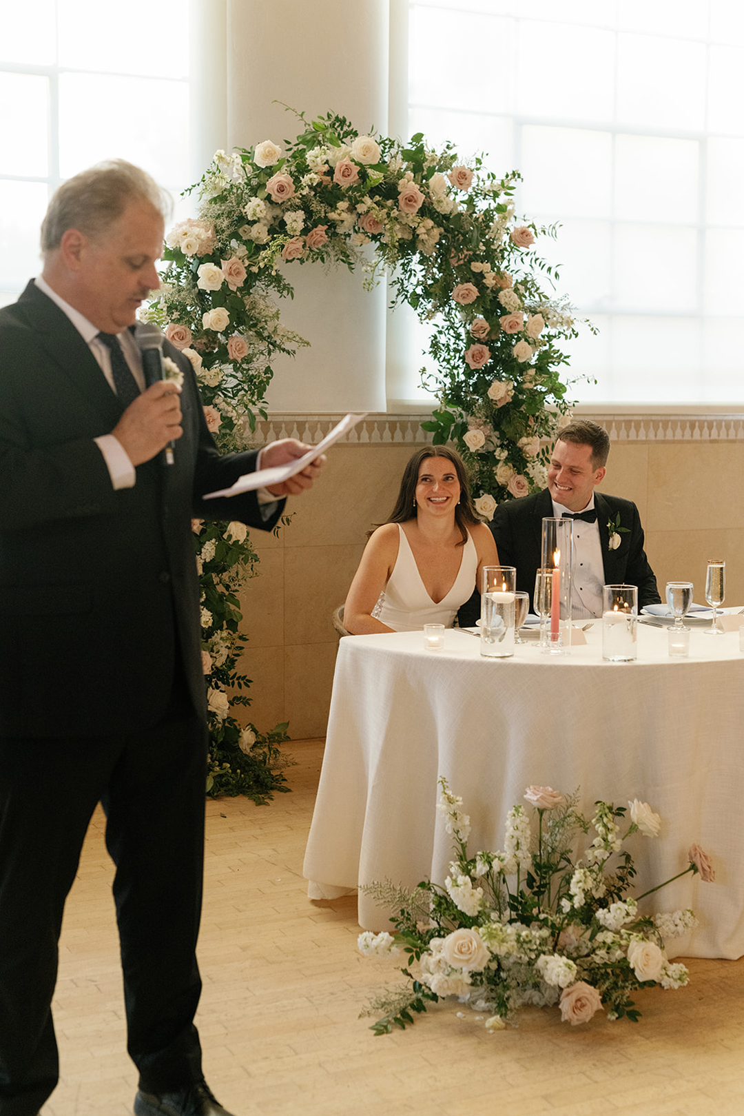 Cassie and her bridesmaids and Michael and his groomsmen got ready inside the Powder Room and Parlor at Grand Gimeno, then lined up for the ceremony as guests began arriving at the venue. White and blush pink roses decorated the ceremony arch that stood tall under the Olive Grove trees. Once everyone had taken a seat, the music cued up and the wedding party made their entrances ending with Cassie. Happy tears filled Cassie and Michael’s eyes when they saw each other for the first time that day. Joined together at the headed of the aisle, the couple recited their vows, broke bread, exchanged rings, and sealed the ceremony with a kiss.