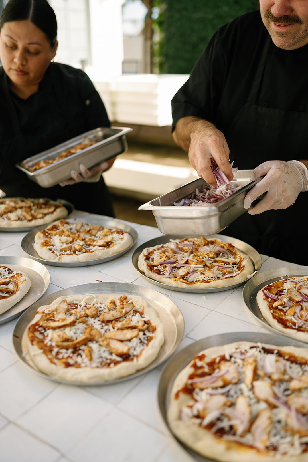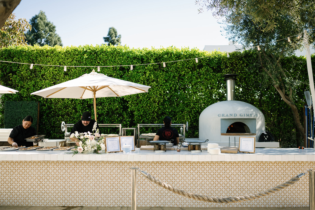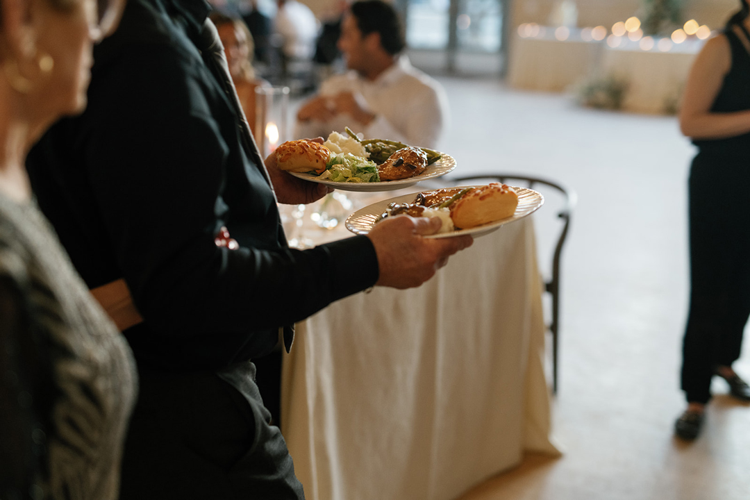 Filet and Wild Mushroom Wellingtons and Crab Cakes made their rounds while Wood-Fired Neapolitan and Classic BBQ Chicken Pizzas were cut and served fresh. Bartenders served signature Whiskey Sour and Coconut Mai Tai cocktails at the bar and a Cheese Tray and Fruit Tray were also available to snack on. Guests mixed and mingled while the newlyweds snuck away for golden hour photos, and upon their return it was time to head inside for the reception.
