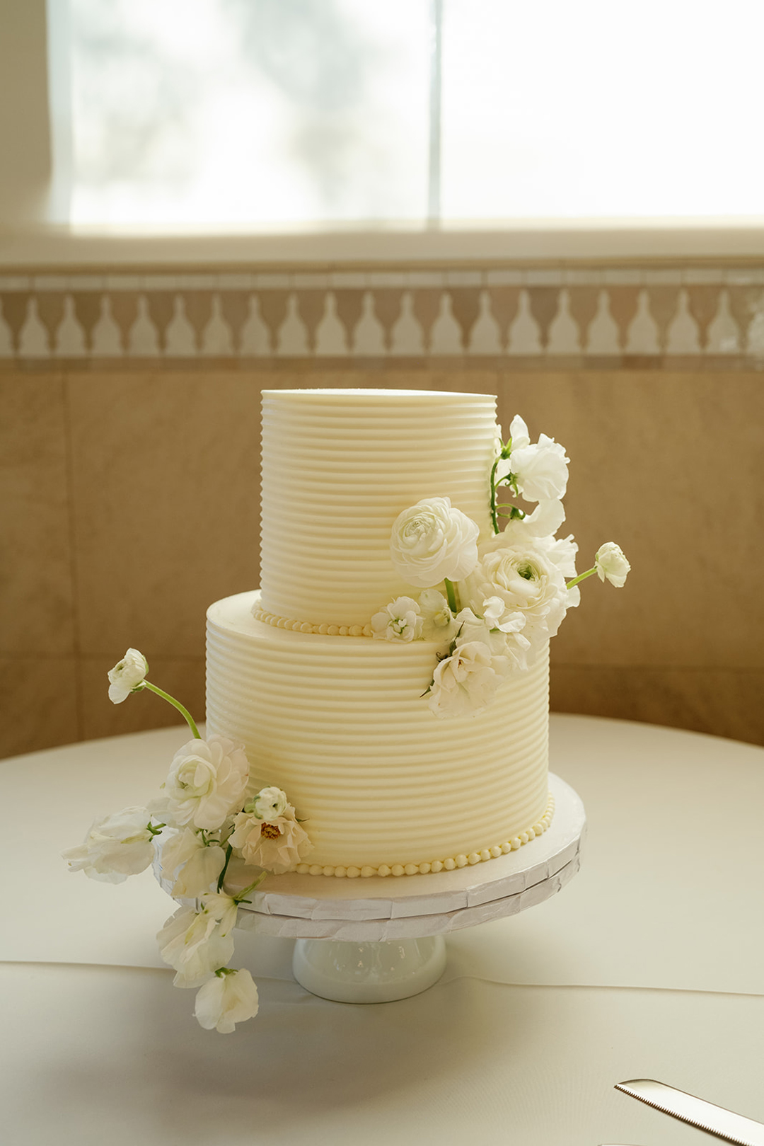 Tables were topped with floral-filled bud vases, pink candles, and light blue accents. Cassie and Michael made their grand entrance and took a seat at their sweetheart table. Chicken Marsala, Cabernet Braised Short Ribs, Roasted Atlantic Salmon, Mashed Potatoes, Green Beans, and Caesar Salad were served while toasts were shared. The dinner menu was selected by the bride and groom with help from our event specialist, Lauren. After dinner the couple shared their first dance and cut into our Cake Comb design cake that had two tiers. The top tier was white cake with strawberry creme filling, and the bottom was carrot cake with cream cheese filling. The evening ended with everyone out on the dance floor showing off their best moves, and a celebratory send off for the bride and groom.