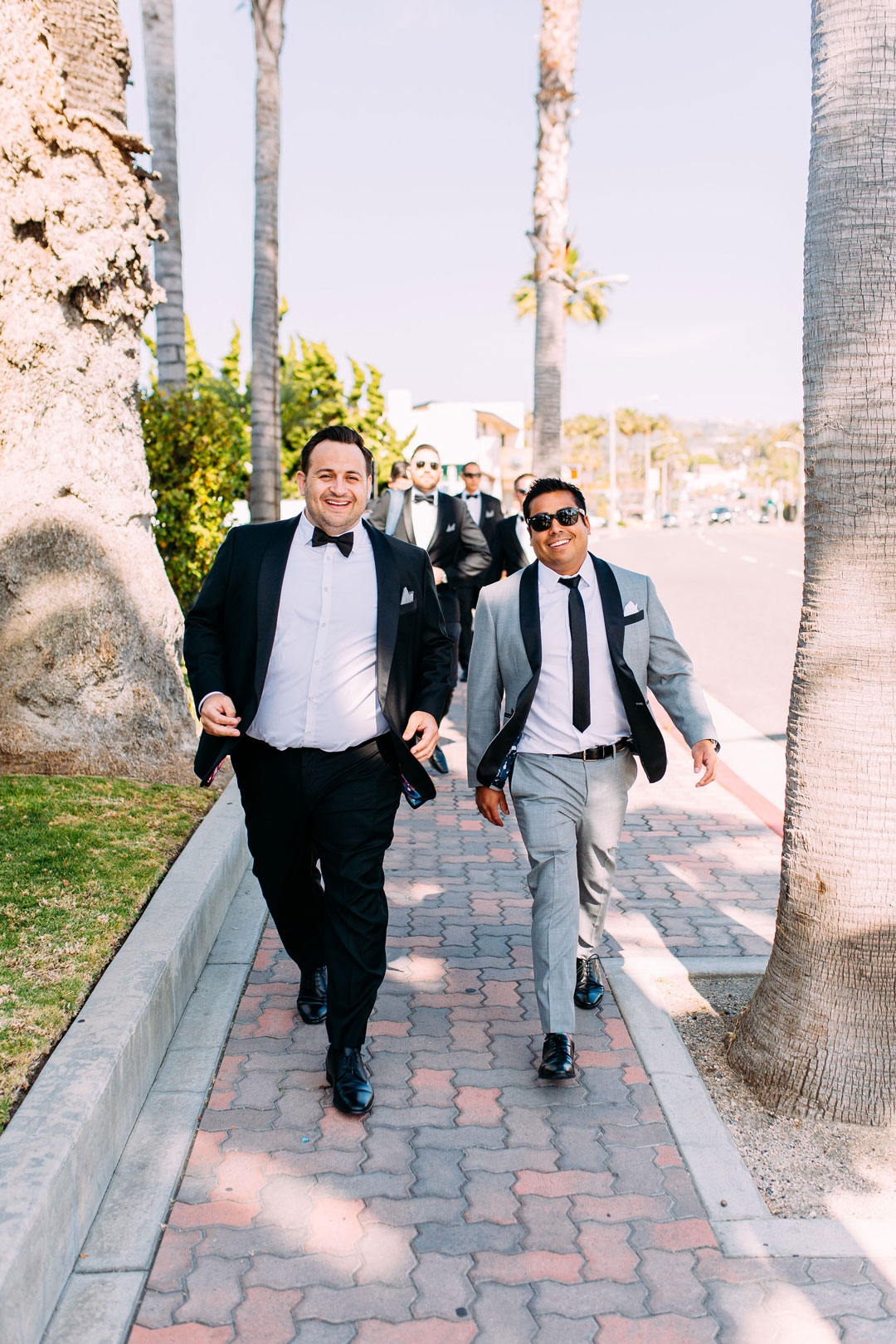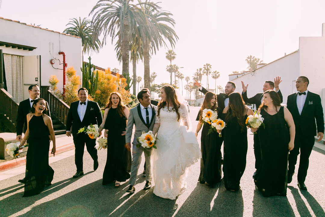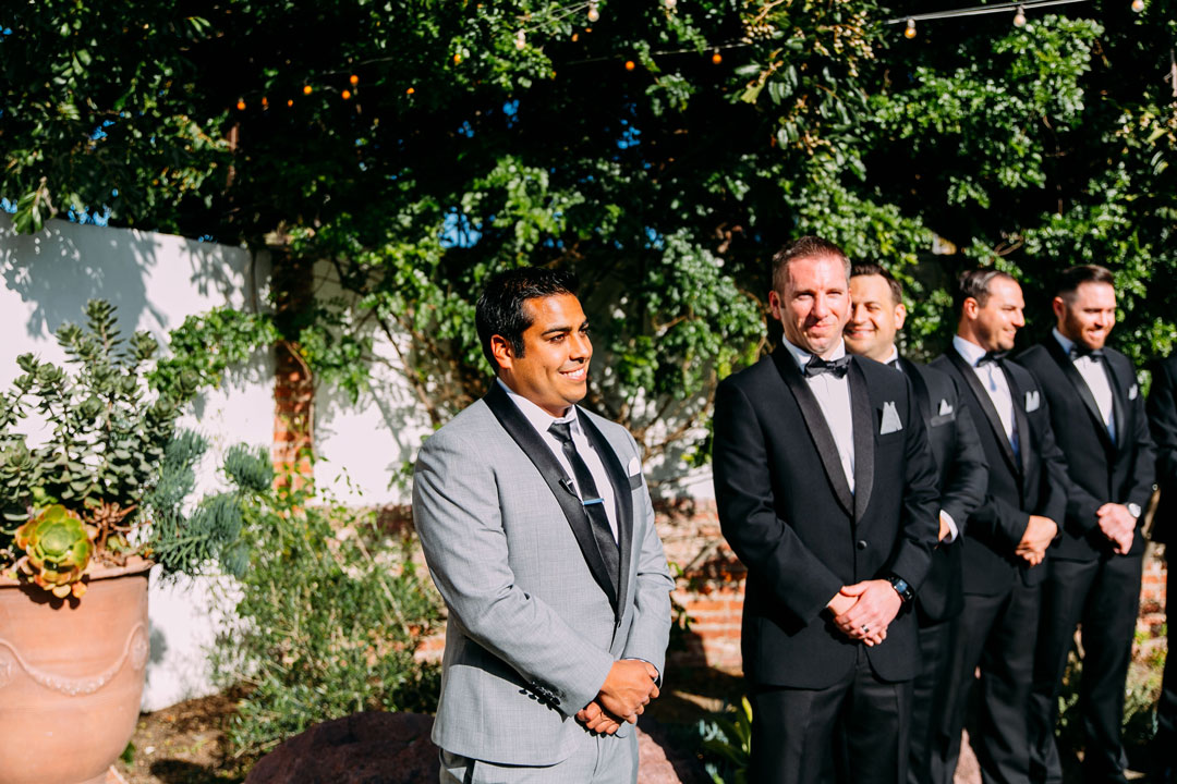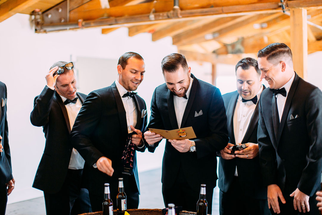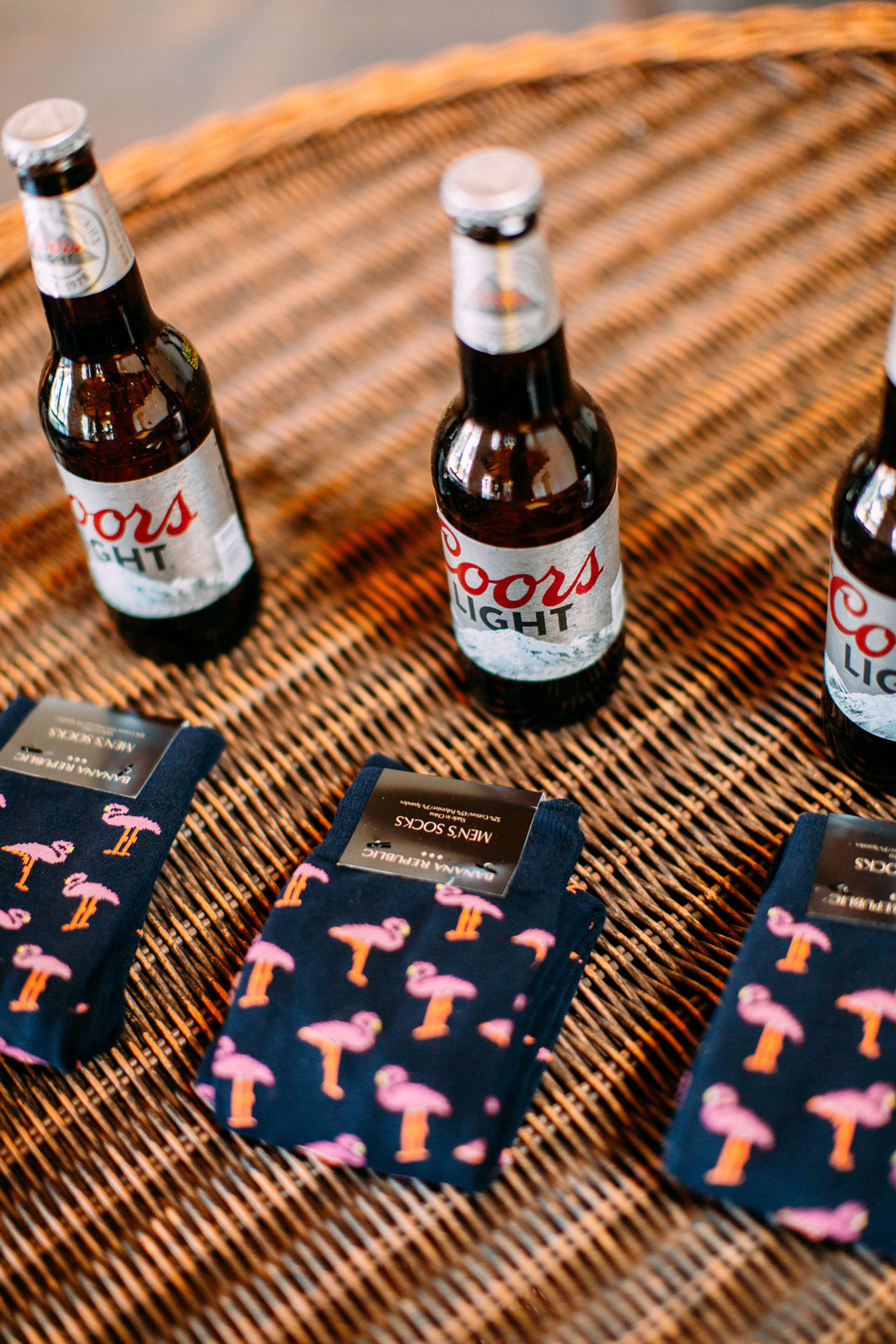 While the boys were cracking open cold beers at the local bar, Amelia, her bridesmaids and her family took some time before the wedding ceremony to take photos. One of the sweetest moments was when she shared a teary-eyed first look with her father. While Amelia was wrapping up some final photo moments, Paul and his groomsmen made their way to The Casino San Clemente where they found gifts from the bride. She got each of them a beer and a pair of trendy flamingo socks with a festive Cinco de Mayo card as it was the theme of their wedding.