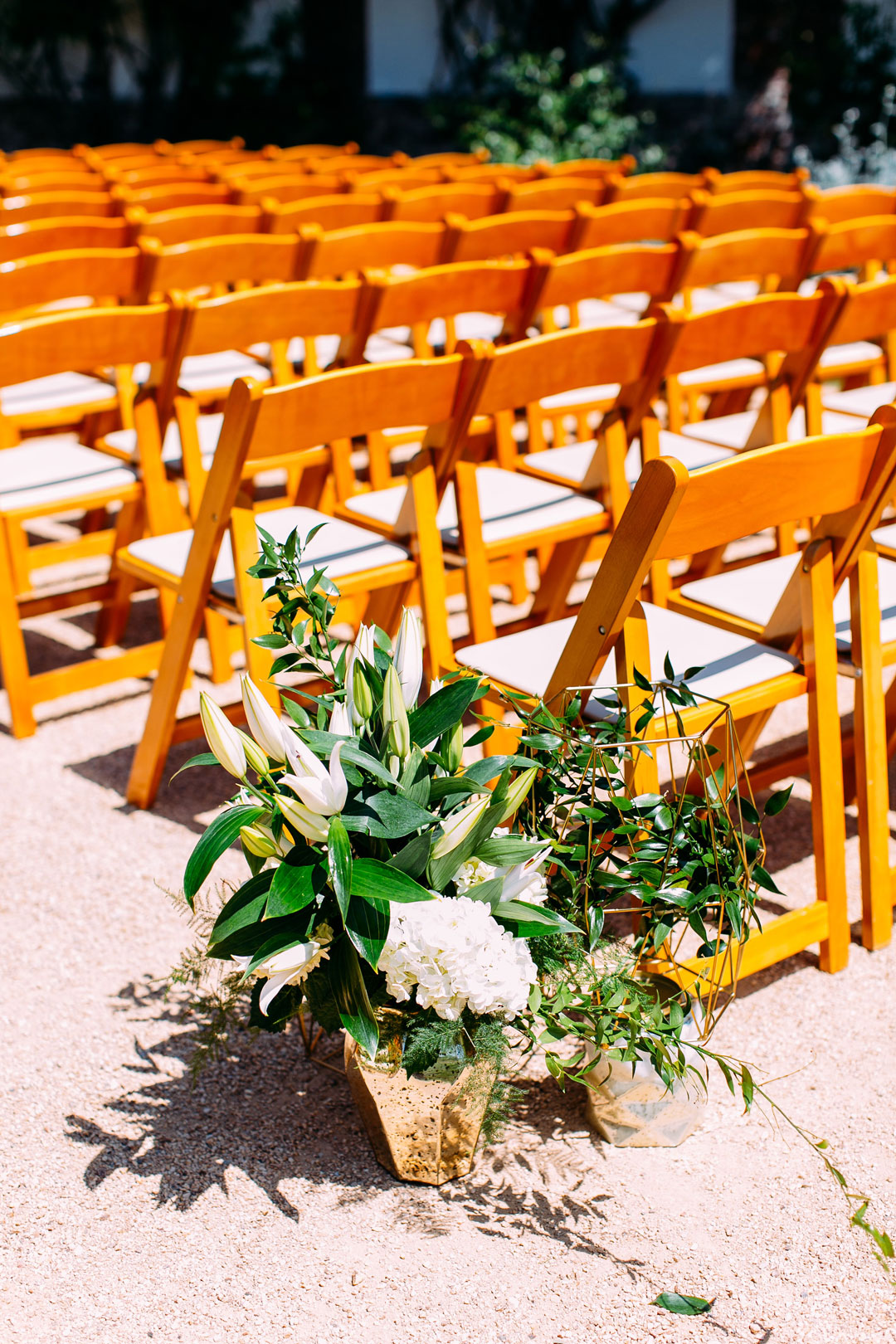 Greenery and white flowers decorated the mantle of the outdoor ceremony space for Amelia and Paul’s wedding. Touches of gold marked the back of the aisle where more greenery, white lilies and hydrangeas sat in vases. Guests took a seat as the wedding party made their way down the aisle. Paul walked arm-in-arm with his mother to the altar where he awaited his beautiful bride. Amelia made a glowing entrance with her father and all the guests stood while she gracefully walked towards her groom. The two exchanged vows and ended the ceremony with “I do.”