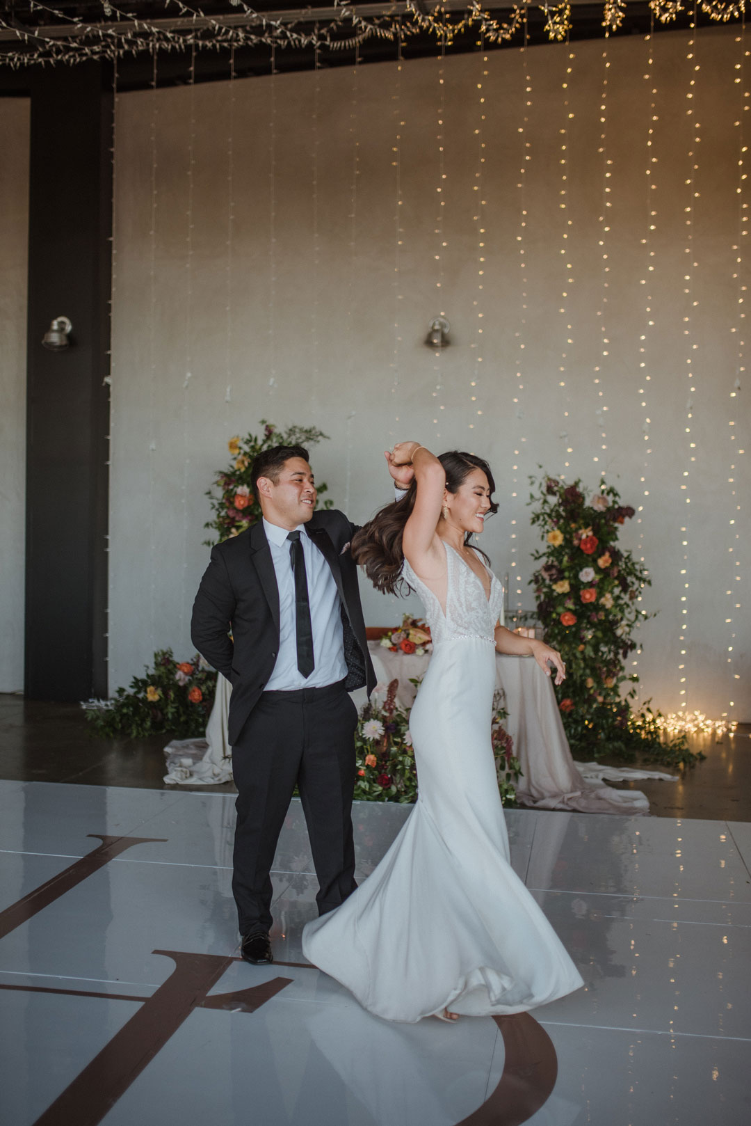 While Lily and Ryan were out and about taking pictures as husband and wife, guests got to enjoy cocktail hour. Thai Vegetable Spring Rolls and Crab Cakes were tray passed and the bar was serving up wine, beer, and refreshing cocktails. A Pineapple Margarita and Whiskey Sour were the newlyweds drink of choice and many guests indulged in the signature cocktails before heading inside to find their seats for dinner. The bride and groom landed from their flight and entered into the hangar for their first dance in front of family and friends. Tables were draped in grey linens and orange, pink, tan, and mustard flowers were perfectly arranged in vases adding pops of color into the industrial space. Lights were strung above the dance floor creating a romantic atmosphere and greenery hung on either side. Toasts were made in honor of Lily and Ryan, then dinner was served. The menu was decided on by the bride and groom with help from our Event Specialist, Brittany. Sliced Beef Brisket, Huli Huli Chicken, Pineapple Fried Rice, Far East Wok Long Beans, and Hawaiian Sweet Rolls filled plates as guests made their way through the buffet line. A lemon cake and chocolate cake were cut and served after dinner for those with a sweet tooth and the evening ended with everyone out on the dance floor.