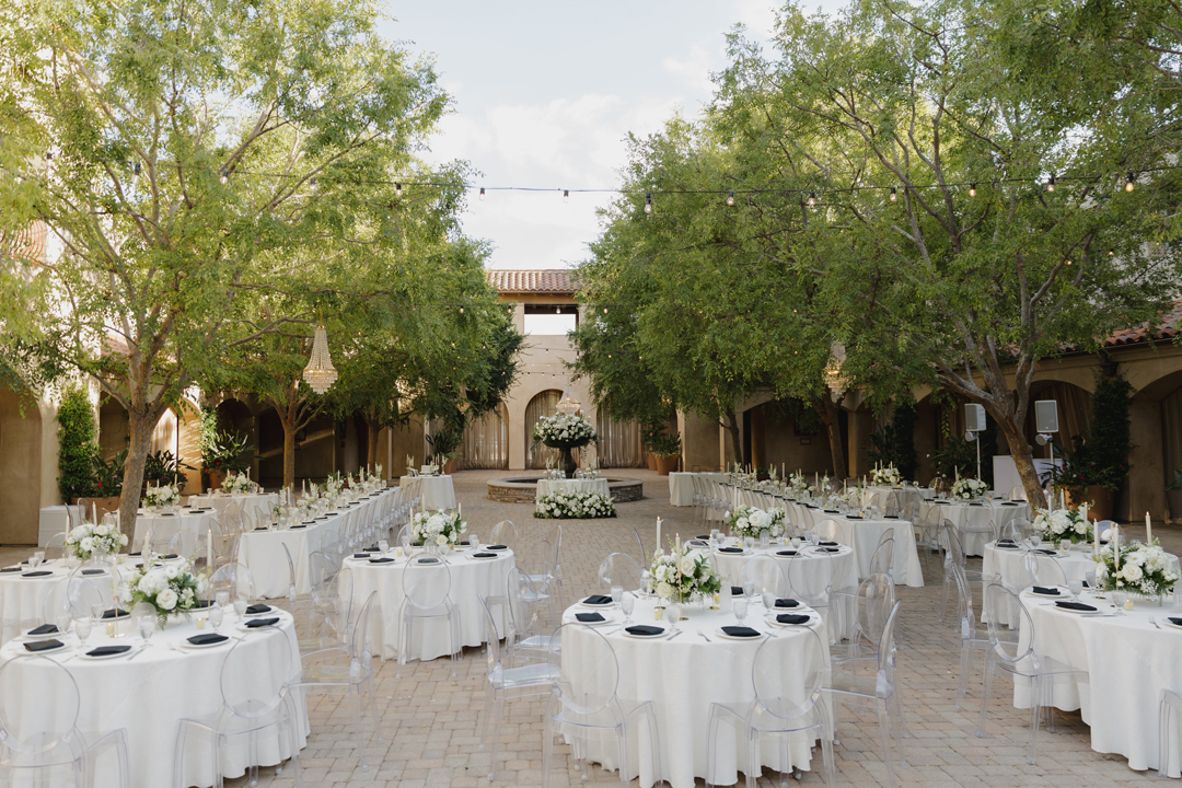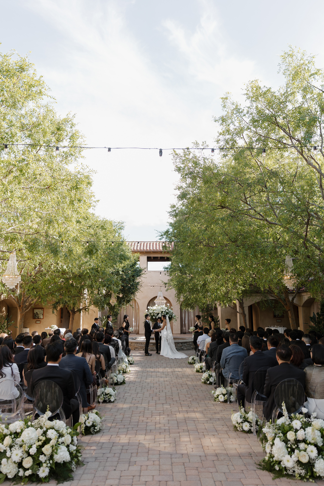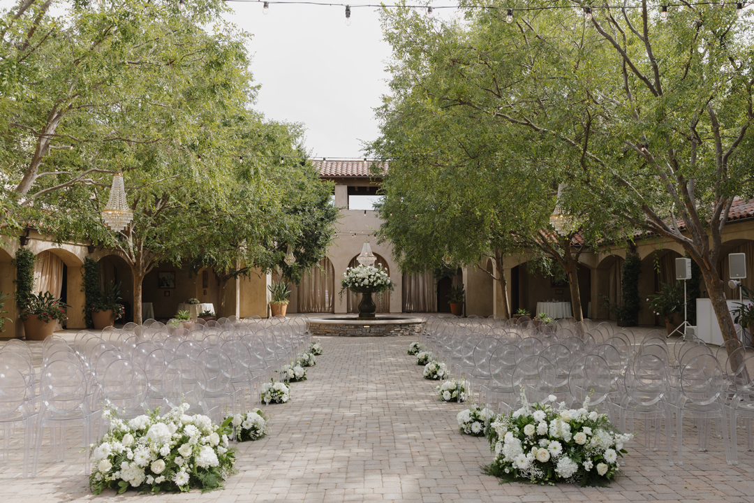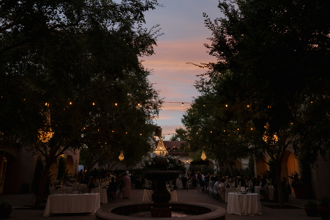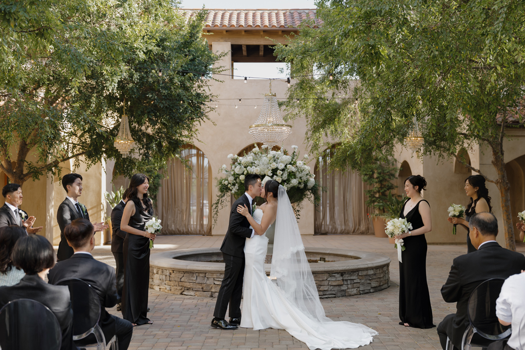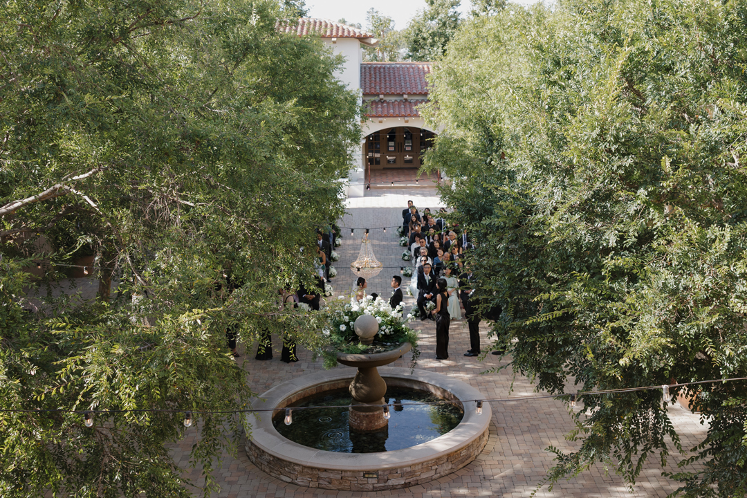 Greenery and white flowers lined the aisle and decorated the Spanish fountain backdrop. Guests signed the bride and groom’s guest book and found a seat in the Courtyard ready for the ceremony to begin. The music cued up and the wedding party made their entrances. In front of all their closest friends and family, Kaitlin and David read handwritten vows, exchanged rings, and sealed the ceremony with a kiss.