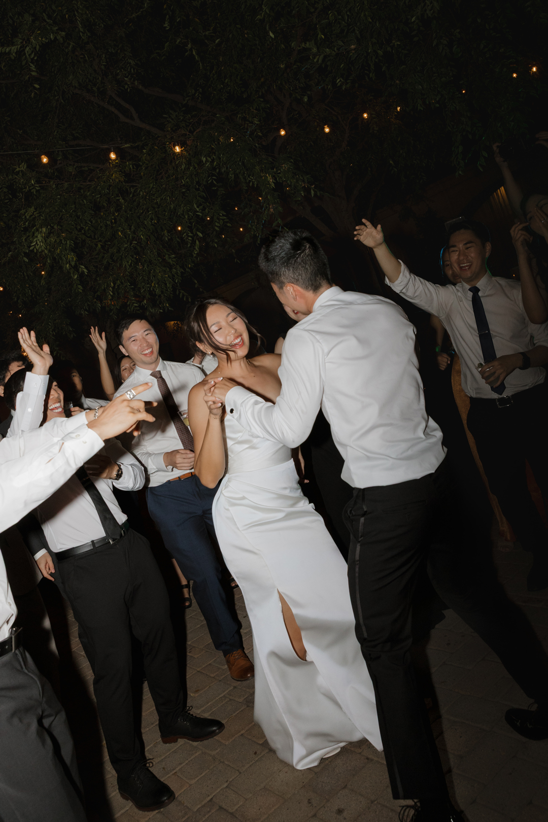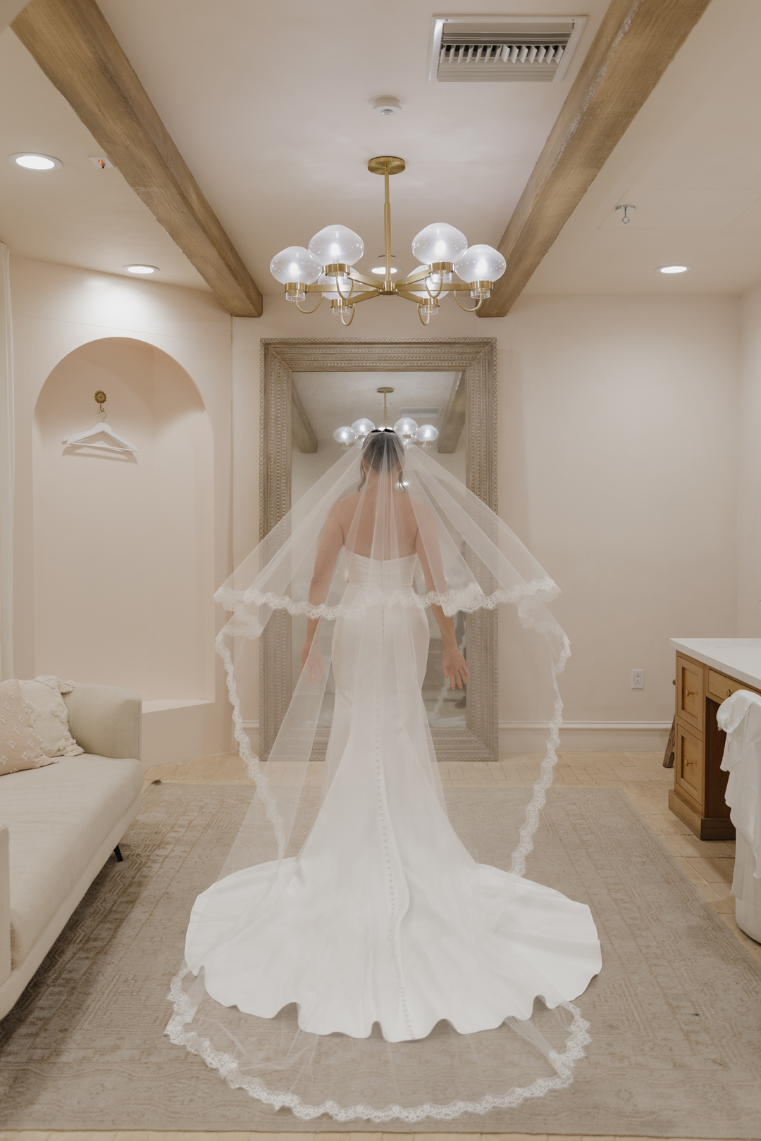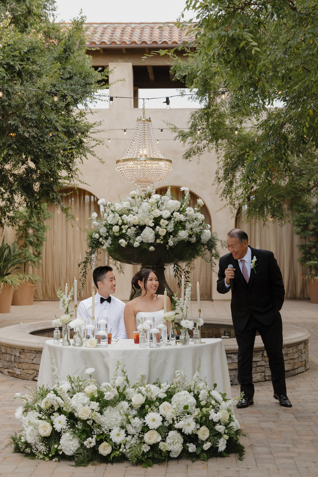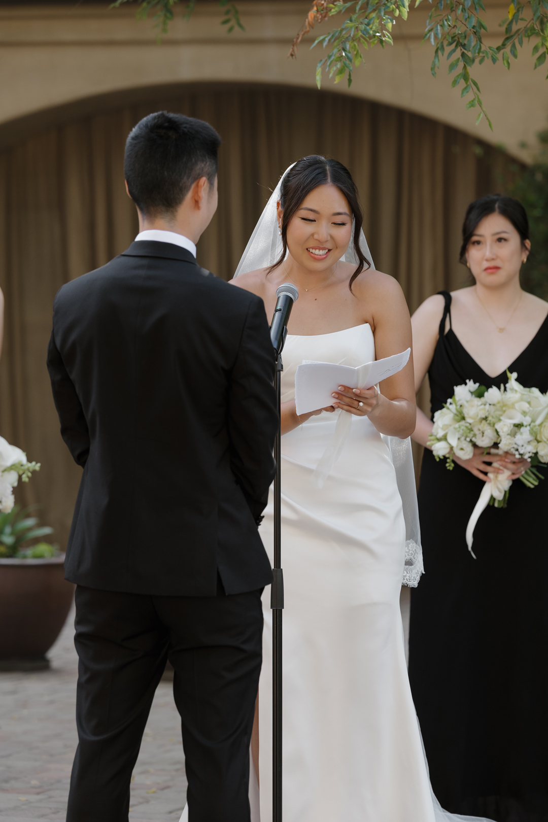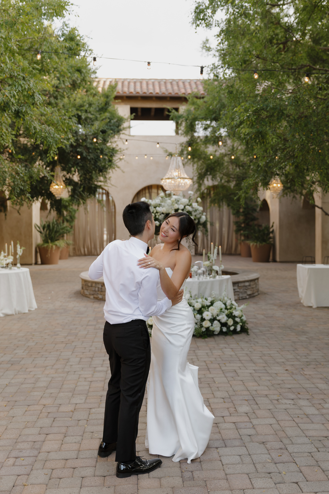 Greenery and white flowers lined the aisle and decorated the Spanish fountain backdrop. Guests signed the bride and groom’s guest book and found a seat in the Courtyard ready for the ceremony to begin. The music cued up and the wedding party made their entrances. In front of all their closest friends and family, Kaitlin and David read handwritten vows, exchanged rings, and sealed the ceremony with a kiss.