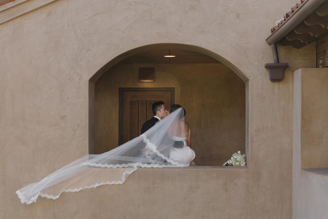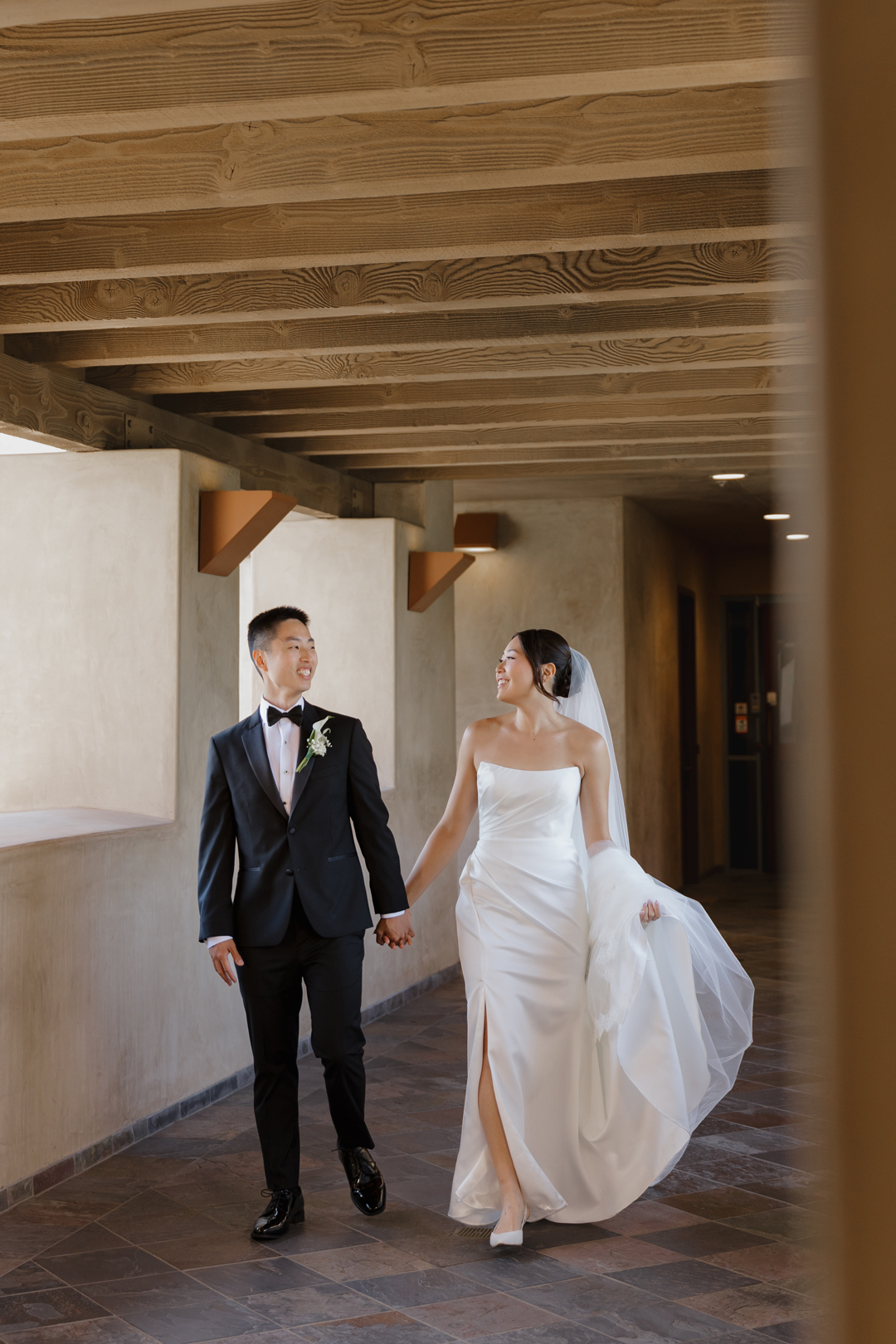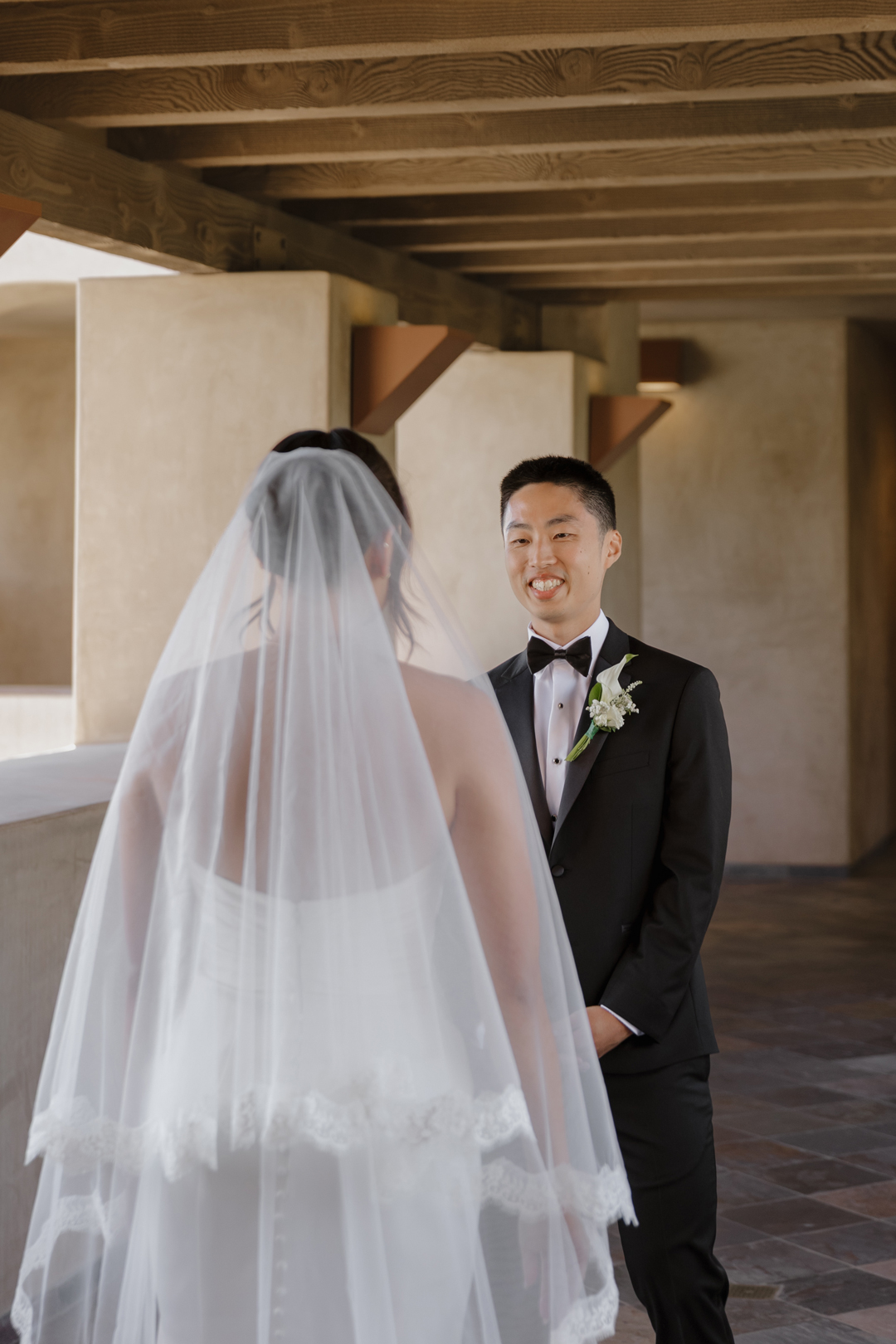A tap on the shoulder turned David around to see his beautiful bride, Kaitlin, standing before him in the upstairs Serra Plaza breezeway. Smiles filled their faces as soon as their eyes met and sweet compliments were exchanged as their photographer snapped away. After the intimate moment, the couple joined their bridesmaids and groomsmen in the Courtyard for group photos, then they all lined up for the ceremony.