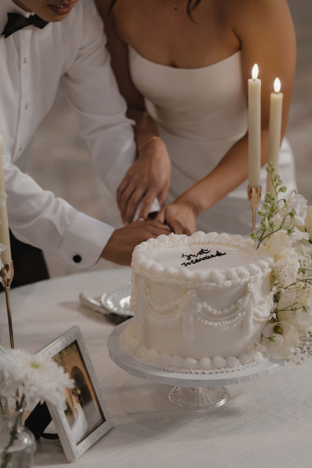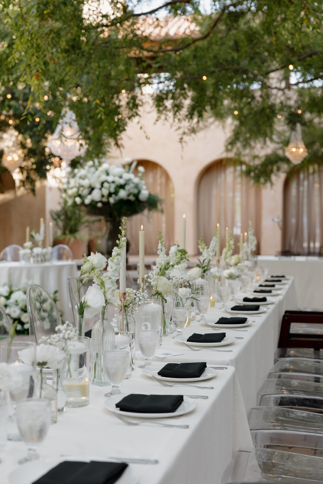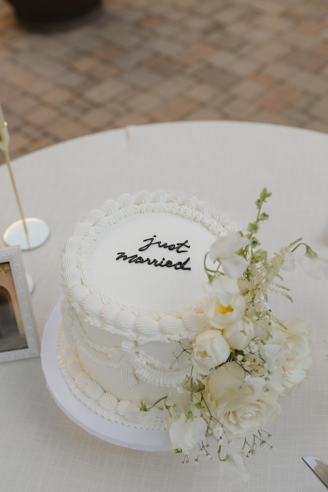 Back in the Courtyard, tables were topped with fresh floral centerpieces and pops of black. David and Kaitlin made their grand entrance, shared their first dance, then took a seat at their sweetheart table. Toasts were shared and Zucchini Lime Chicken, Cabernet Braised Short Ribs, Vegetarian Rotolo Bolzano, Almond Rice Pilaf, Fresh Vegetable Medley, and Pear and Walnut Salad was served. The dinner menu was selected by the bride and groom with help from our event specialist, Brittany. After dinner the couple cut into our Vintage design wedding cake and invited their guests to indulge in our Classic Dessert Station with a collection of Raspberry Chocolate Decadence Cakes, Fresh Fruit Tarts, Vanilla Bean and Chocolate Eclairs, Mango and Passion Fruit Macarons, and French Apple Tarts. The evening ended with everyone out on the dance floor showing off their best moves and sharing their well wishes with the couple.