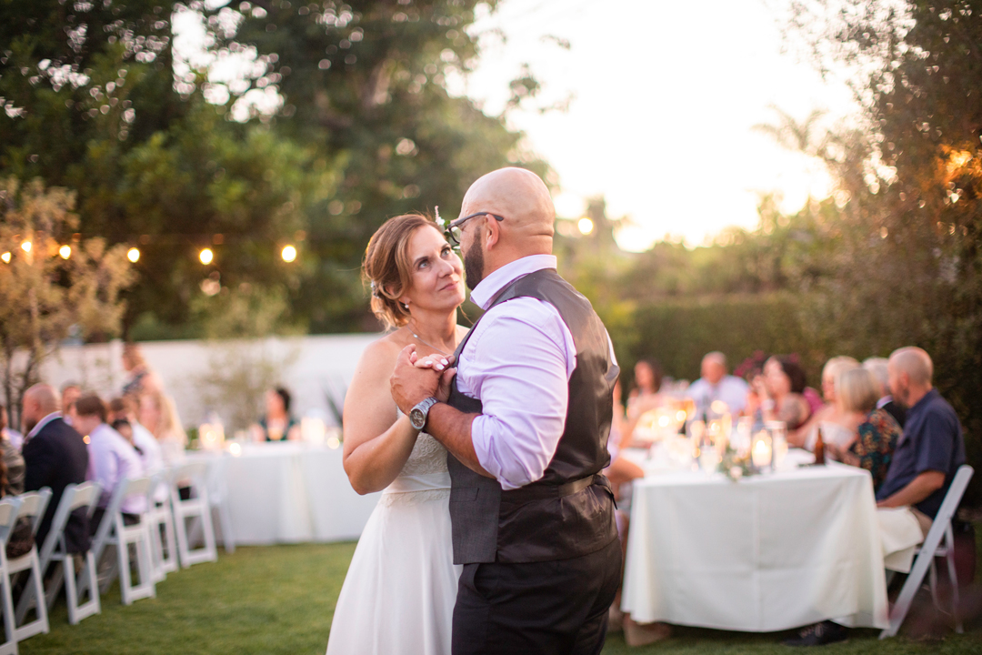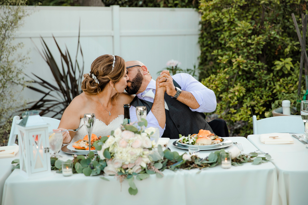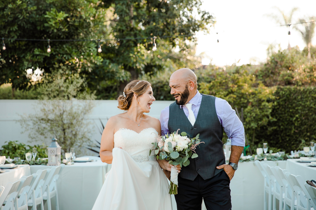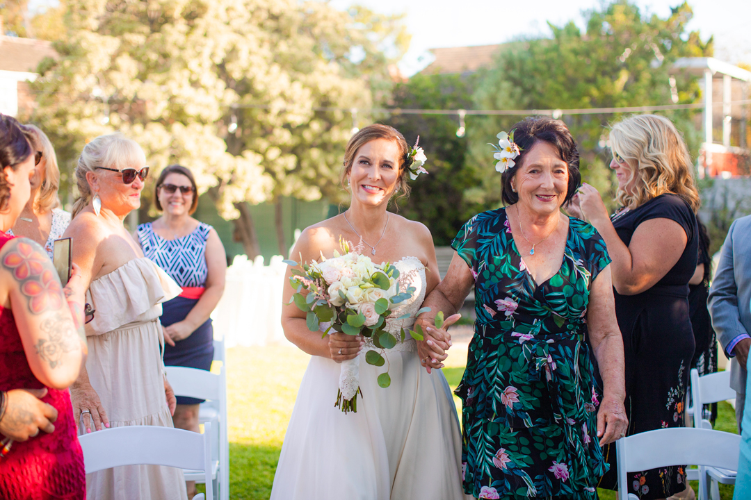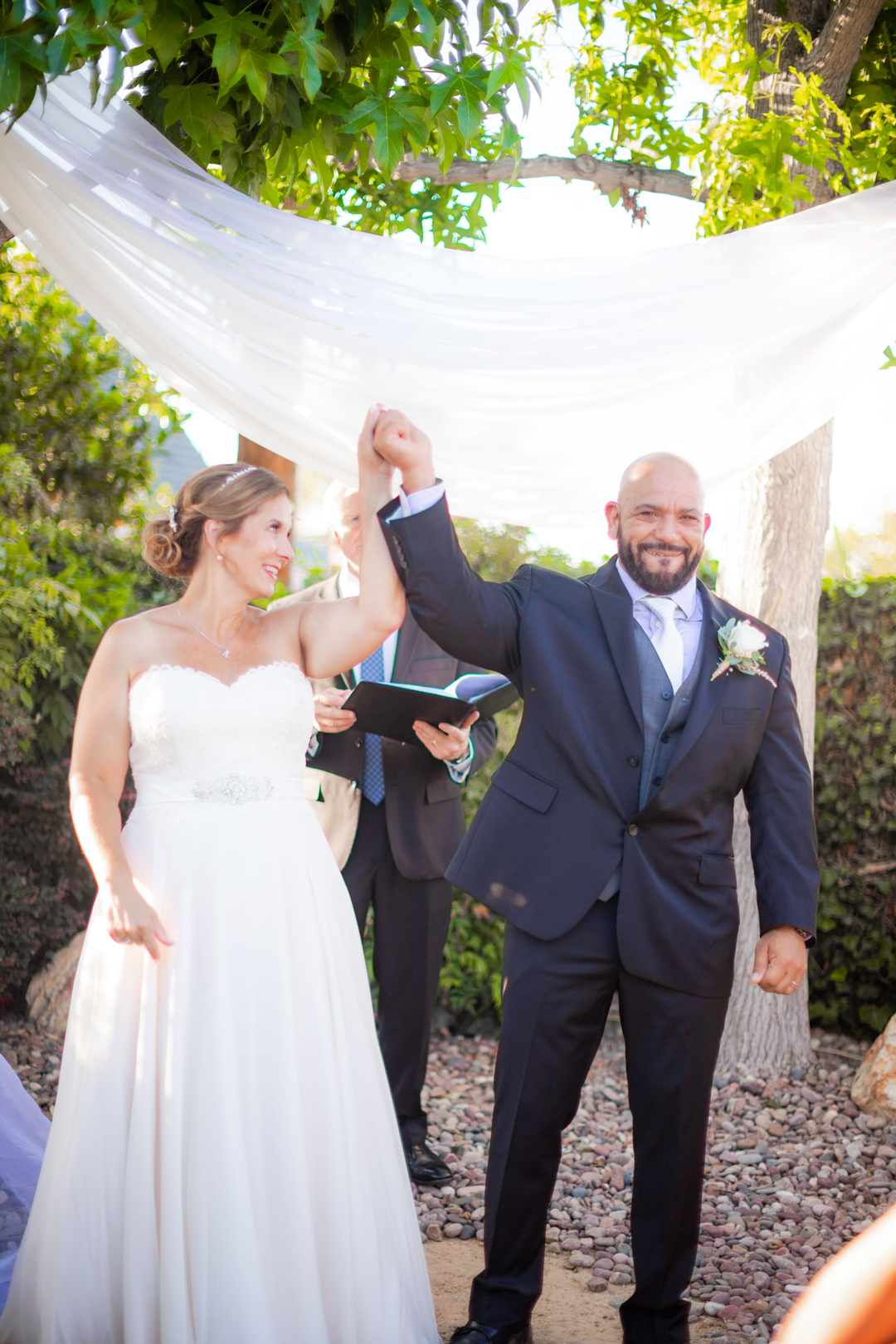 It was a backyard wedding to remember. Mary had just slipped into her strapless wedding gown with delicate lace covering the bodice and a sparkling belt to match her jewelry and hair accessories while her groom anxiously waited for their ceremony to begin. Ivory chiffon was draped from two tall trees to mark where the bride and groom would say I do and bulb lights hung above guests heads as they entered the backyard and signed Mary and Johnny’s guest book, leaving their marriage advice and best wishes. Everyone took a seat and the bride walked down the aisle arm in arm with her mother while Johnny tried to keep himself from shedding a tear. Both Mary and Johnny wrote and read sweet handwritten vows, exchanged rings, and were pronounced husband and wife. The newlyweds shared a kiss and gleefully walked out of the ceremony as guests cheered them on.