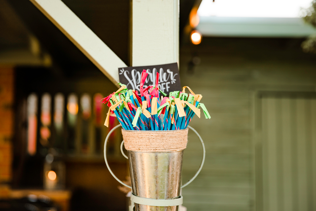 After snacking on Caprese Skewers and Filet and Wild Mushroom Wellingtons, everyone found their seats and dinner was served. Chicken Pignoli, Red Roasted Garlic Potatoes, Fresh Vegetable Medley, Mixed Green Salad, and Vegetarian Rotolo Bolzano was plentiful and guests raved over the delicious flavors. Toasts were made celebrating the happy couple and lively conversation filled the evening. The bride and groom shared their first dance which then led to family and friends joining in. For dessert, a two-tiered wedding cake was cut and shared before the newlyweds were sent off with sparklers into the night.