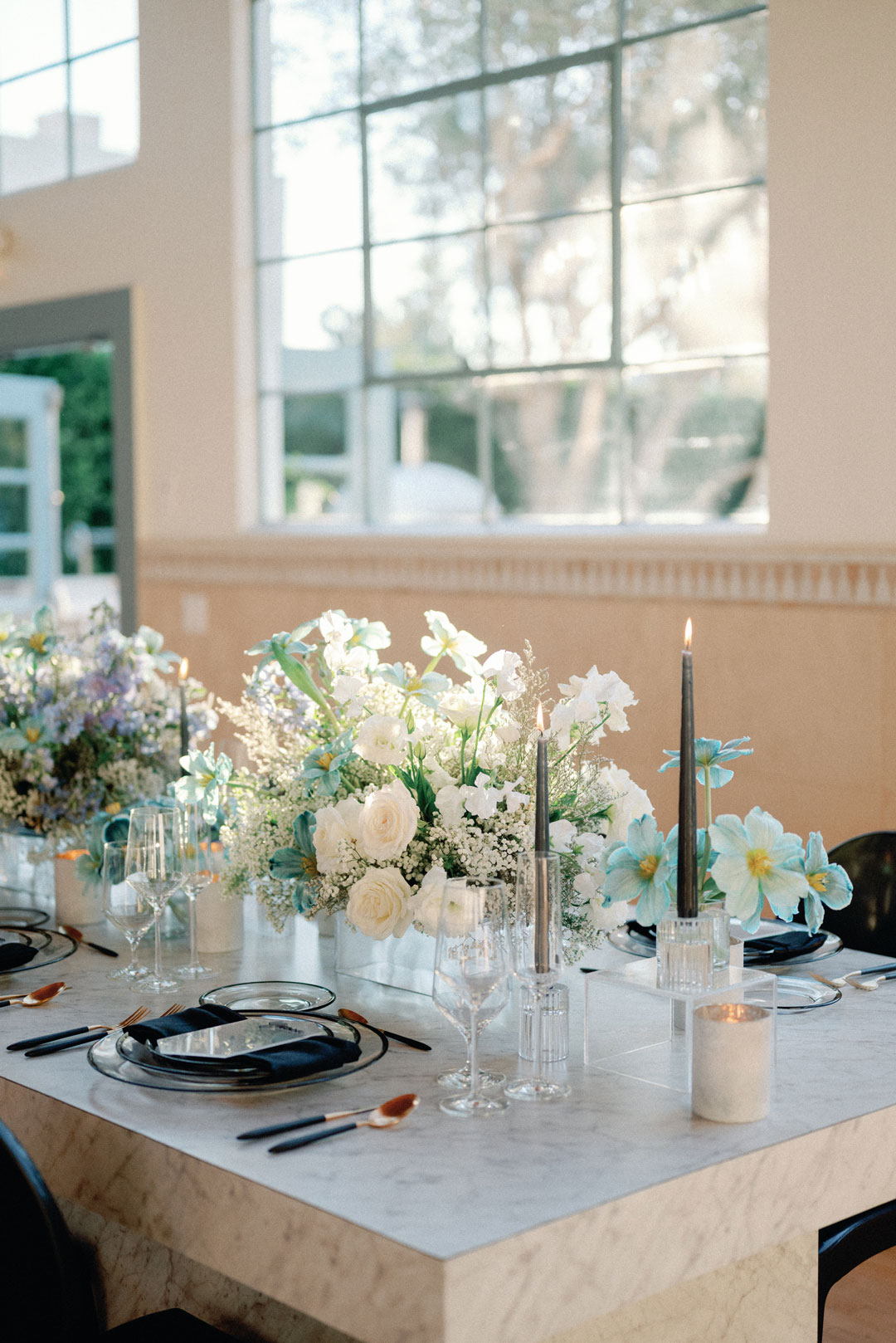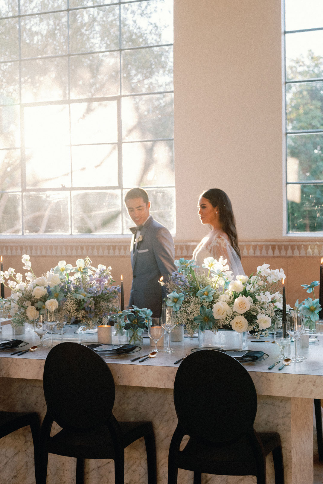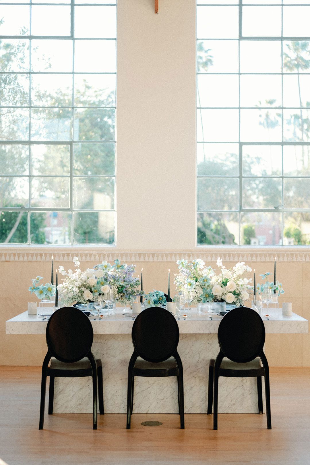 Through wrought iron gates and under tall archways Grand Gimeno was transformed into an ethereal masterpiece that resembled something out of a fairy tale. Whimsical floral installs in vibrant colors decorated spaces both inside and outside the venue and modern design details tied everything together with black and clear acrylic accents. From champagne towers and a magical dessert display to pops of blue and a flower petal exit, this styled shoot might just be the prized glass slipper.