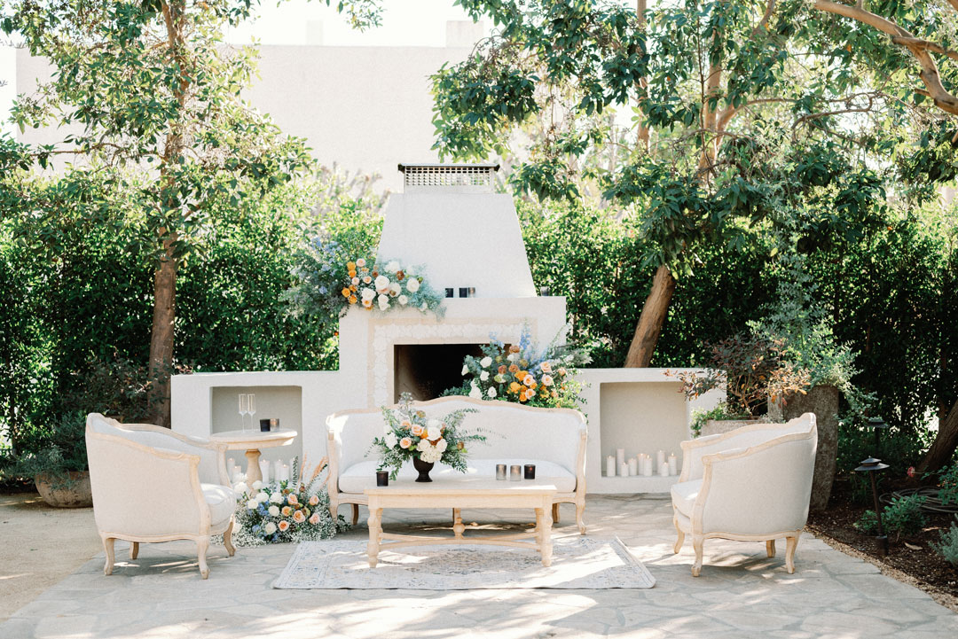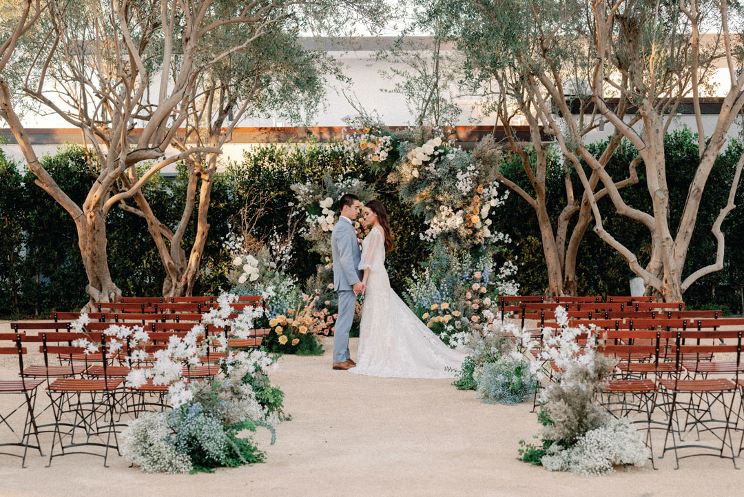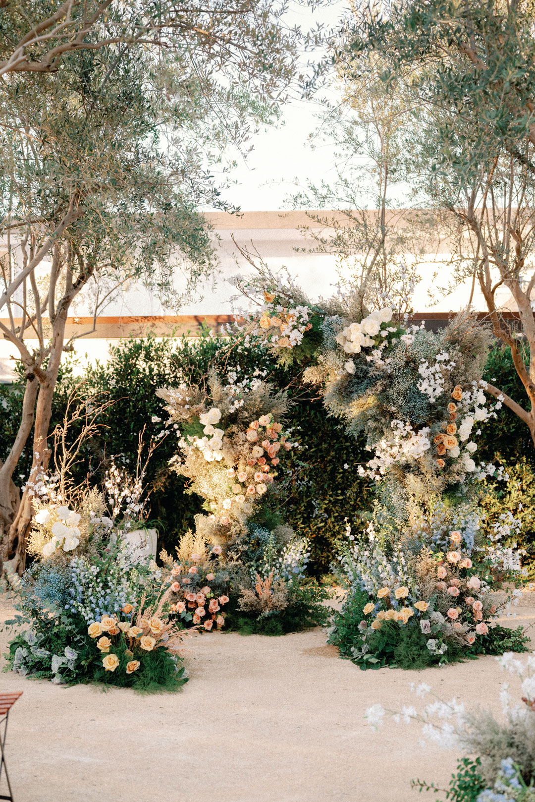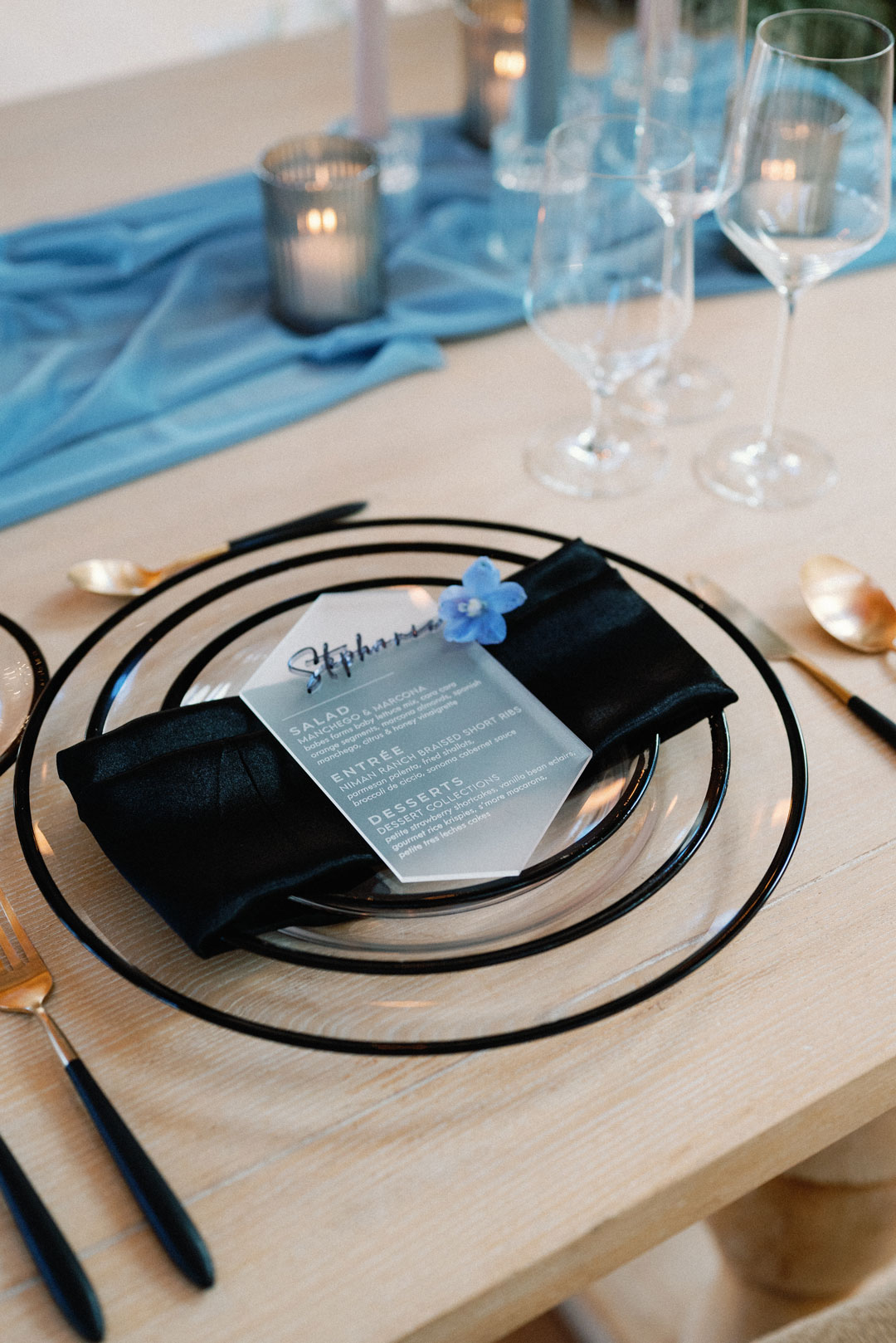 Through wrought iron gates and under tall archways Grand Gimeno was transformed into an ethereal masterpiece that resembled something out of a fairy tale. Whimsical floral installs in vibrant colors decorated spaces both inside and outside the venue and modern design details tied everything together with black and clear acrylic accents. From champagne towers and a magical dessert display to pops of blue and a flower petal exit, this styled shoot might just be the prized glass slipper.
