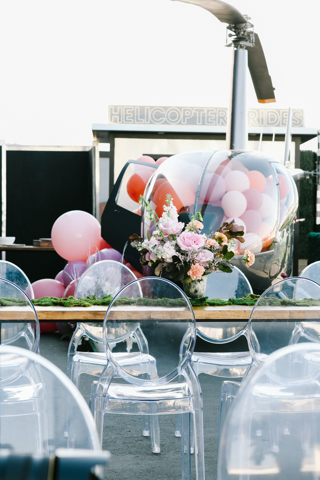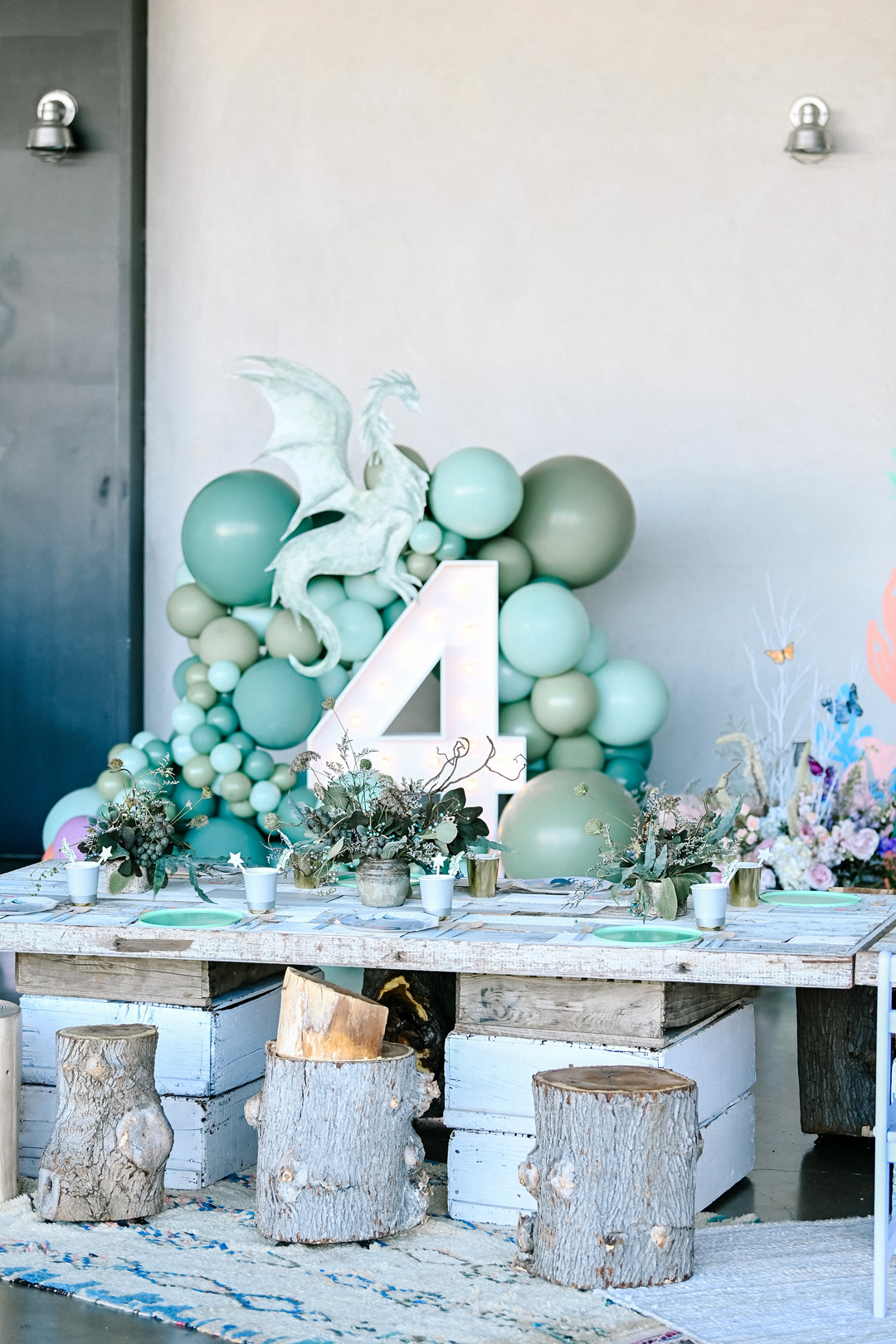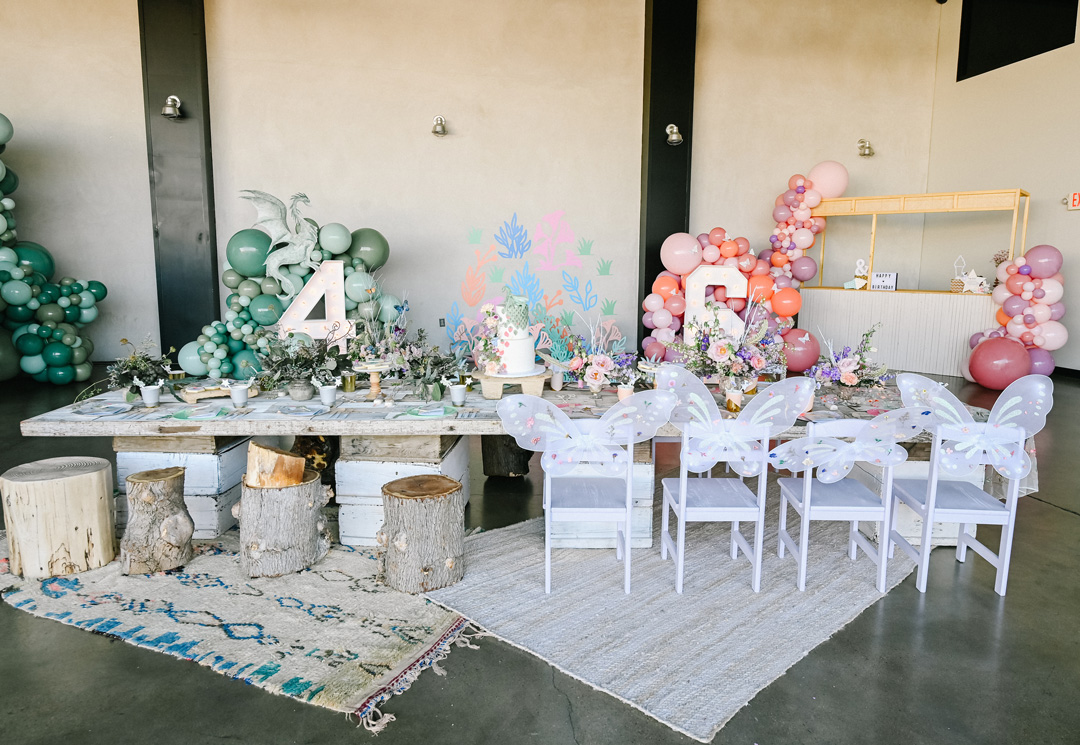 Walking into Emma and Emery’s Hangar 21 South birthday party was like walking into your favorite fairytale! Butterflies and dragons were everywhere and colorful balloons decorated a bounce house, photo wall, and our helicopter. Vibrant flowers in green, pink, orange, purple and blue filled vases at the kids tables and a huge ball pit was set up in the center of the venue. A long table inside was split in two, one side for Emery and his friends and the other for Emma and hers. Emery’s side of the table had tree stump chairs, dragon stir sticks inside silver cups, and green plates while Emma’s side had flower stir sticks inside pink cups, fairy plates, mushroom napkins, and fairy wings on the back of each chair. As soon as everything was set, friends began to arrive.