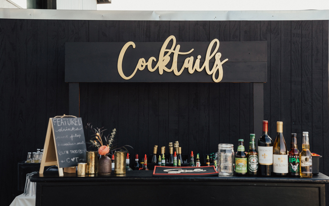 Cocktail hour was on the tarmac just as the sun was setting. The bar was serving up wine, beer and cocktails along with the newlyweds signature drinks: A Hawaiian Mule and Mint Julep. Delicious hors d’oeuvres like Filet & Wild Mushroom Wellington, Crab Cakes, and Caprese Skewers with Pesto were made available to hungry guests while Catherine and Taylor went on their flight over Orange County. Upon their return, the two shared their first dance just outside the main hangar’s doors and just as their dance came to a close, the hangar doors opened revealing a beautifully setup reception. Tables were topped with stoneware plates, gold flatware and gold rimmed glasses. The same orange and mustard colored flowers found in the ceremony were incorporated as centerpieces at each table, above the dancing area, and repurposed at the sweetheart table. Brittany, our Jay’s Catering Event Specialist, helped the couple select their dinner menu of Grilled Halibut with Lemon Beurre Blanc, Fliet Mignon with Tuscan Compound Butter and Fresh Herbs, Roasted Broccolini, Dauphinoise Potatoes, and Strawberry Spinach Salad. Dinner was complimented with joyful toasts before the bride and groom cut their two-tiered wedding cake. A marble cake with cappuccino creme filling and classic buttercream icing was cut and shared between Catherine and Taylor and Italian and French Dessert Collections were set out for guests. An assortment of Tiramisu Cannolis, Cappuccino Cream Puffs, Limoncello Cheesecake Bites, Chocolate Dipped Biscotti, Mini Tiramisu Cupcakes, Lavender Macarons, Raspberry Chocolate Decadence, Lemon Curd Tarts, and Vanilla Bean Chocolate Eclairs filled everyone’s plates ending Catherine and Taylor’s wedding on the sweetest note.