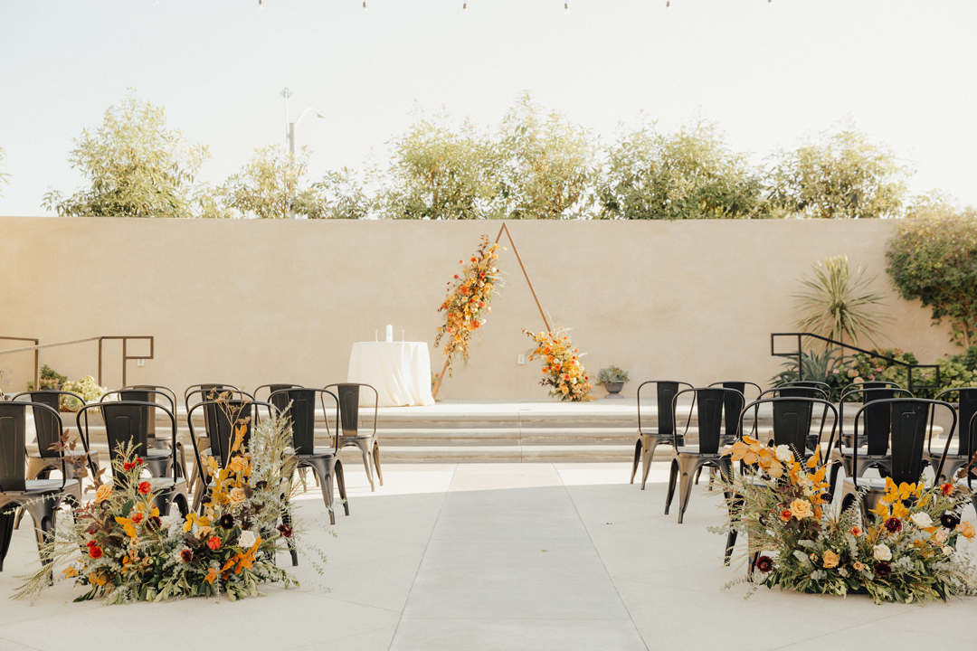 Guests entered into the side patio and took a seat with a view of the stage where Catherine and Taylor would tie the knot. At the center of the stage stood a tall triangular frame decorated in bright red, orange and mustard colored flowers along with a side table and two candles. Behind all the chairs were even more flowers marking the head of the aisle. Before long, music cued up and Taylor, in his navy suit and teal tie, stepped out followed by the groomsmen and bridesmaids in similar shades of blue. Lastly, Catherine made her walk down the aisle. She wore a modern romantic wedding dress with a faint motif that looked like watercolor. The bride and groom recited vows and exchanged rings before sealing the deal with a sweet kiss. Their guests cheered as the two were announced husband and wife.