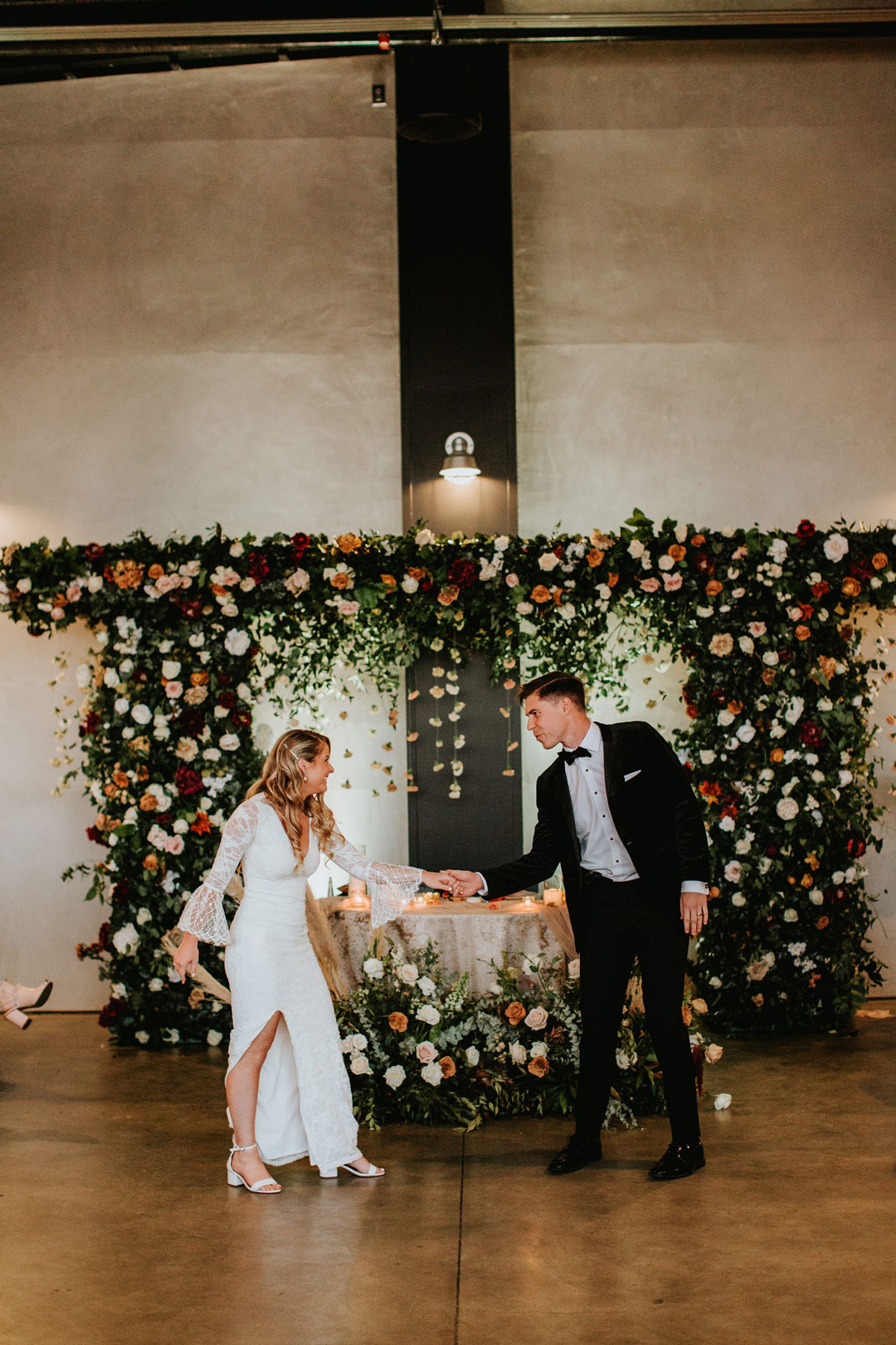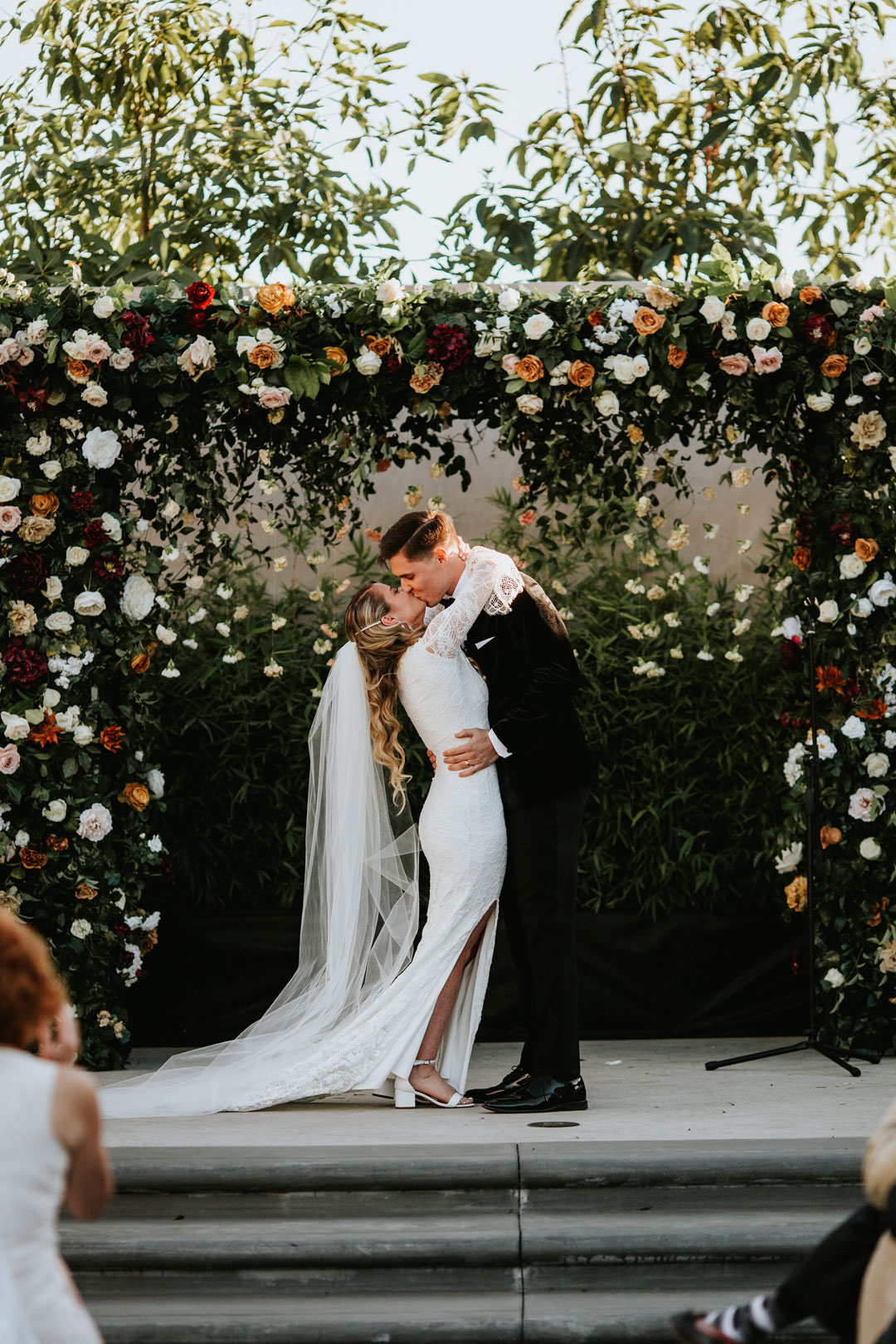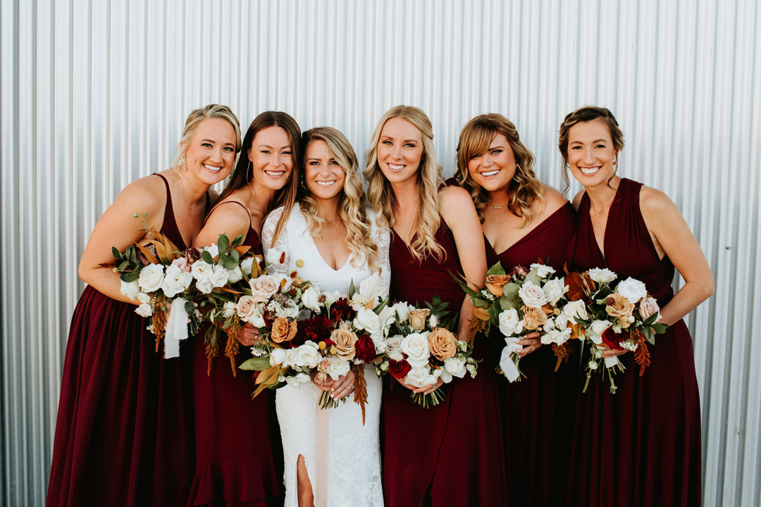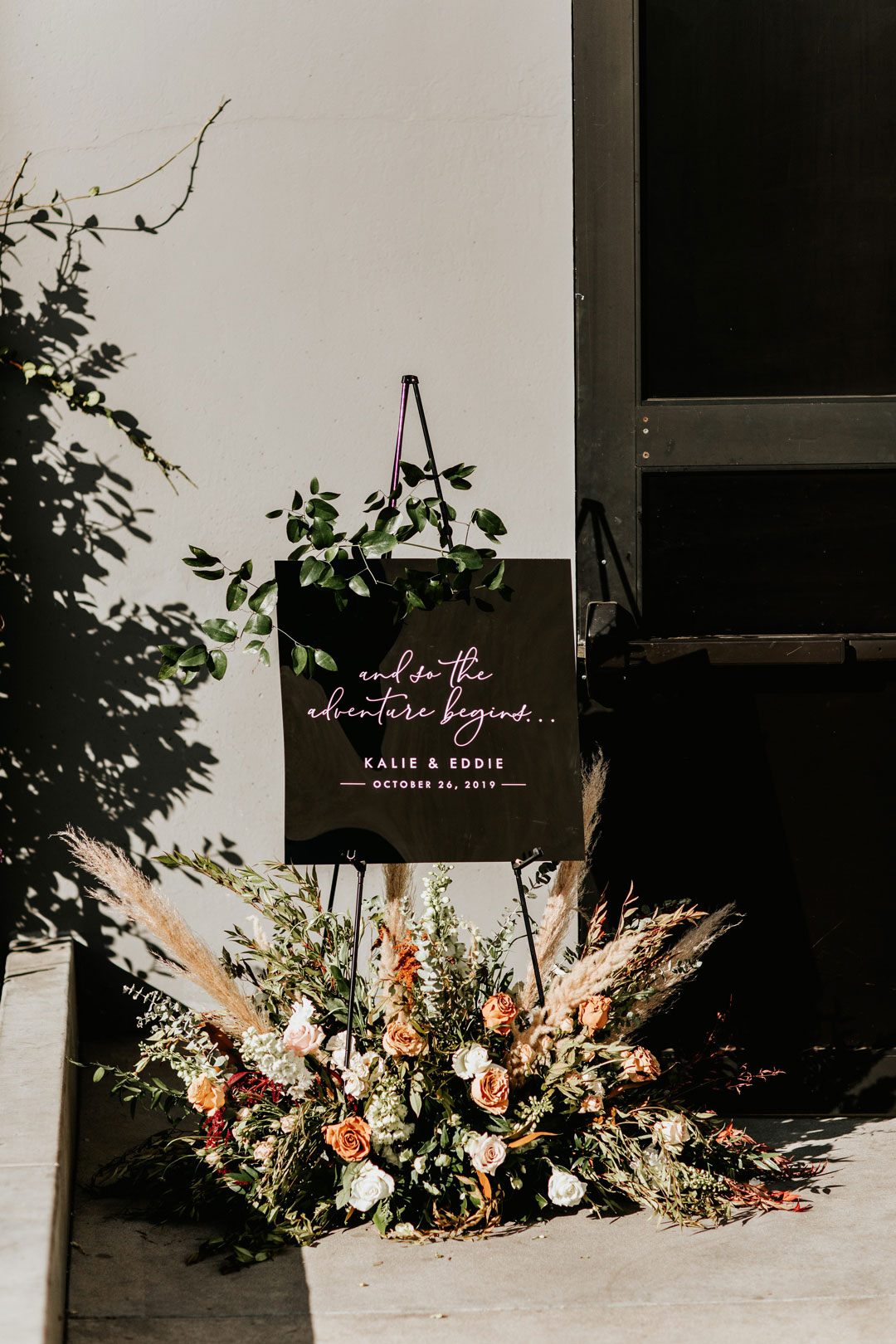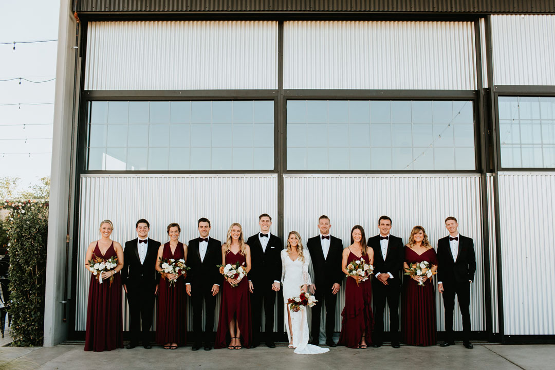A black acrylic welcome sign greeted guests along with refreshingly crisp champagne for Kalie and Eddie’s big day at Hangar 21 South. The unique wedding venue was decorated in pampas grass, white roses, greenery and other rust and maroon colored flowers out in the courtyard where the ceremony was to be held. The bride in her lace, bell sleeve dress met her bridesmaids that were dressed in maroon maxi dresses just in front of the hangar for photos. The groom and groomsmen also met them there for some group shots before getting ready to head down the aisle.