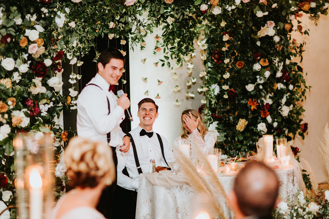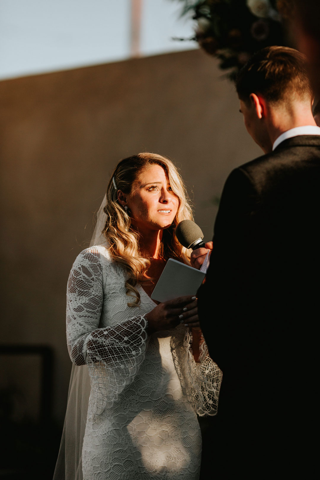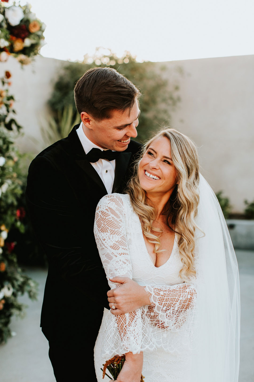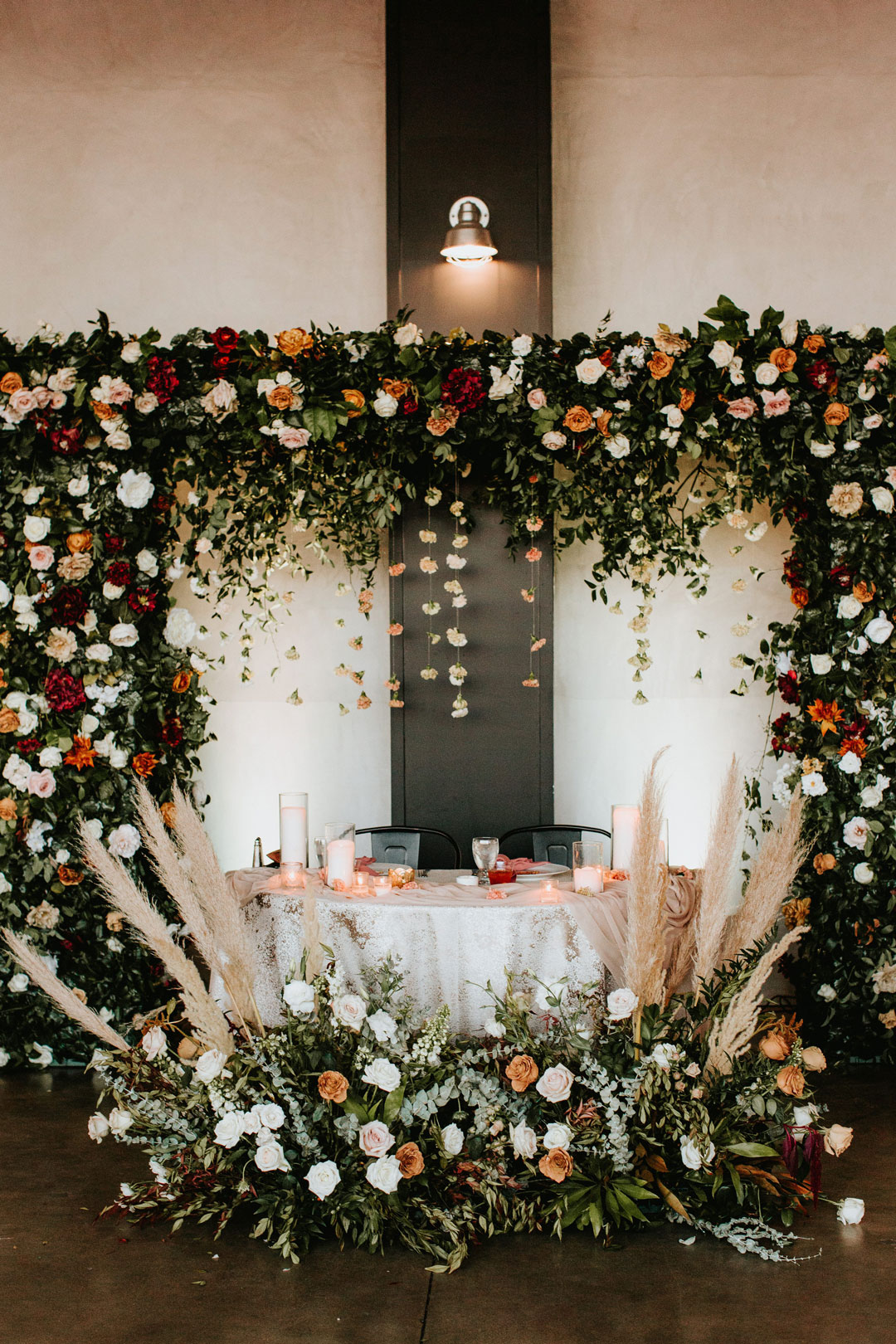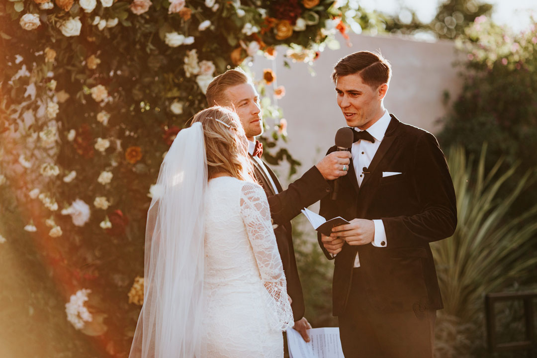 A black acrylic welcome sign greeted guests along with refreshingly crisp champagne for Kalie and Eddie’s big day at Hangar 21 South. The unique wedding venue was decorated in pampas grass, white roses, greenery and other rust and maroon colored flowers out in the courtyard where the ceremony was to be held. The bride in her lace, bell sleeve dress met her bridesmaids that were dressed in maroon maxi dresses just in front of the hangar for photos. The groom and groomsmen also met them there for some group shots before getting ready to head down the aisle.