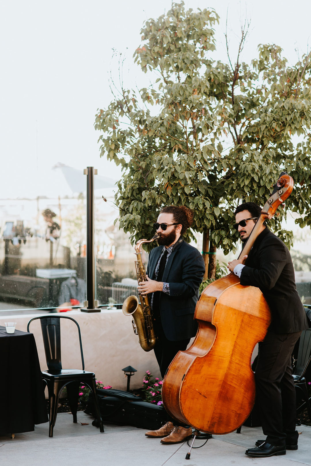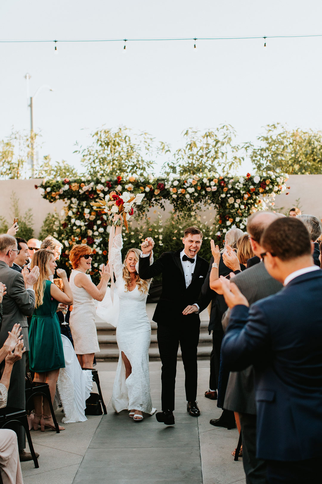 Guests trickled in, grabbed a glass of champagne, and found a seat awaiting the start of the wedding ceremony. Live music cued up and Eddie, followed by the bridesmaids and groomsmen, made their way to center stage. Kalie was last to walk out, arm in arm with her father. Everyone stood and admired the clearly visible love that was written all over her and Eddie’s faces as they locked eyes down the aisle. The sweetest vows were exchanged between the bride and groom who couldn’t wipe the grins off their faces the entire ceremony. Rings were exchanged and a kiss sealed their fate. The newlyweds walked out to cocktail hour beaming as guests cheered them on.