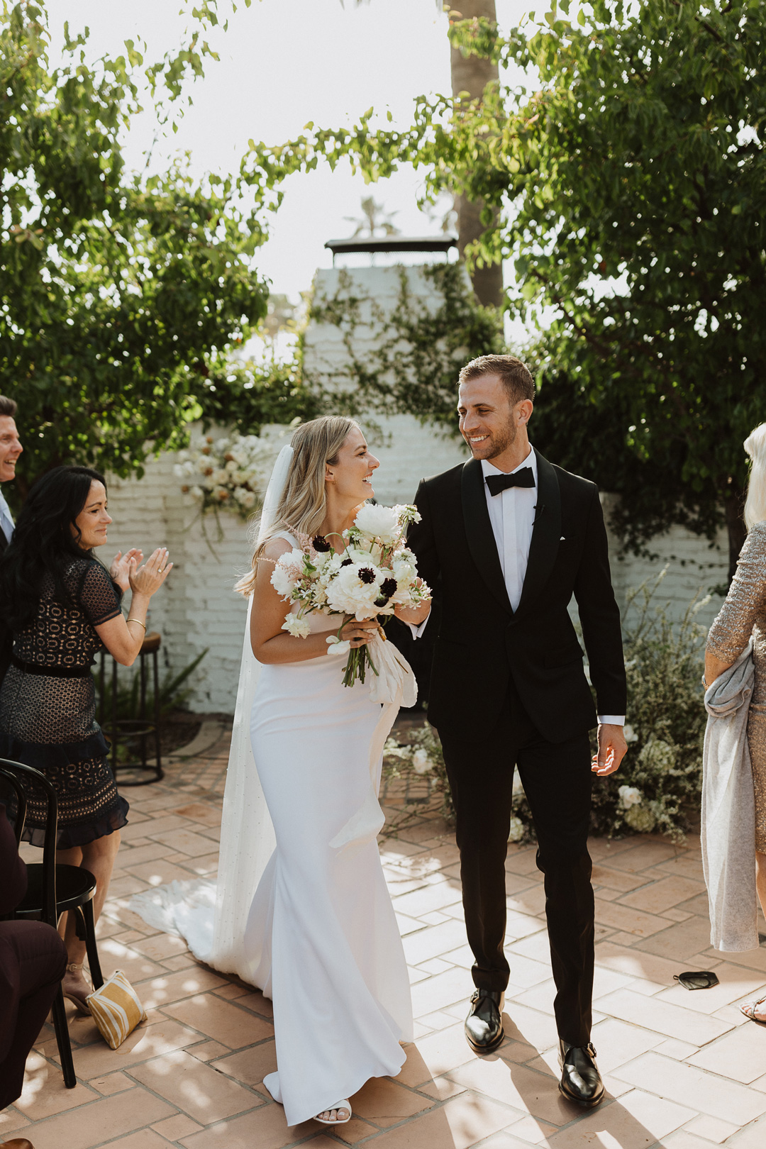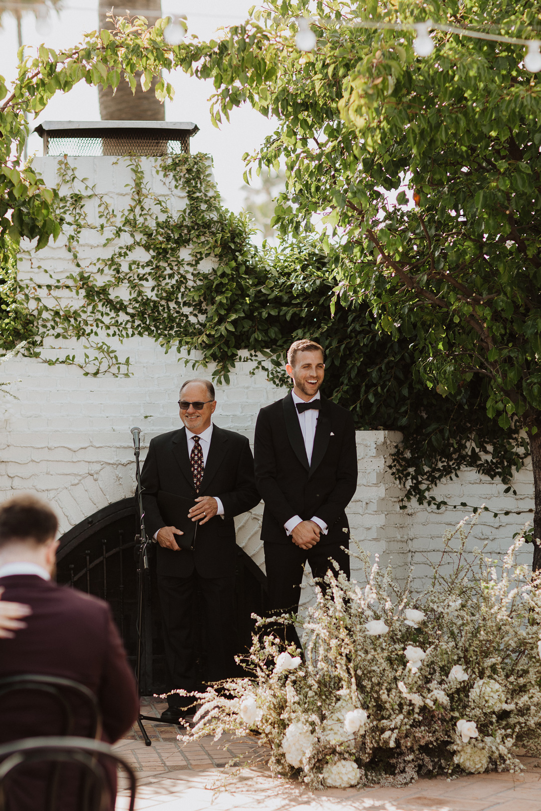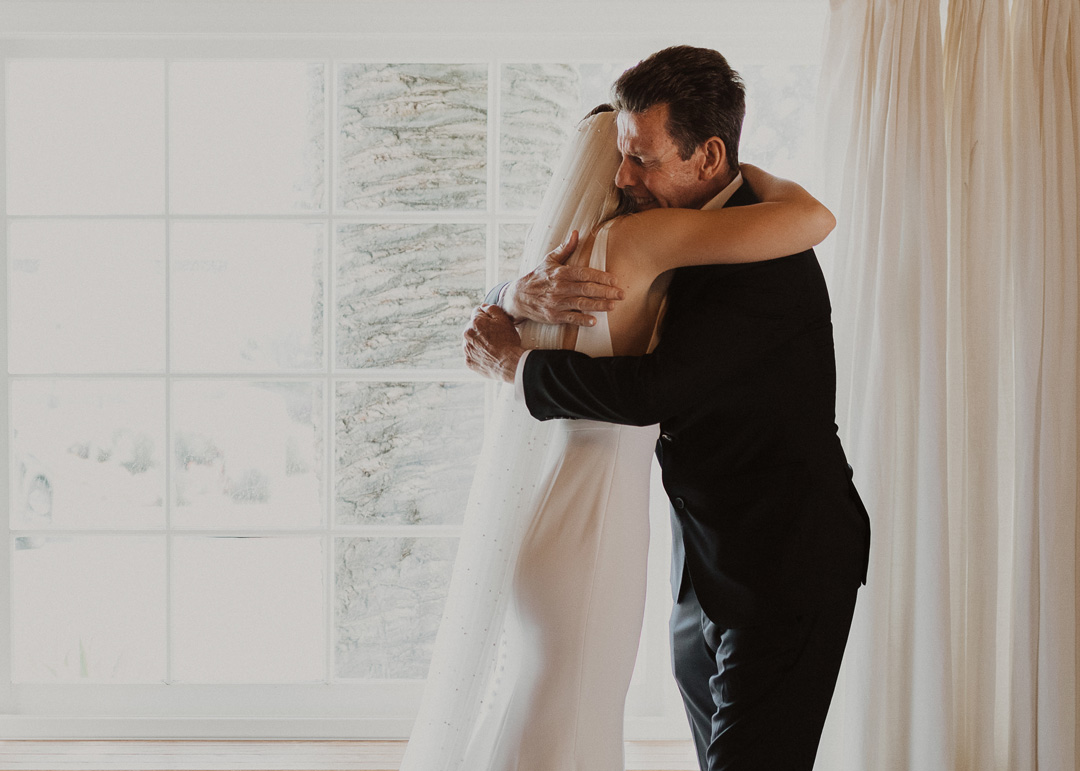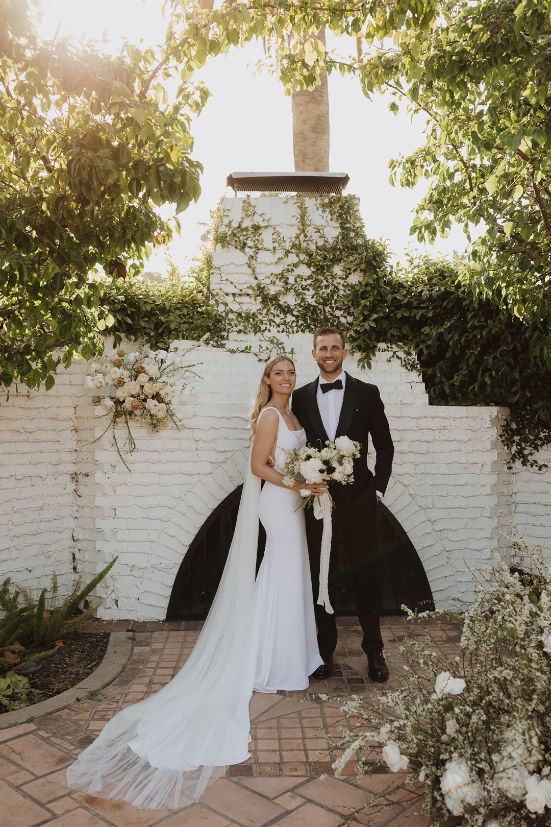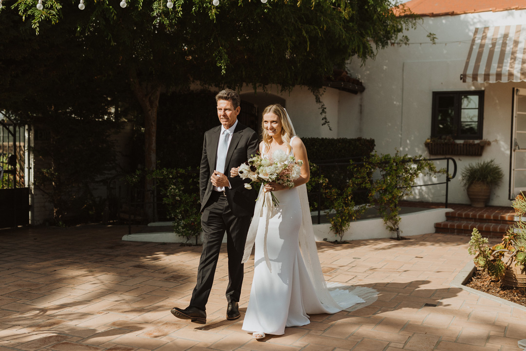 Toni and Andy were set to say “I do” in Italy in 2020, but when COVID had other ideas, this amazing couple pivoted and set their micro wedding date at The Casino San Clemente while still implementing aspects of the Italian countryside. White and toffee roses and meandering vines decorated the white brick fireplace outside on the Patio of the Stars and black chairs were perfectly lined up for guests. The bride, Toni, and her bridesmaids put the finishing touches on their looks inside the Brides Room and popped champagne while Andy and his groomsmen suited up in the West Wing. With help from her mom, Toni buttoned up the back of her classic crepe wedding dress, out on her pearl veil, and headed to her first look with her father. With a tap of the shoulder, her dad turned around and was stunned by his daughters beauty. The two went in for a warm embrace and exchanged sweet words before heading to the ceremony.