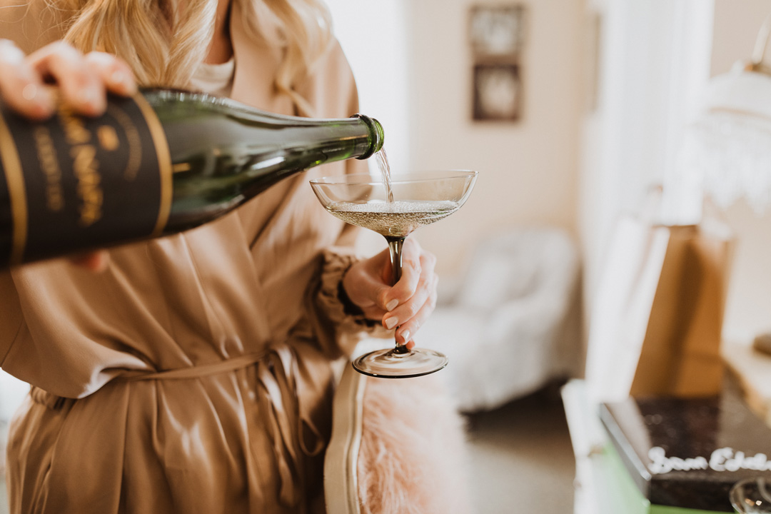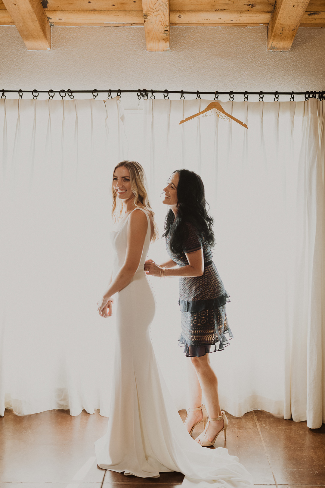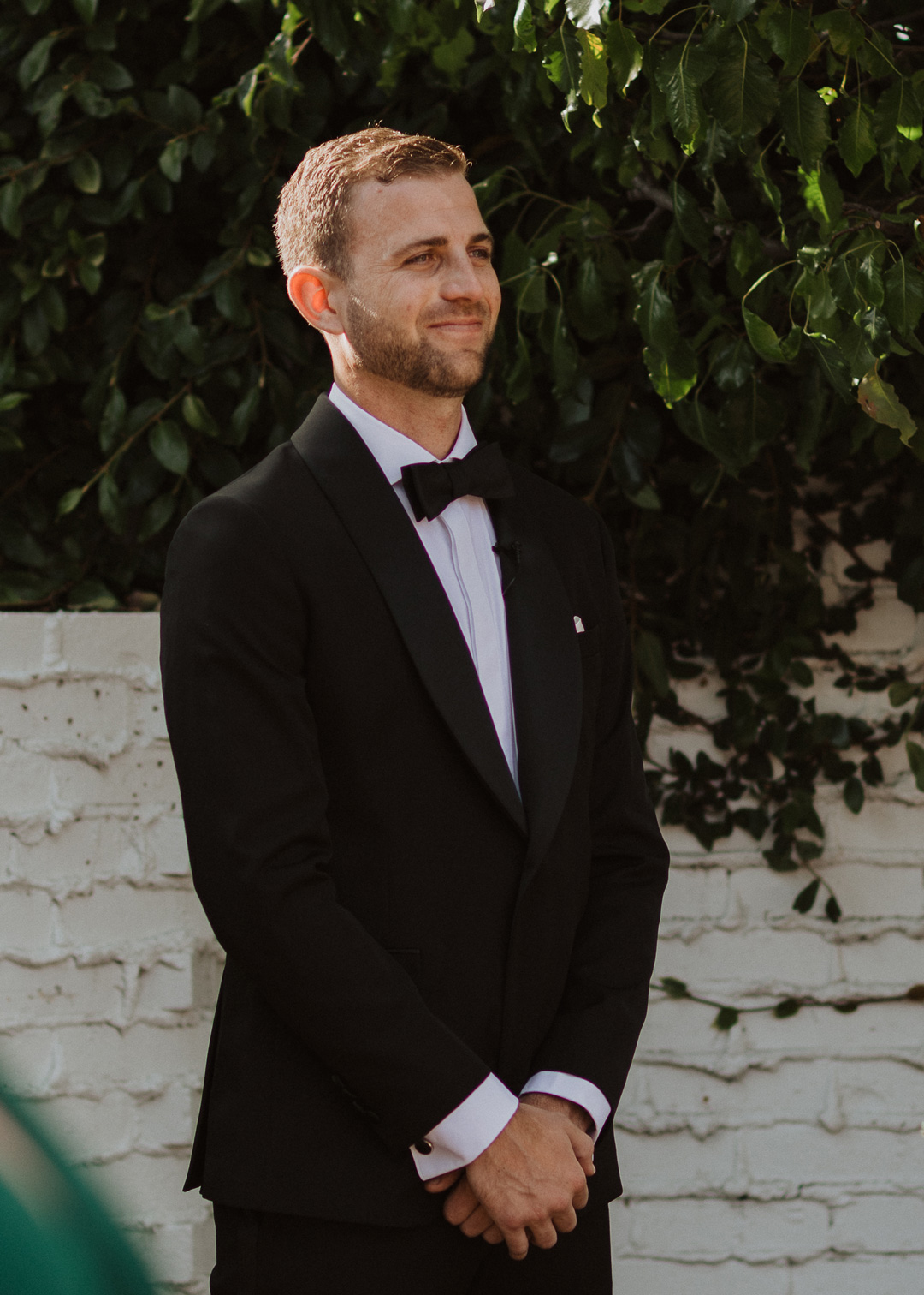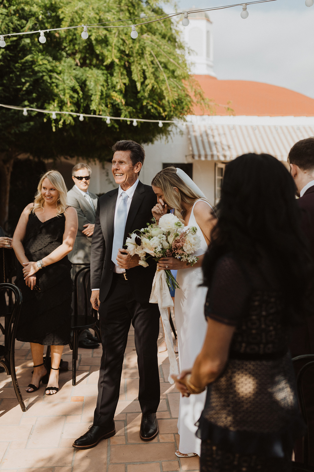 Toni and Andy were set to say “I do” in Italy in 2020, but when COVID had other ideas, this amazing couple pivoted and set their micro wedding date at The Casino San Clemente while still implementing aspects of the Italian countryside. White and toffee roses and meandering vines decorated the white brick fireplace outside on the Patio of the Stars and black chairs were perfectly lined up for guests. The bride, Toni, and her bridesmaids put the finishing touches on their looks inside the Brides Room and popped champagne while Andy and his groomsmen suited up in the West Wing. With help from her mom, Toni buttoned up the back of her classic crepe wedding dress, out on her pearl veil, and headed to her first look with her father. With a tap of the shoulder, her dad turned around and was stunned by his daughters beauty. The two went in for a warm embrace and exchanged sweet words before heading to the ceremony.
