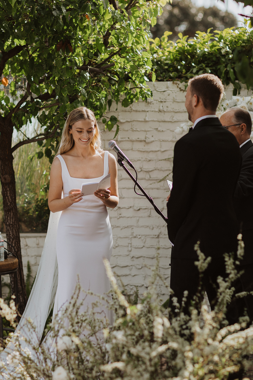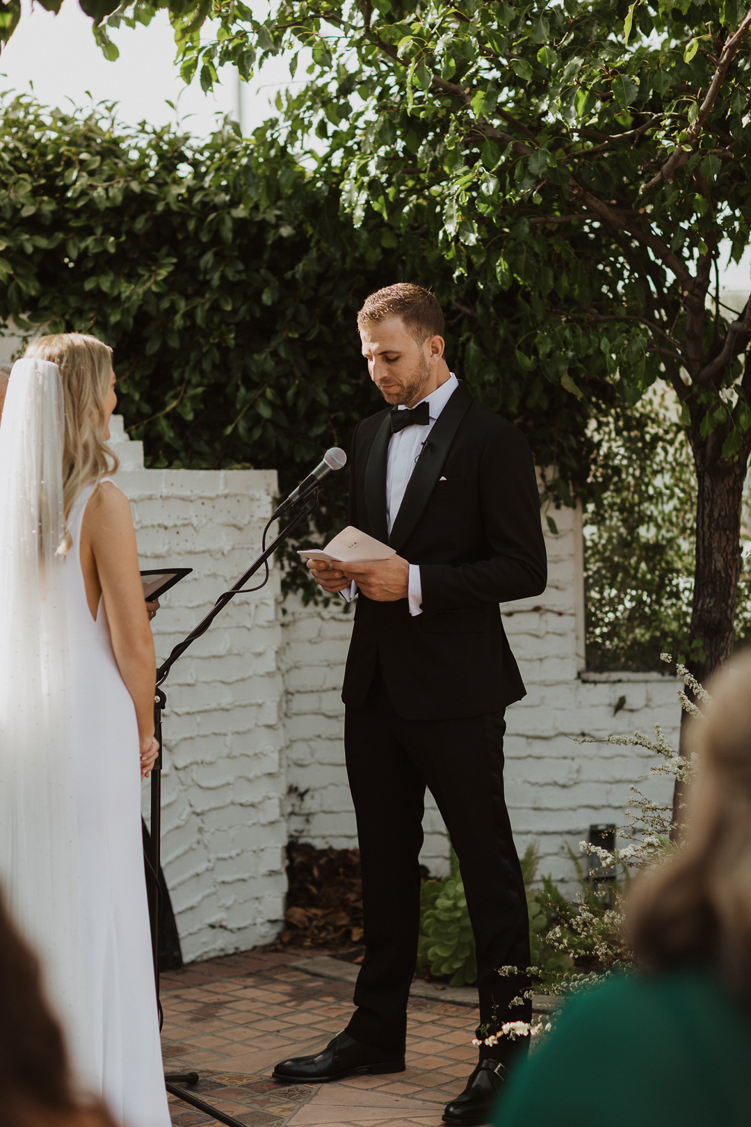 Everyone was seated on the patio as music cued up for the wedding party to walk down the aisle. Andy was first to make an appearance and anxiously awaited the entrance of his bride. Toni and her father walked out arm-in-arm and happy tears were tough to hold back. Since Toni and Andy opted out of a first look, this was the first time they had seen each other that day. The bride and groom shared personalized vows that made everyone laugh and cry, then slid each others rings on. The officiant pronounced the two husband and wife and the crowd cheered as the newlyweds kissed and exited the ceremony.