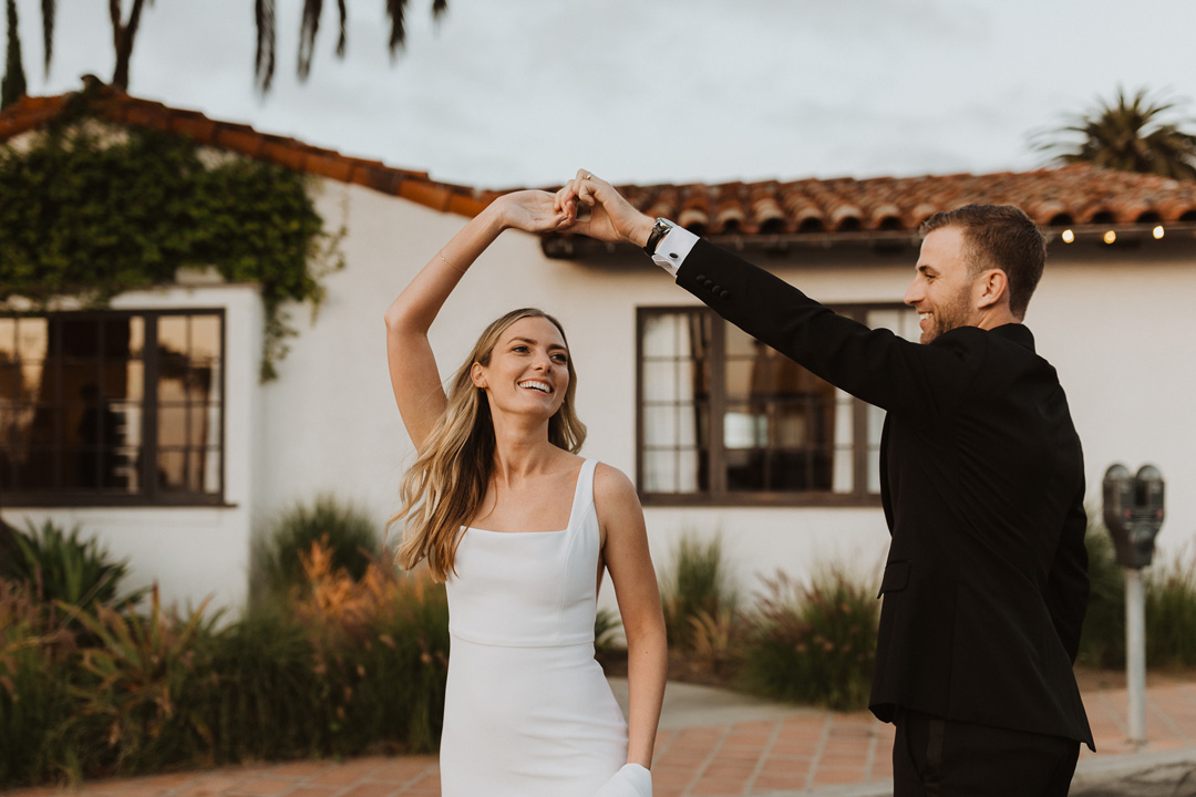 Black Bean and Sweet Potato Empanadas with avocado crema and Fig, Goat Cheese, and Mascarpone Tarts drizzled with a pomegranate sauce were tray passed as guests sipped on refreshing cocktails, beer and wine. Meanwhile, Toni and Andy were adventuring just outside The Casino for some golden hour photos. The newlyweds enjoyed their time posing for photos with Spanish-style backdrops and of course, the ocean just a few steps away. Upon their return, guests had found their seats for dinner and toasts. The first course of Pear and Walnut Salad was served, then toasts were shared. Guests laughed and cried and raised a glass filled with Champagne after every speech. The final course of Grilled Mahi Mahi, Classic Beef Filet, Gourmet Mashed Potatoes, and Roasted Broccolini was served after toasts ended. The menu was selected by the bride and groom during their wedding planning process with our Event Specialist, Brittany, and guests couldn’t have been happier with the food. After dinner, a small cake was cut by the newlyweds and passed out to guests with a sweet tooth. The remainder of the evening was spent telling stories across the table, reminiscing on past times and wishing the bride and groom the best for their new life together.