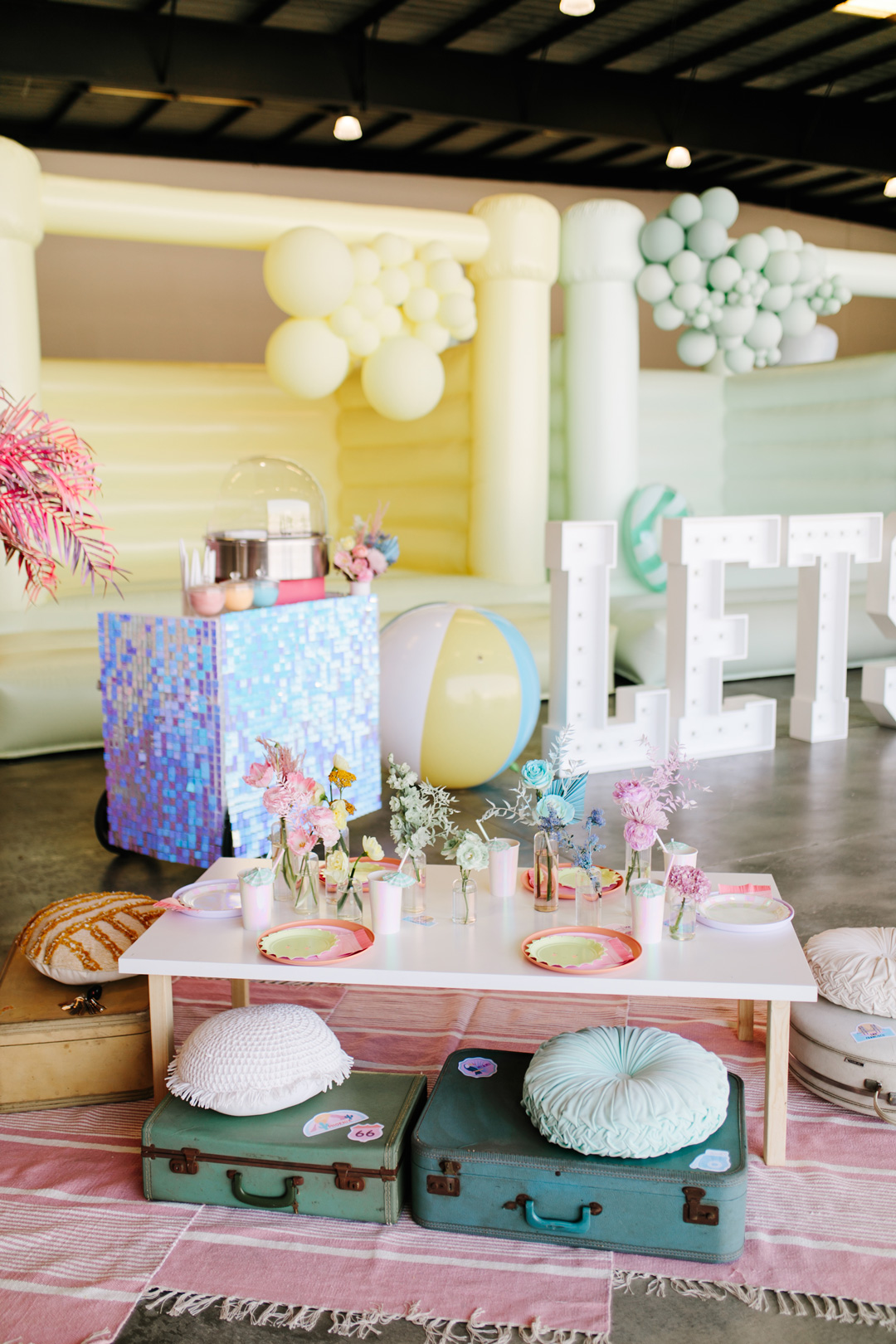 Michelle and her team of vendors set the scene for Bounce Couture’s line of pastel ‘Instagrammable’ jumpers at The Executive Hangar just in time for summer. Bubble Gum, Lemon Drop, Mint, Frost, and Taro colored jumpers were lined up and decorated with matching balloon garlands and fun summer vignettes. Large marquee light up letters that read, “LET’S BOUNCE” stood tall directly in front of the vibrant bounce houses with Twisted for Sugar’s cotton candy cart and Pacific Organic Pop’s popsicle cart on either side. A small table with luggage cases as seats was topped with rainbow florals from Lovestruck Blooms and pink palm trees were placed about the venue. Inflatable pool complete with lounge chairs and inner tubes tied together the summer-fun theme and a small plane covered in pastel flowers and luggage gave us the travel bug. And what’s summer without snow cones?! Twisted Sugar served up delicious tropical treats that are perfect for hot days outdoors. Bring on the heat because this styled shoot has us ready for all the summer activities!