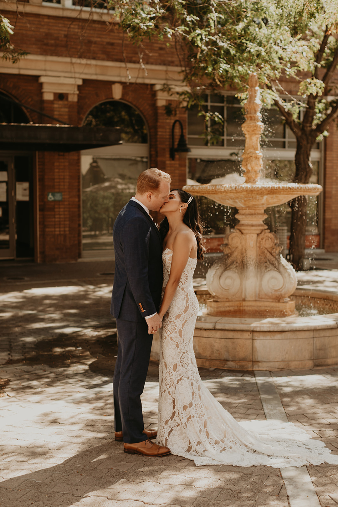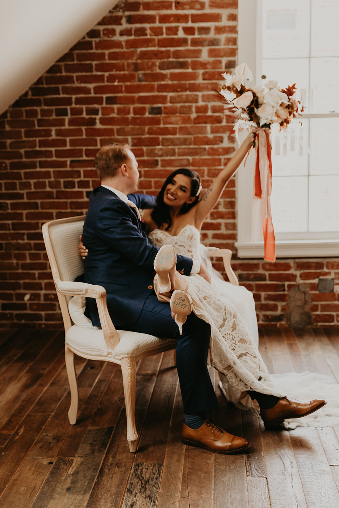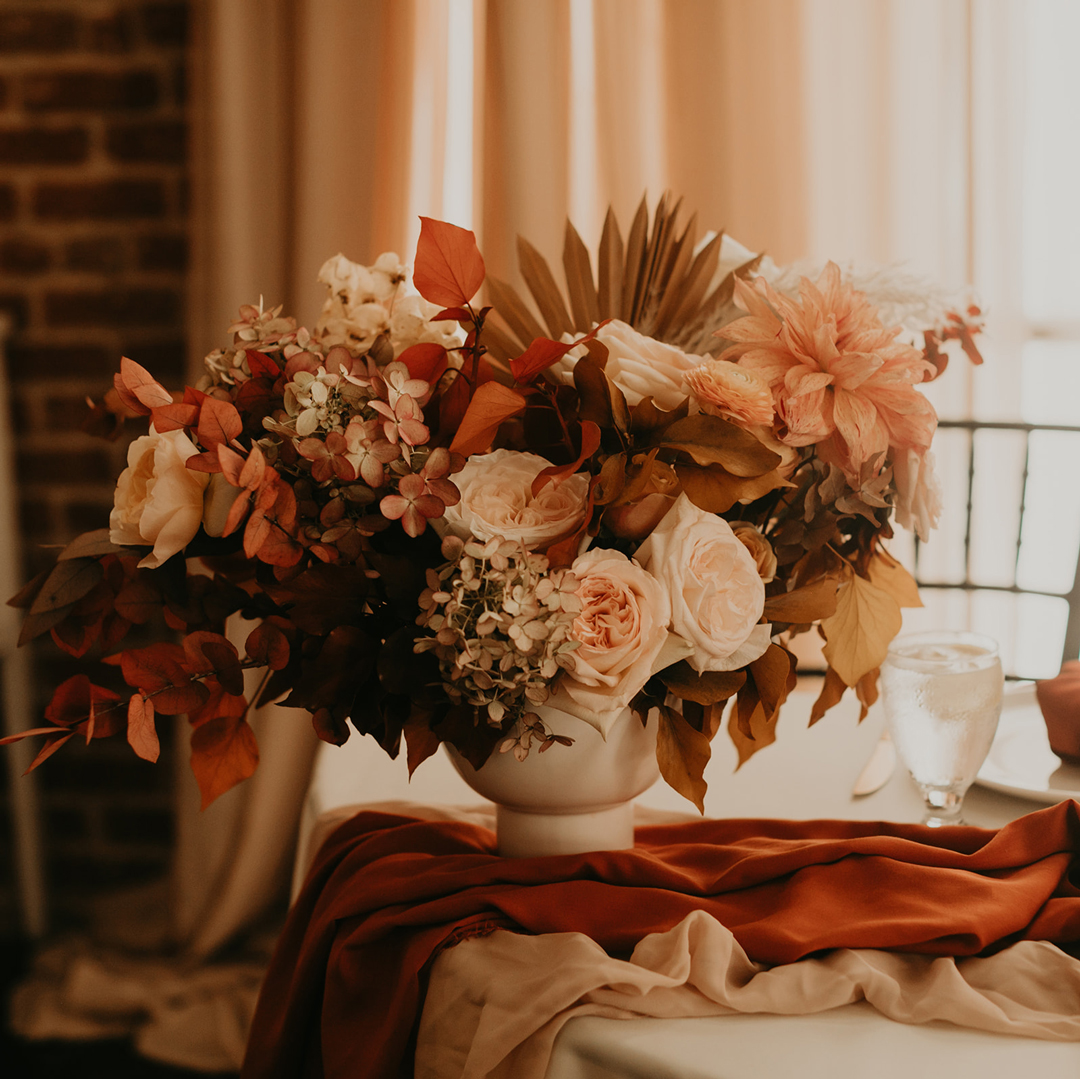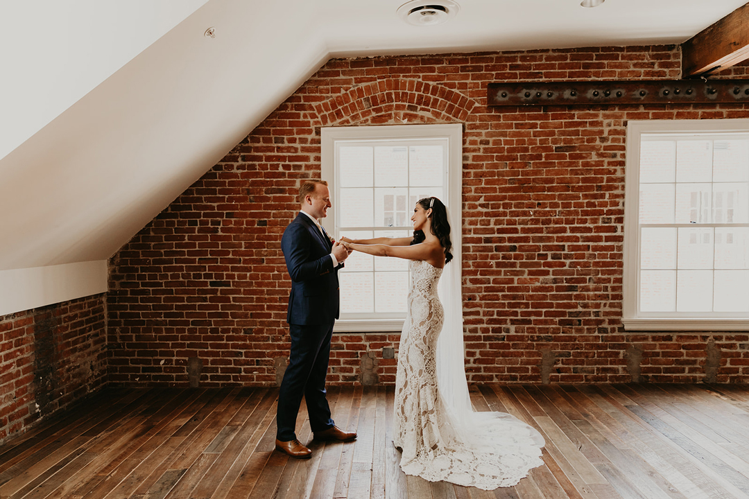 The glowing bride, Alina, and her charming groom, Robert, are the perfect example of how to make lemonade out of lemons. That’s how the saying goes right? Due to the coronavirus, Alina and Robert had to drastically change their wedding plans, but luckily Alina herself is an event planner, so she took the reins and ran with a COVID safe micro wedding plan. Bridesmaids, groomsmen, and immediate family would be the only ones allowed into The Estate on Second for Alina and Robert’s minimony, a term that became popular this year due to the influx of small (mini) wedding ceremonies popping up because of the virus. Alina donned a stunning allover lace wedding dress, floor length veil and a waved hairstyle that looked like something out of an old Hollywood movie with pearl clip to keep one side out of her face. She held a bouquet of the lightest pink roses and rust colored foliage making it perfect for fall. Robert wore a navy suit with brown oxfords and matched his groomsmen. The two shared a sweet first look in the Attic before heading downstairs to the Crystal Ballroom where their family awaited them. A simple garland of greenery framed the center Palladian window and the bride and groom as they exchanged their vows. The bridesmaids in champagne colored dresses held back tears throughout the ceremony while the groomsmen smiled at the bride and groom in approval. Alina and Robert exchanged rings and were pronounced husband and wife as their tiny but mighty support group cheered. The loving wedding party left all together after the ceremony to continue the celebration with boxed meals from our Boxed Chambre Menu. Sometime after the wedding, when it is safe, the bride and groom will gather with ALL of their friends and family and celebrate their marriage.