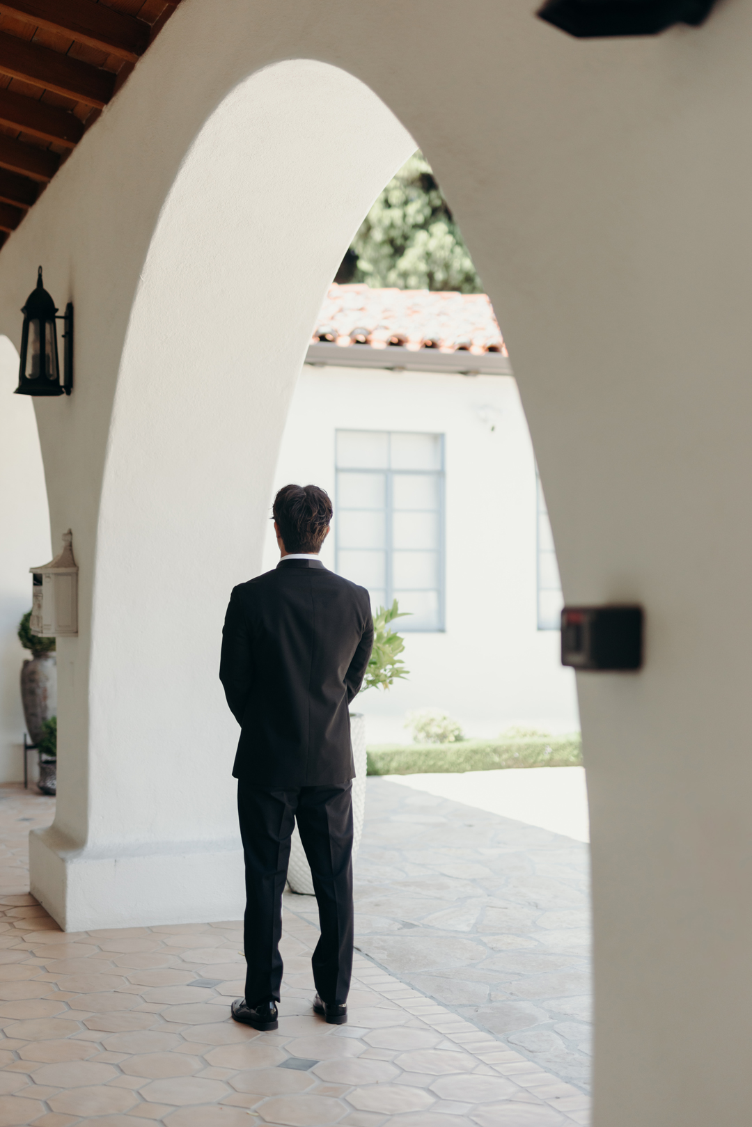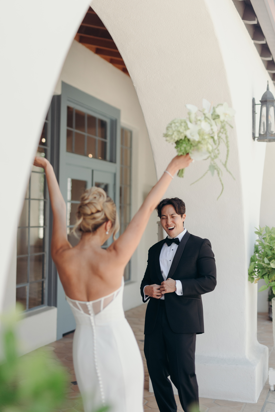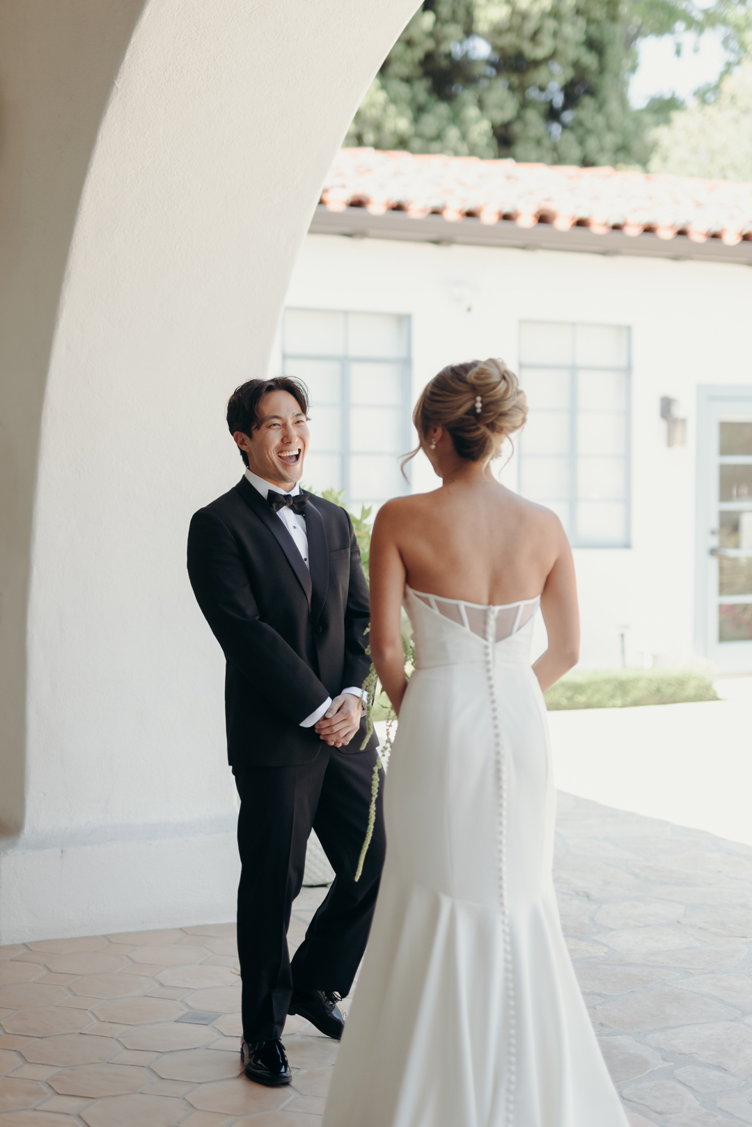 Stephanie got ready in the Grand Gimeno Powder Room with her bridesmaids while Shawn suited up in the Parlor with his groomsmen. Once the bride and groom were ready, they stepped out into the Courtyard for their first look. A tap on the shoulder turned Shawn around to see his beautiful bride standing before him in a strapless wedding dress. Big smiles filled their faces, and sweet compliments were exchanged while the wedding party watched from the sidelines. After a few photos of the couple, their bridesmaids and groomsmen joined in for group pictures, then they all lined up together for the ceremony.