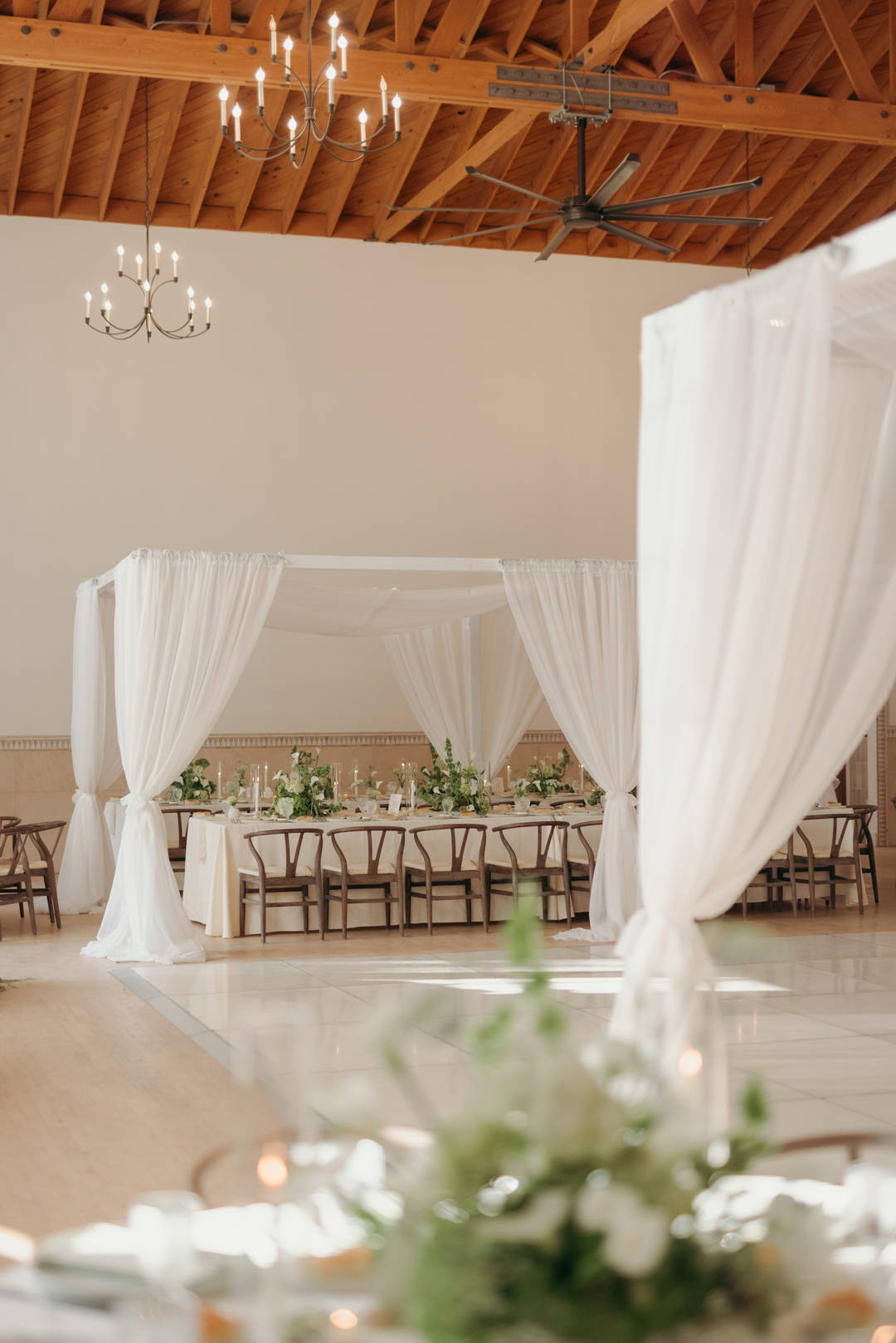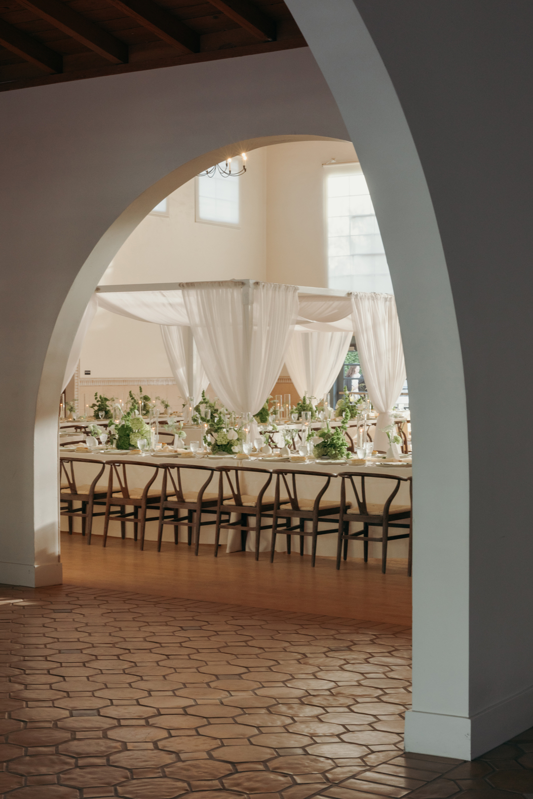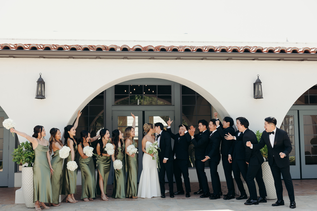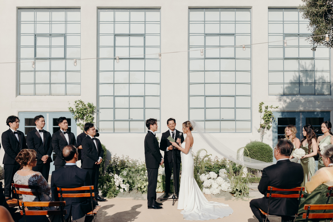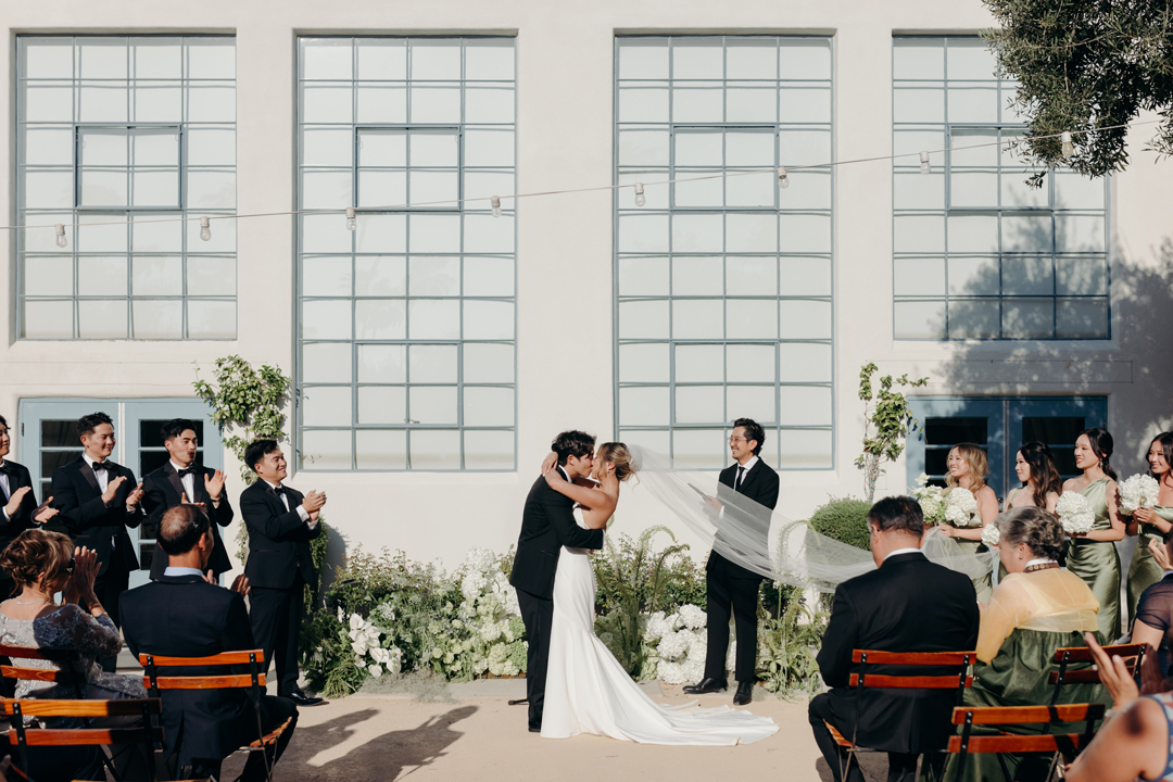 Guests entered the Olive Grove, signed the bride and groom’s guest book, then took a seat. A modern ground arrangement of green and white hydrangeas was placed as the ceremony backdrop and matching arrangements marked the back of the aisle. Once all the guests were in attendance, the music cued up, and the wedding party made their entrances ending with Stephanie. In front of all their friends and family, Stephanie and Shawn read handwritten vows, exchanged rings, and sealed the ceremony with a kiss.