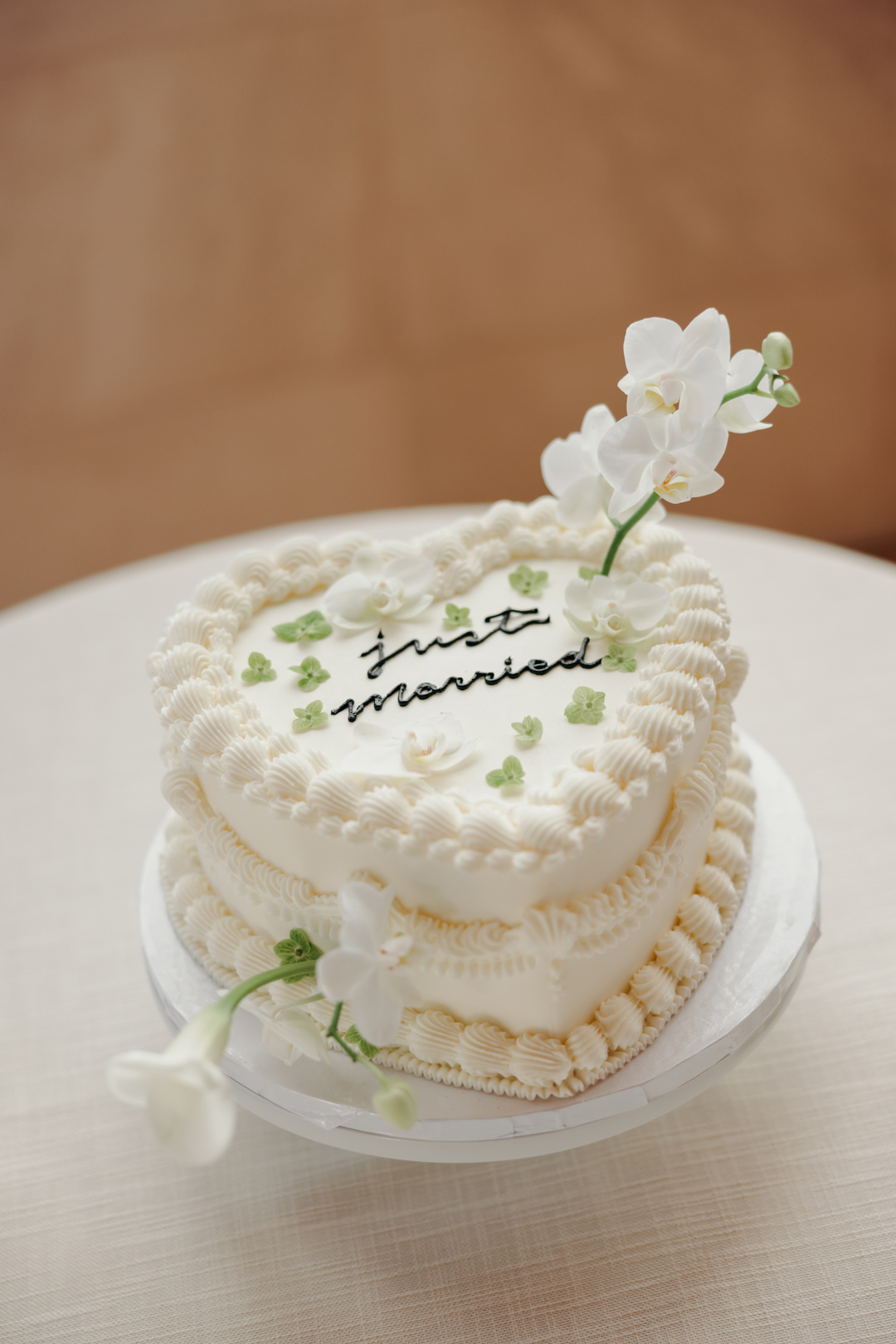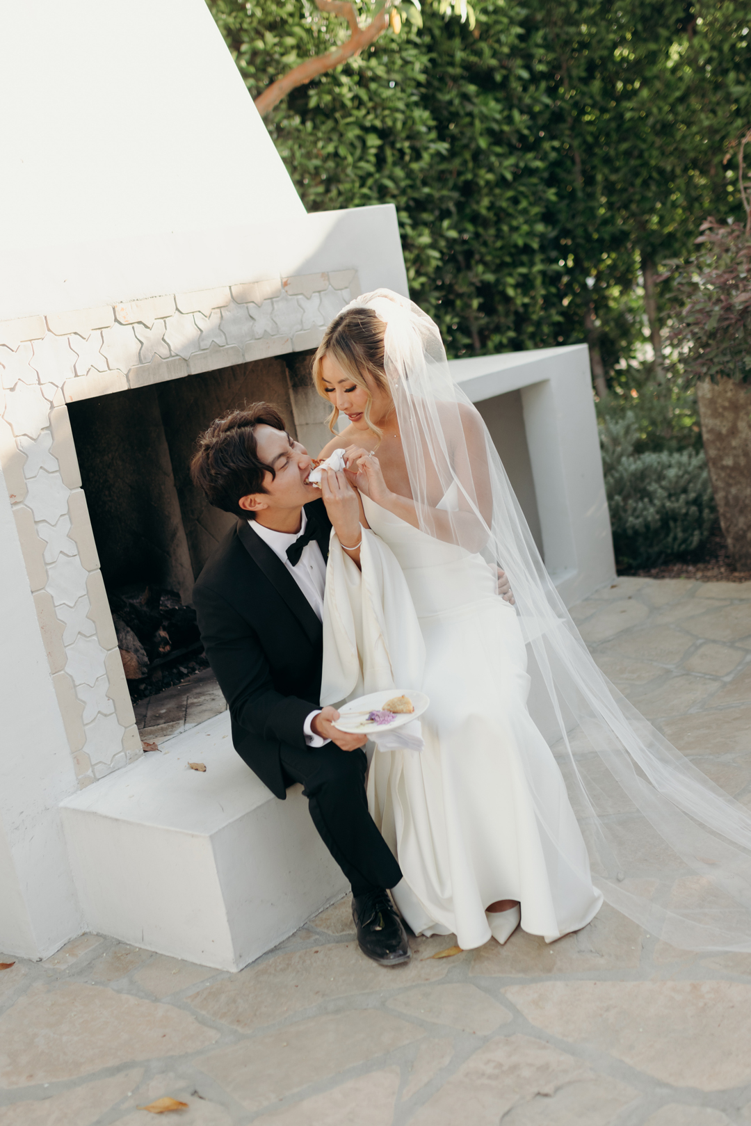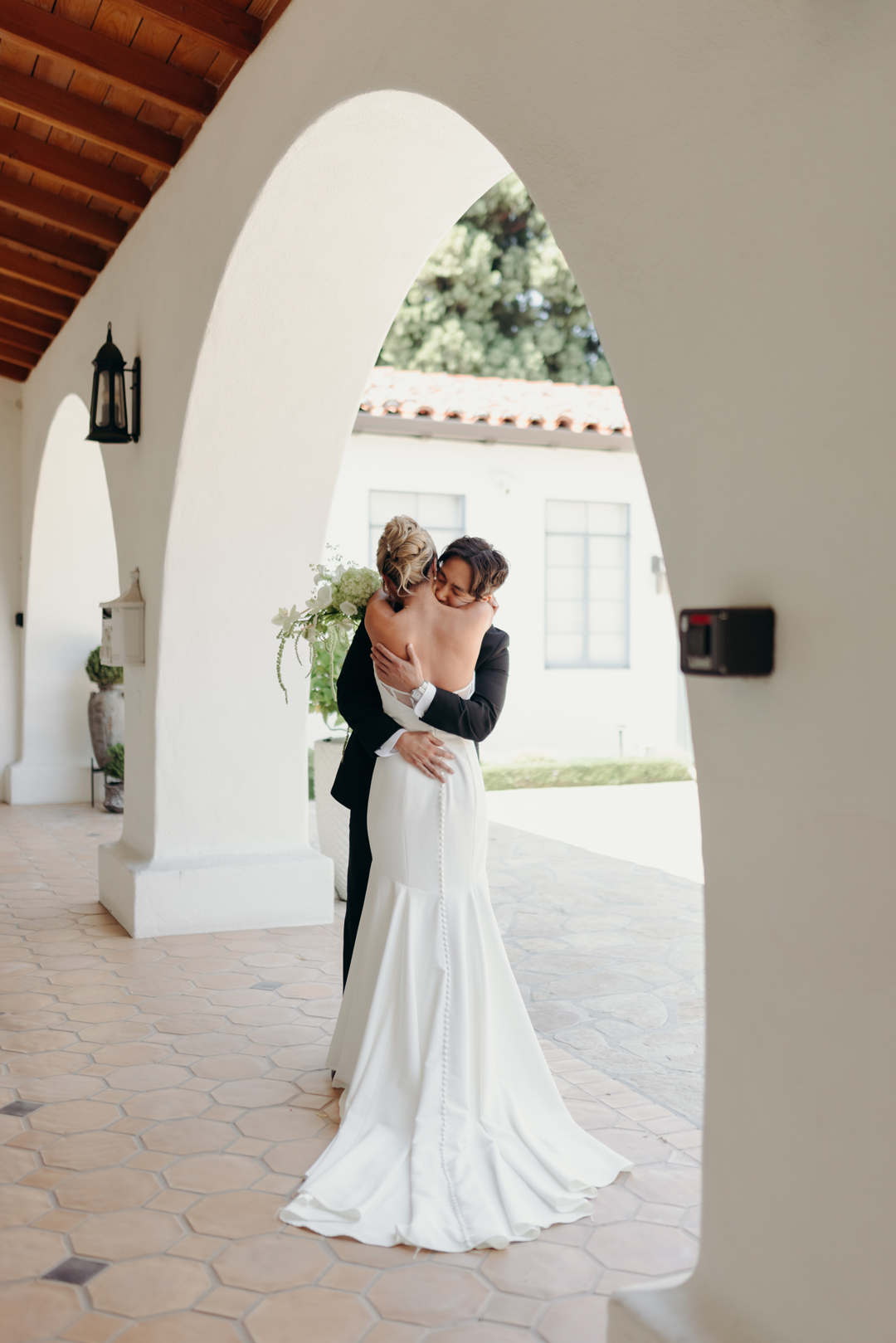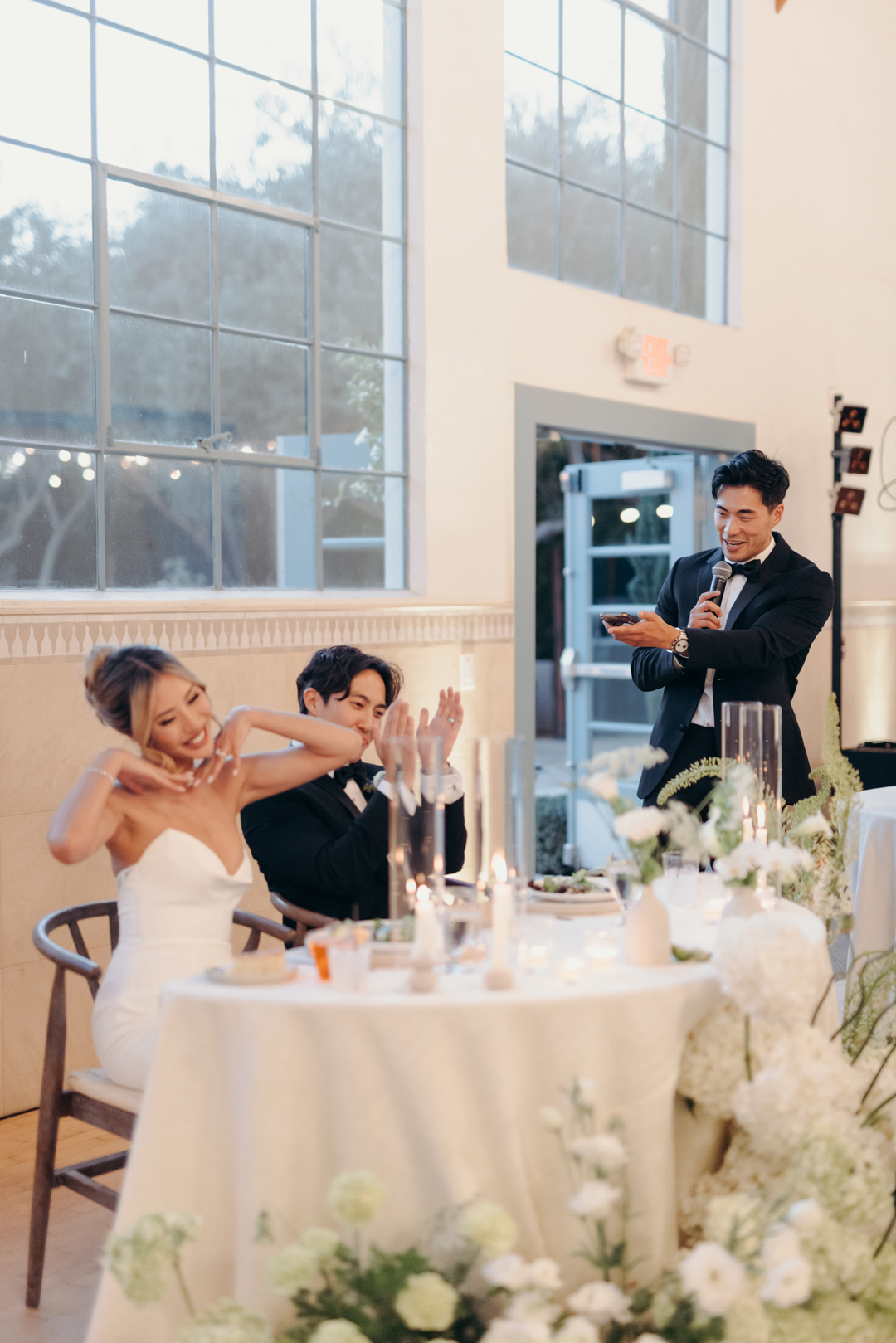 Guests entered the Olive Grove, signed the bride and groom’s guest book, then took a seat. A modern ground arrangement of green and white hydrangeas was placed as the ceremony backdrop and matching arrangements marked the back of the aisle. Once all the guests were in attendance, the music cued up, and the wedding party made their entrances ending with Stephanie. In front of all their friends and family, Stephanie and Shawn read handwritten vows, exchanged rings, and sealed the ceremony with a kiss.