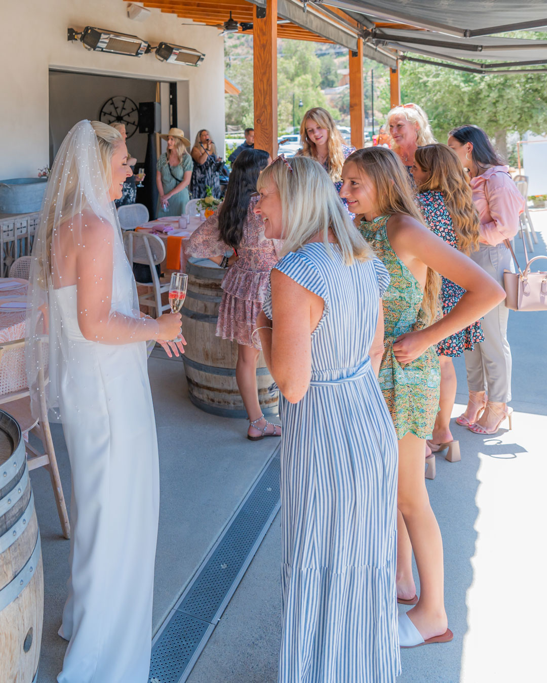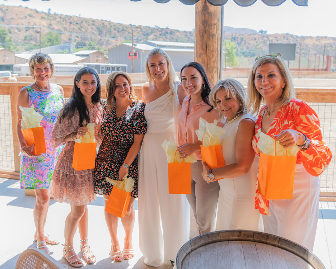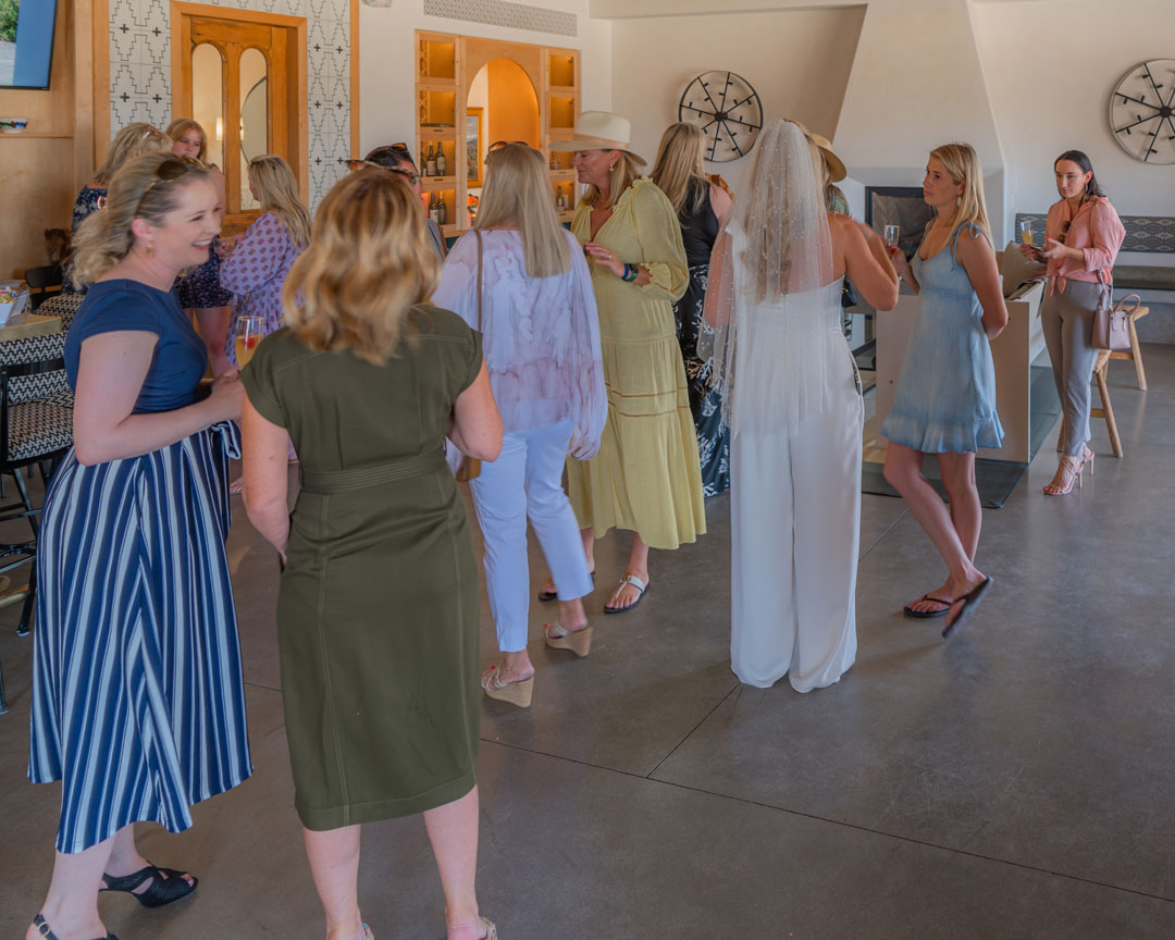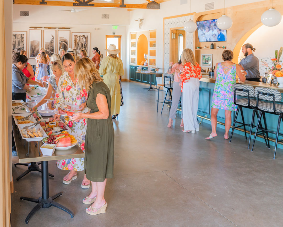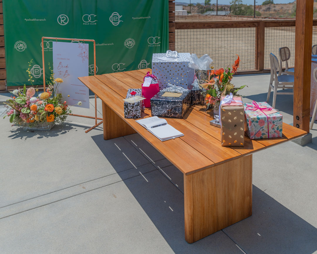 Pops of orange and pink decorated the OC Polo Club for Joanna’s Sunday morning bridal shower brunch. Arrangements of fresh, summer florals sprouted up as centerpieces at each table and a live band ushered friends and family into the celebration where a mimosa bar and Charcuterie Tray with salami, prosciutto, mortadella, European and domestic cheeses, olives, mixed nuts and dried apricots with fig jam, crackers, and sliced baguettes awaited them. Once everyone had arrived, the bride-to-be, Joanna, made her entrance. Dressed in a white jumpsuit and pearl veil, she made her rounds greeting everyone, then invited her guests to take a seat for brunch.