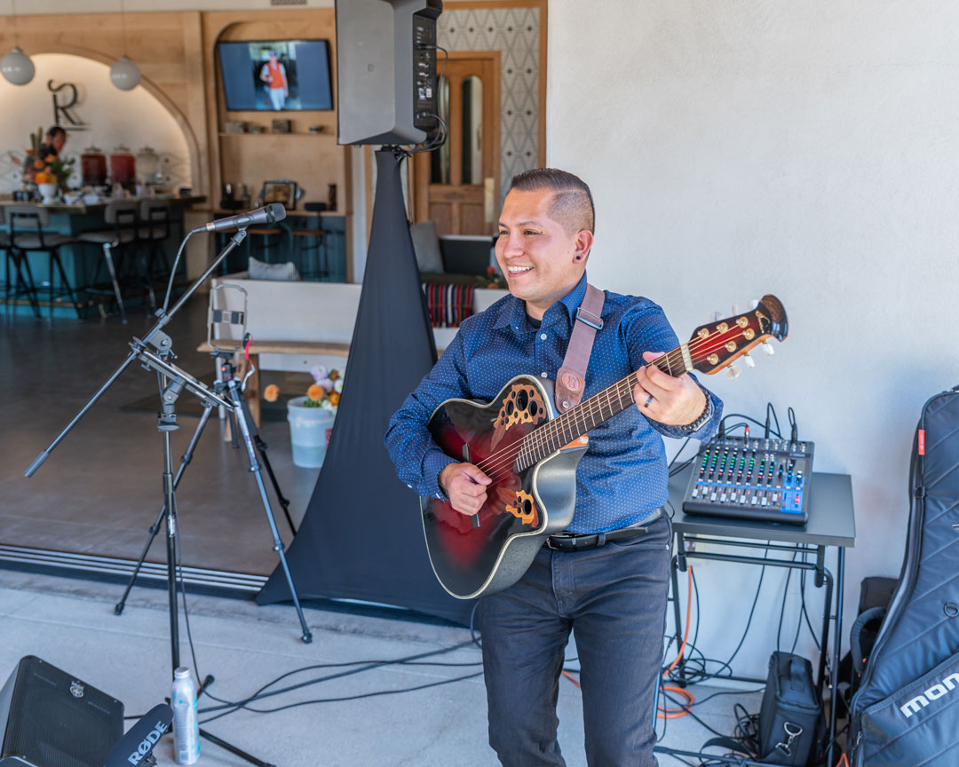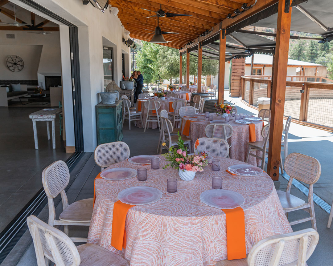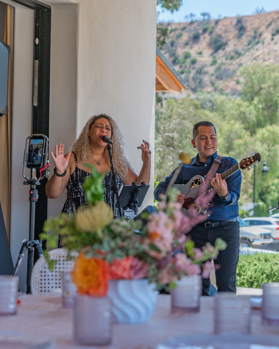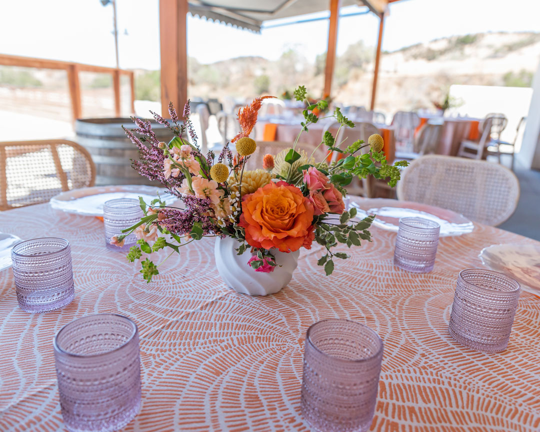 Pops of orange and pink decorated the OC Polo Club for Joanna’s Sunday morning bridal shower brunch. Arrangements of fresh, summer florals sprouted up as centerpieces at each table and a live band ushered friends and family into the celebration where a mimosa bar and Charcuterie Tray with salami, prosciutto, mortadella, European and domestic cheeses, olives, mixed nuts and dried apricots with fig jam, crackers, and sliced baguettes awaited them. Once everyone had arrived, the bride-to-be, Joanna, made her entrance. Dressed in a white jumpsuit and pearl veil, she made her rounds greeting everyone, then invited her guests to take a seat for brunch.