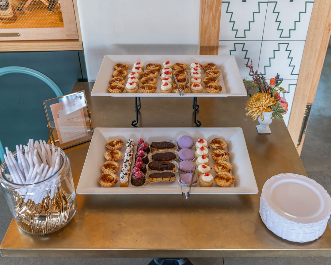 A delicious spread of Cashew Chicken Salad Tea Puffs, Tomato, Mozzarella and Pesto on Focaccia Sandwiches, Mini Blueberry Scones with Lemon Curd, Mini Spinach and Cheddar Quiche, Seasonal Fresh Fruit, Mini Strawberry Short Cakes, French Apple Tarts, and Assorted French Macarons filled the buffet. The Tea Menu was suggested by our Event Specialist, Casey, to suit the occasion. Guests grabbed their plates, filled them, then sat back down for a few games. The competition was fierce, and winners left with prized goodie bags as awards, then dessert was unveiled. Our French Dessert Collection concluded brunch with an assortment of Lavender Macarons, Raspberry Chocolate Decadence, Lemon Curd Tarts, Vanilla Bean Chocolate Eclairs and French Apple Tarts. To top off dessert, Joanna’s fiancé showed up and passed out flowers to each guest along with a beautiful bouquet for his bride. The celebration ended inside the clubhouse where guests danced to a few songs before saying their goodbyes to Joanna.