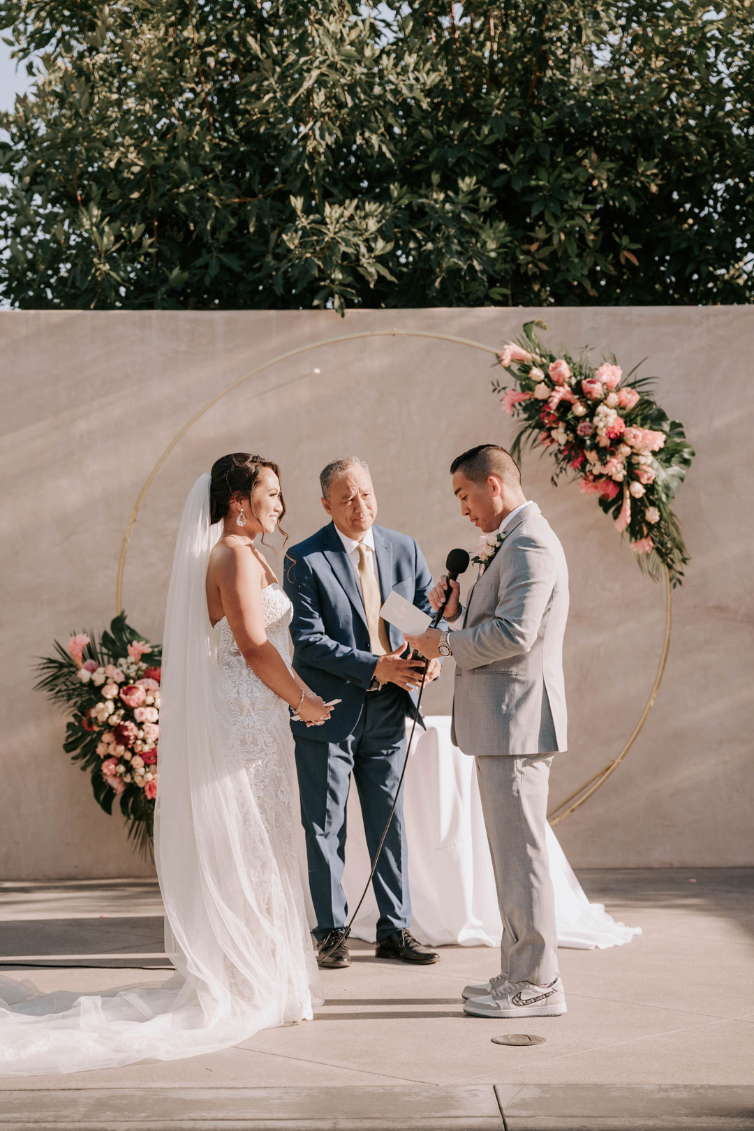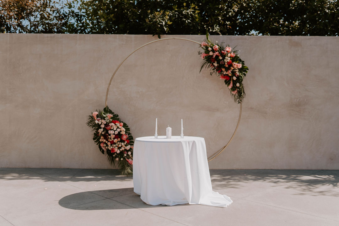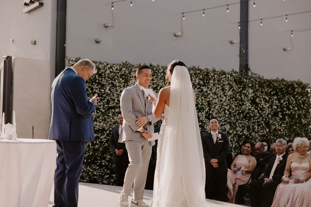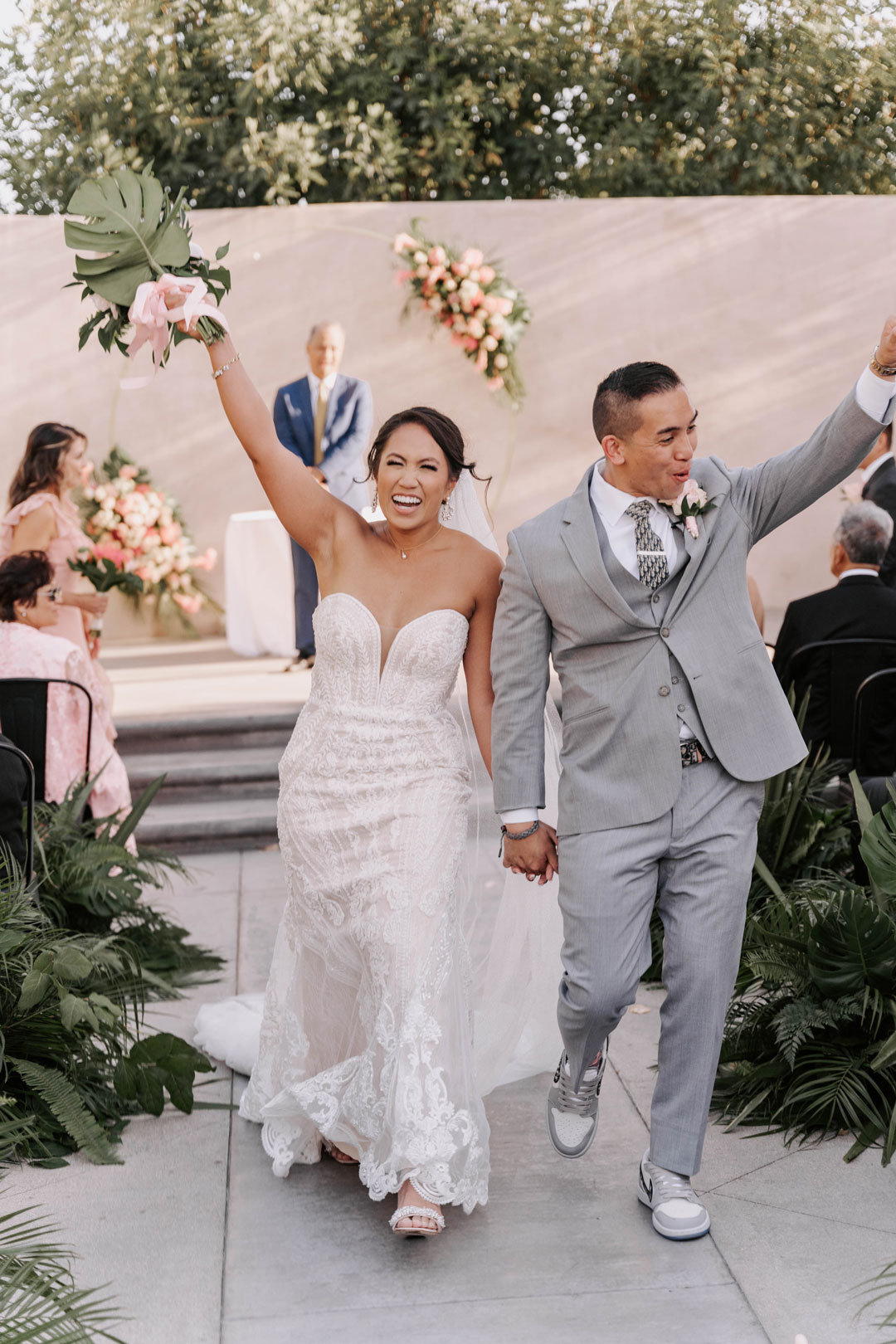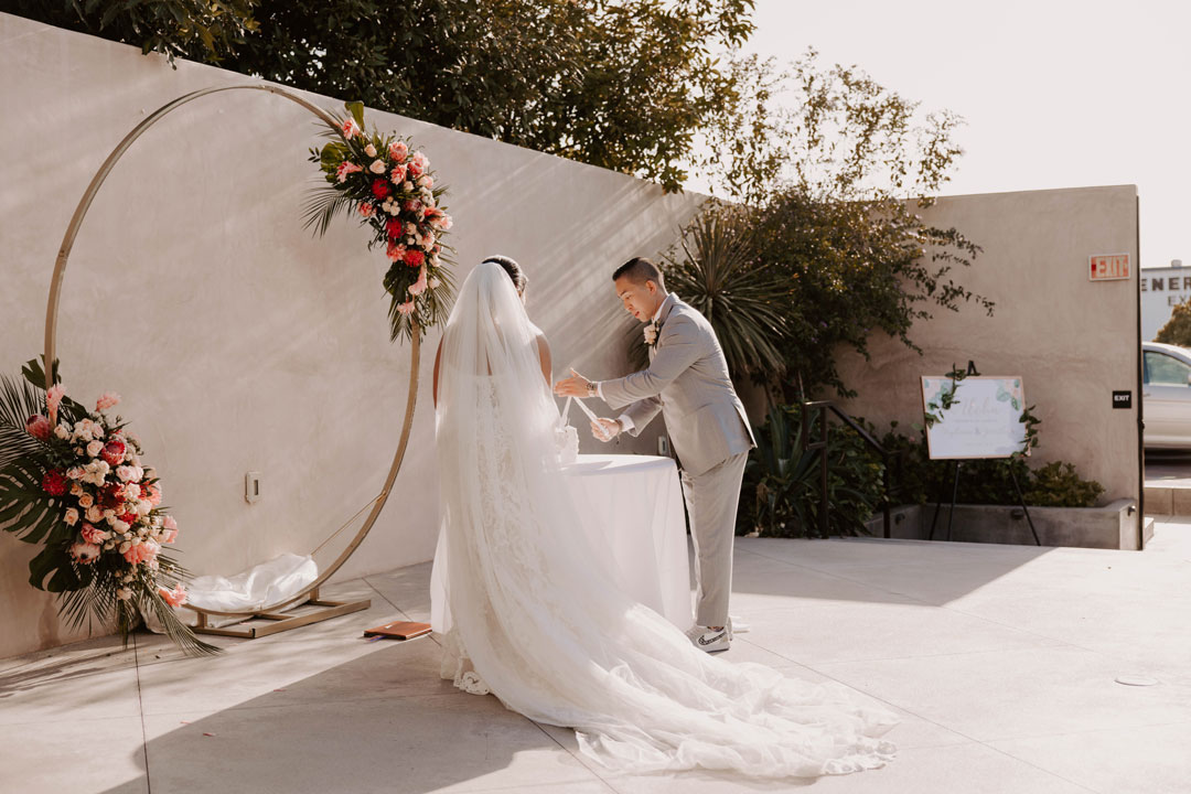 Guests entered the side patio, signed Stephanie and Jonathan’s guest book, and took a seat. A table was placed centerstage with unity candles and a circular backdrop covered in tropical flowers and greenery completed the setup. With everyone in attendance, music cued up and Jonathan began his walk down the aisle followed by the groomsmen and bridesmaids and ending with Stephanie. During the leafy lined aisle walk, both the bride and groom shed a few tears as it was their first time seeing each other. The tears subsided when the two were side by side, and smiles filled their faces. In front of their closest friends and family, the couple read handwritten vows, lit their unity candle, exchanged rings, and sealed the ceremony with a kiss. Everyone cheered as the newlyweds exited into cocktail hour.