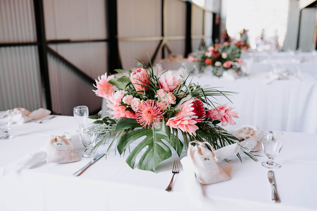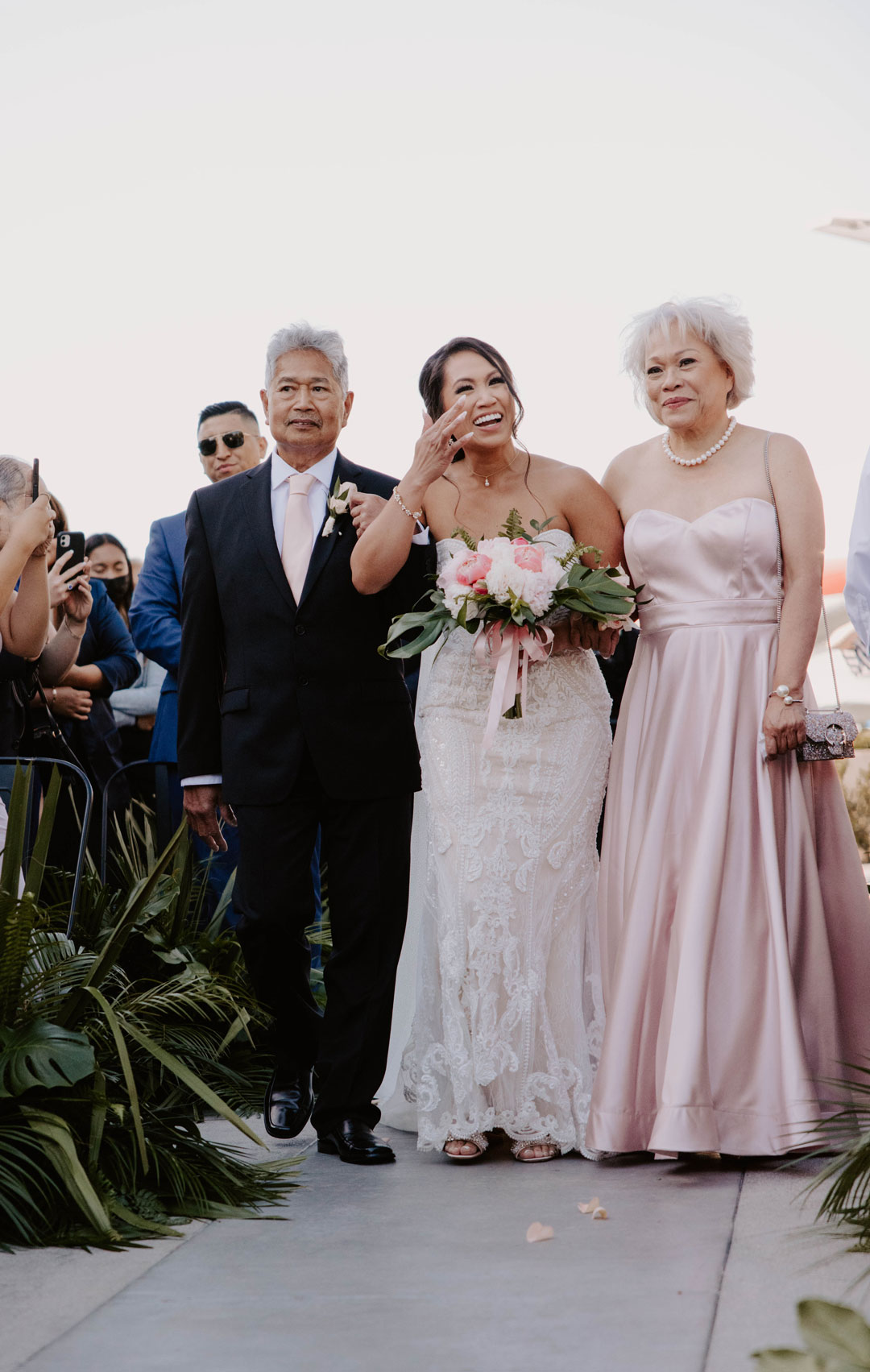 After getting ready at a nearby hotel, Stephanie and Jonathan arrived at Hangar 21 South with their wedding party. Making sure to stay separated until the ceremony, Jonathan and his groomsmen claimed the tarmac and Stephanie and her bridesmaids took the bridal suite for photos. Each groomsman wore a charcoal suit and pink tie, and the groom wore light grey. The bridesmaids were dressed in pink and the bride was in a white, lace dress. Bouquets and boutonnieres matched with lush green leaves and pink florals tying into the tropical theme perfectly. Once group photos were done, the wedding party lined up for ceremony.
