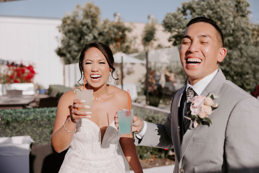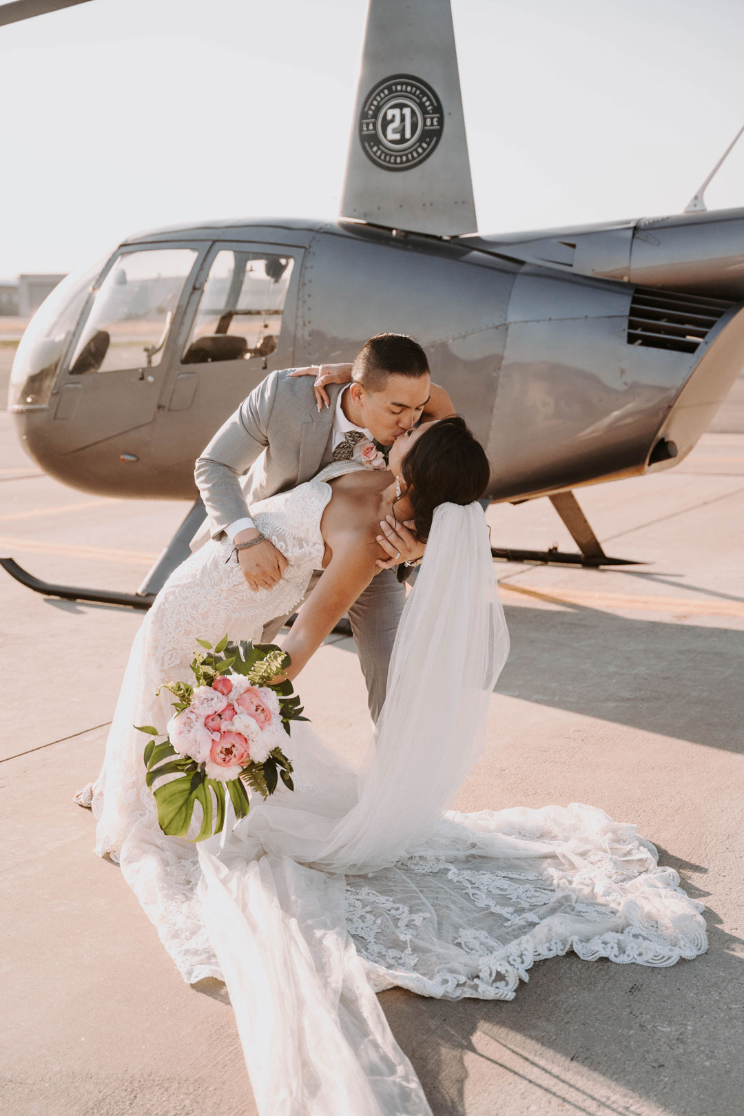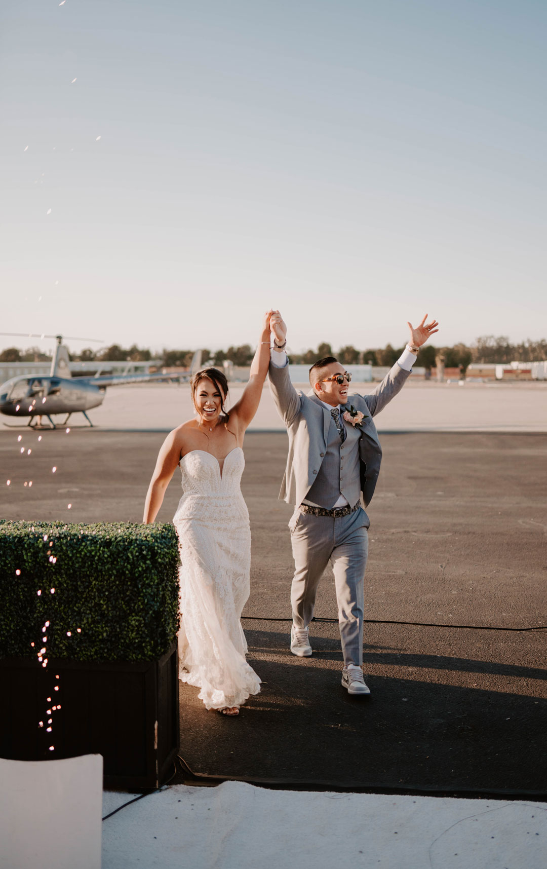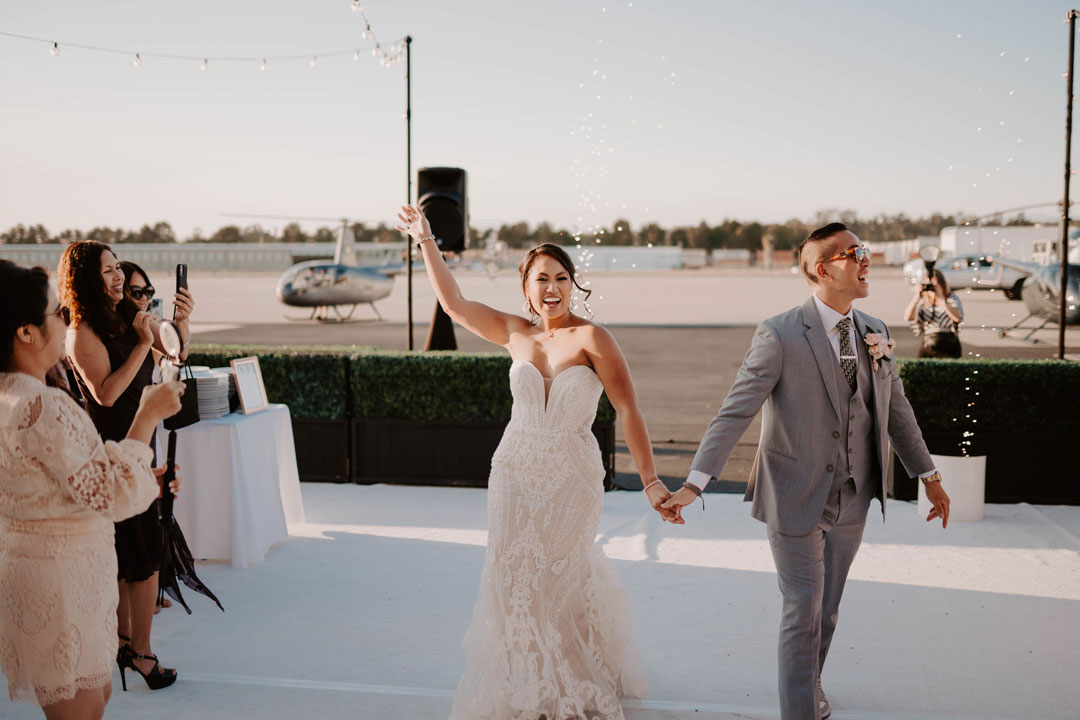 Stephanie and Jonathan were welcomed into cocktail hour with their signature drinks, a Paloma and Adios, and Crab Cake and Thai Chicken Spring Roll hors d’oeuvres. Guests followed right behind them, and many hugs were shared. The bar was mixing up more signature cocktails, pouring wine, and cracking open beers as guests gathered on the tarmac. While everyone mixed and mingled, the newlyweds headed over to our helicopter for their flight over Orange County. A few photos were taken, then they were off! Their wedding guests watched them takeoff, and soon after, land and make their grand entrance into reception.