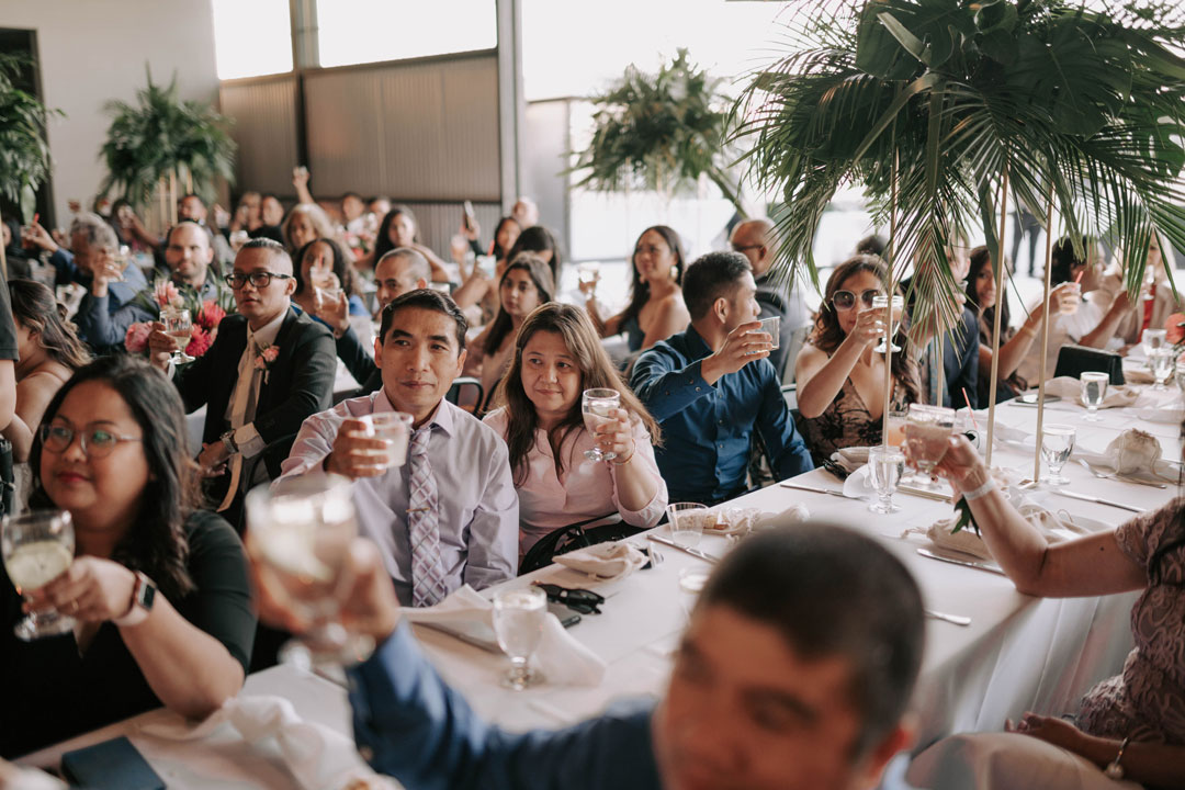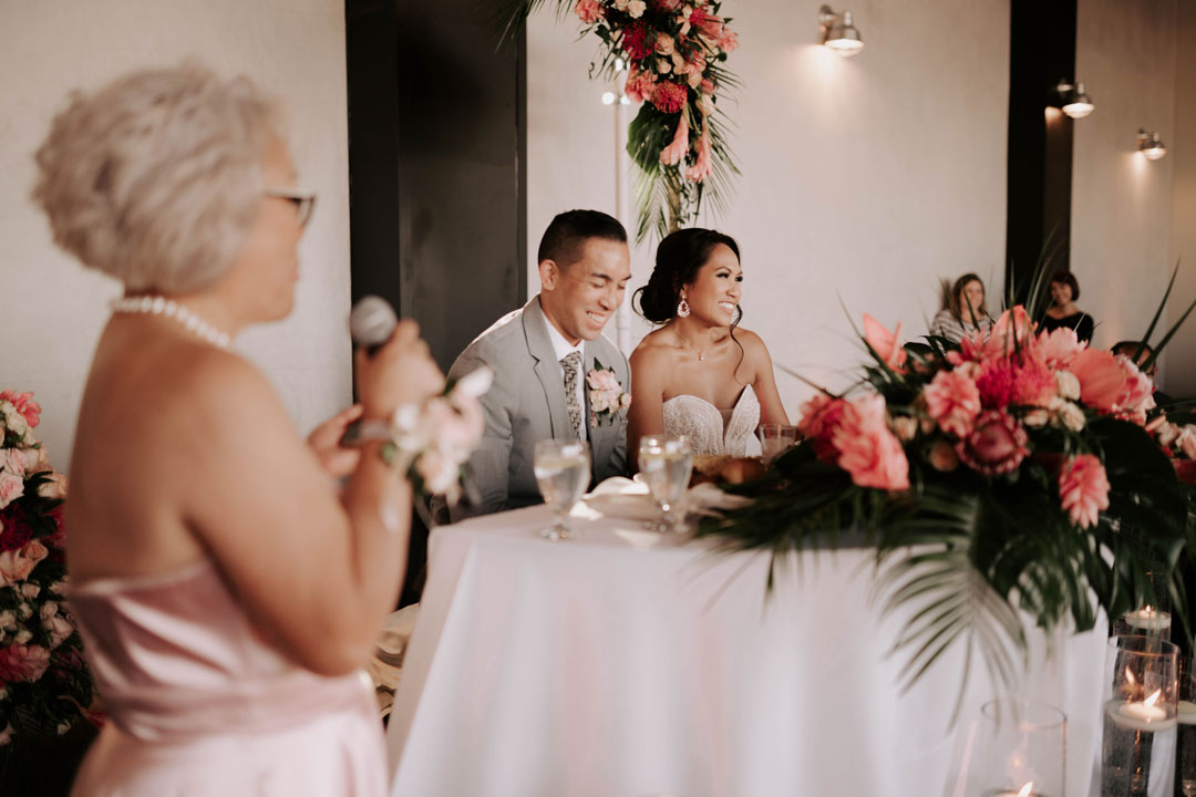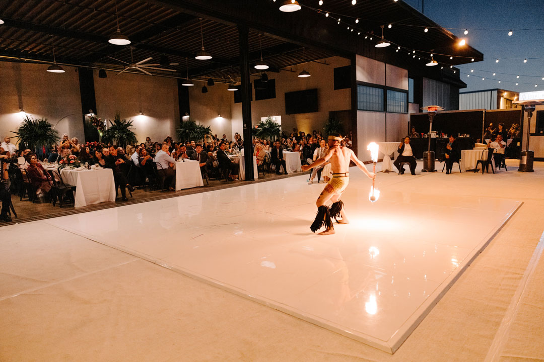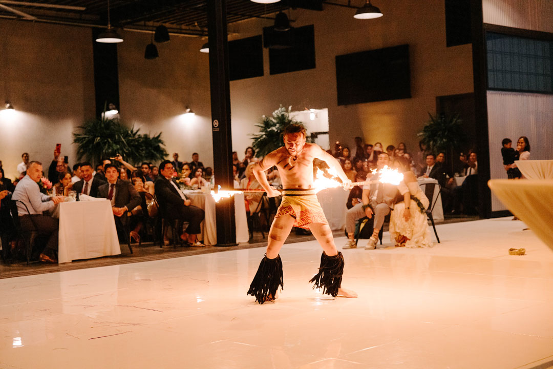 Everyone cheered as Stephanie and Jonathan made their way onto the dance floor for their first dance as husband and wife, and just as their dance ended, the hangar doors opened revealing the reception inside. Tables were topped with white linen and tropical floral arrangements added pops of color around the space. The bride and groom took a seat at their sweetheart table, thanked their guests for coming, and invited everyone to enjoy dinner. A menu of Huli Huli Chicken, Sliced Beef Brisket, Pineapple Fried Rice, Hawaiian Style Potato Macaroni Salad, and Papaya Salad picked by the bride and groom with help from our Event Specialist, Brittany, filled everyone’s plates just in time for toasts. Family and friends stood and shared their favorite memories of the bride and groom and clinked glasses to celebrate. Afterwards, cake was cut and served to guests with a sweet tooth. While everyone enjoyed dessert, entertainment took place on the tarmac dance floor. Hula dancers and fire dancers took the ‘stage’ for an exciting performance, then Stephanie joined and performed a dance for Jonathan. Guests oohed and aahed at the sentimental moment, then joined in on the fun and hit the dance floor to end the night.