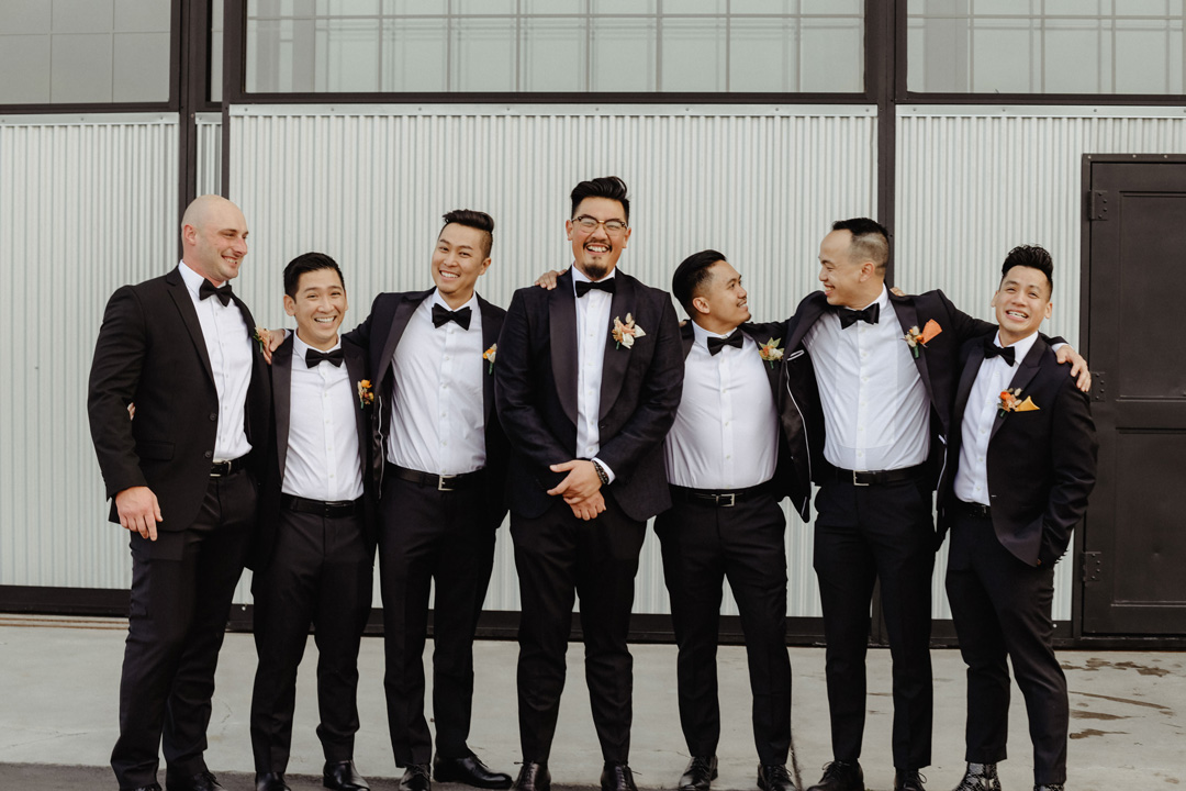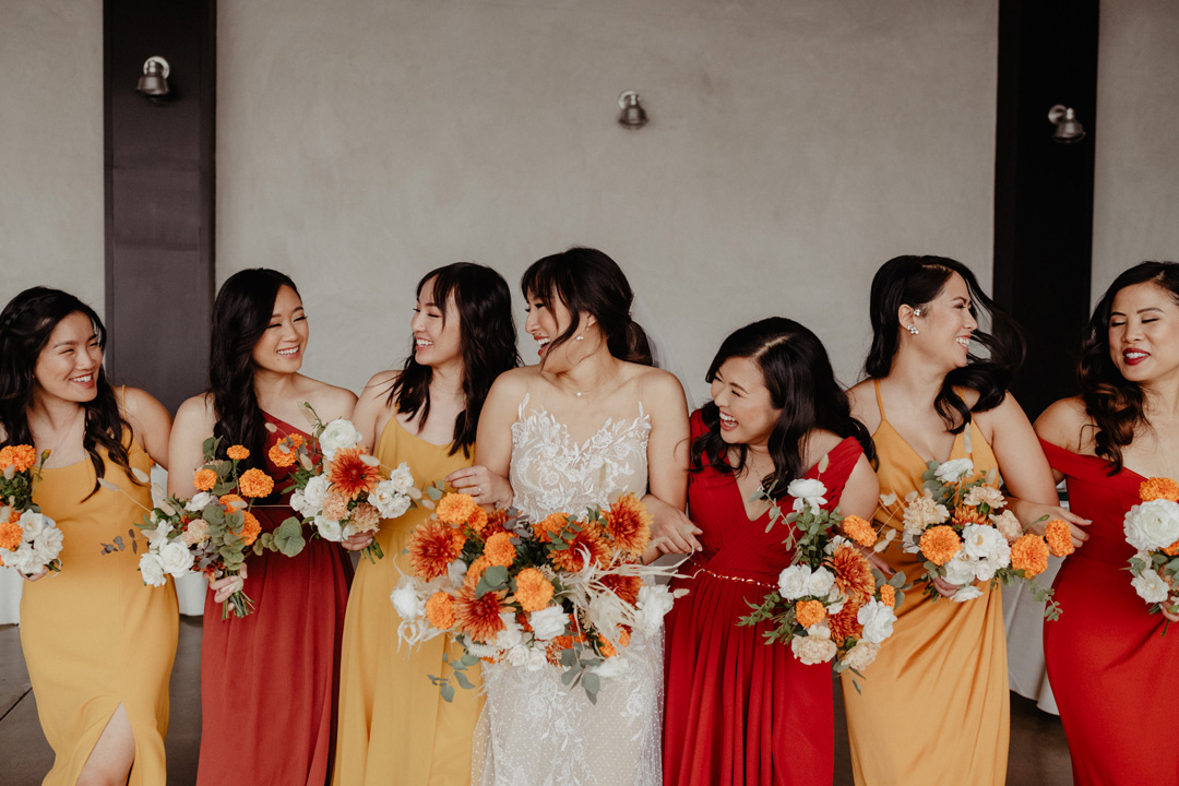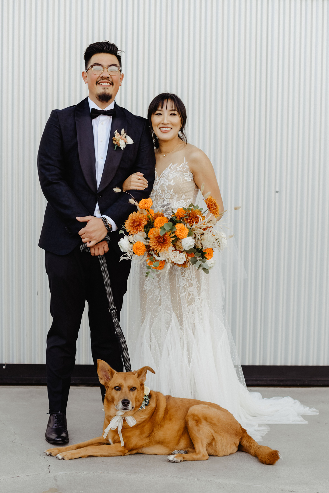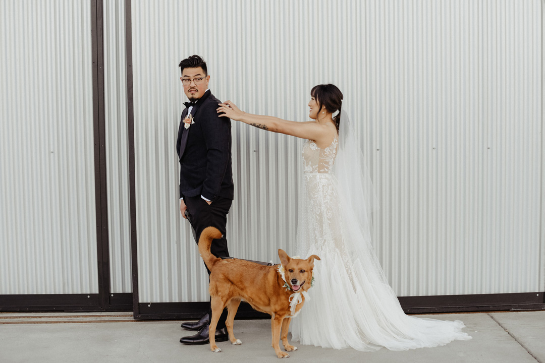 Jenny finished getting ready upstairs in the Bridal Suite at Hangar 21 South while Peter was waiting on the tarmac for their first look. Jenny, in her tulle and lace wedding gown, was followed by her bridesmaids in orange and yellow dresses outside where they were greeted with puppy kisses. Peter stood anxiously awaiting his bride in a black tux, and with a brush of the shoulder, he turned around as tears filled his eyes. Jenny was beaming from ear to ear standing in front of him. Emotions overcame the two of them and a warm embrace was shared along with pets for their dog happily sitting beside them. The bridal party then rushed over oohing and aahing over the couple before lining up for the ceremony.