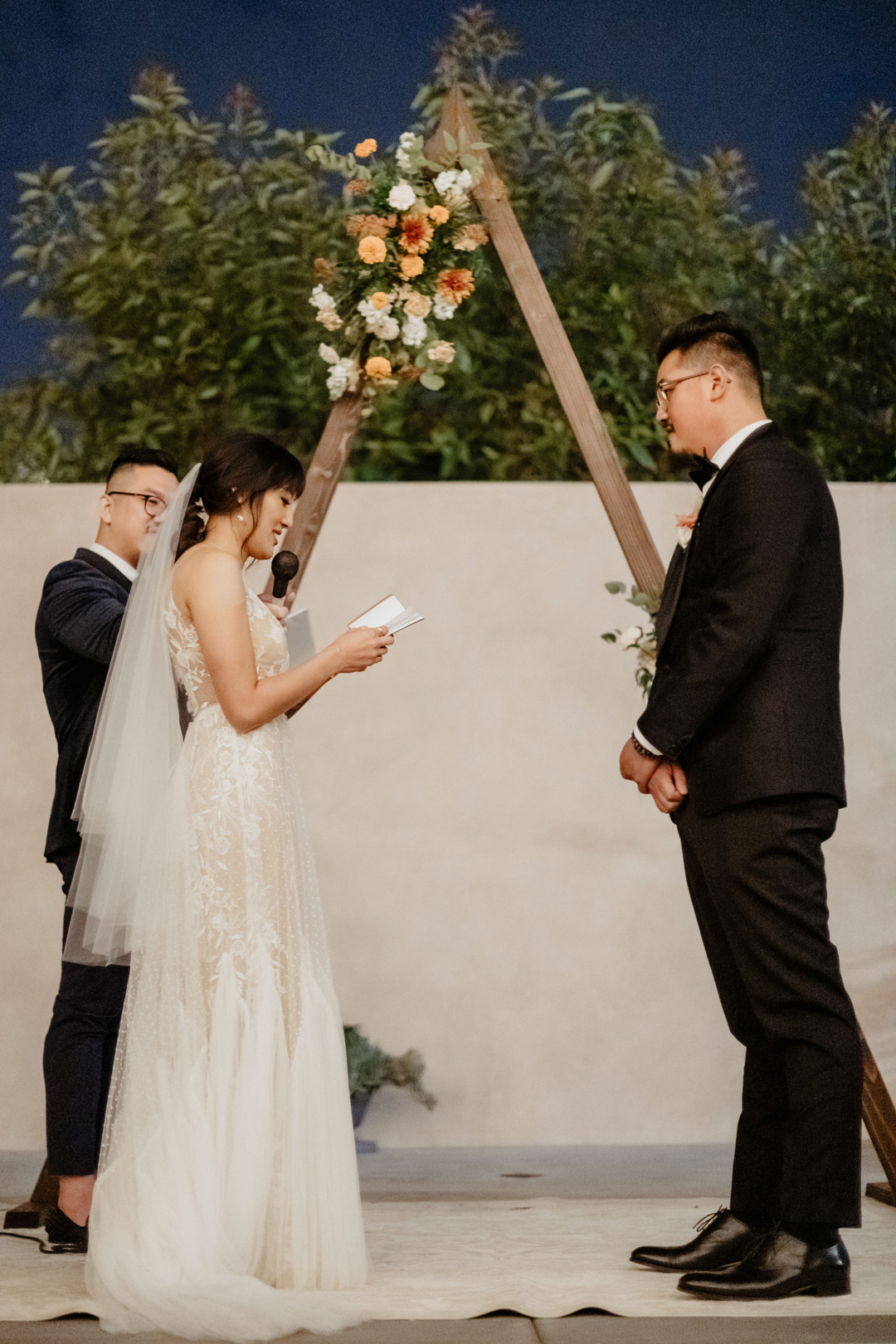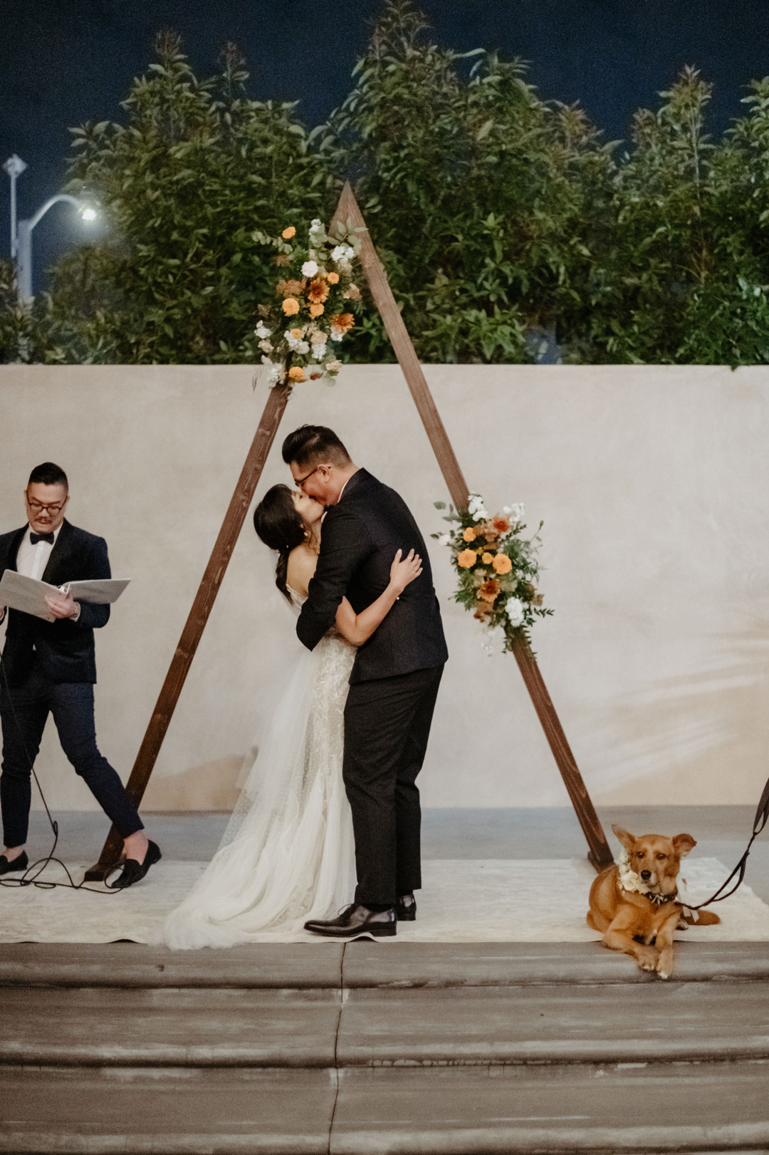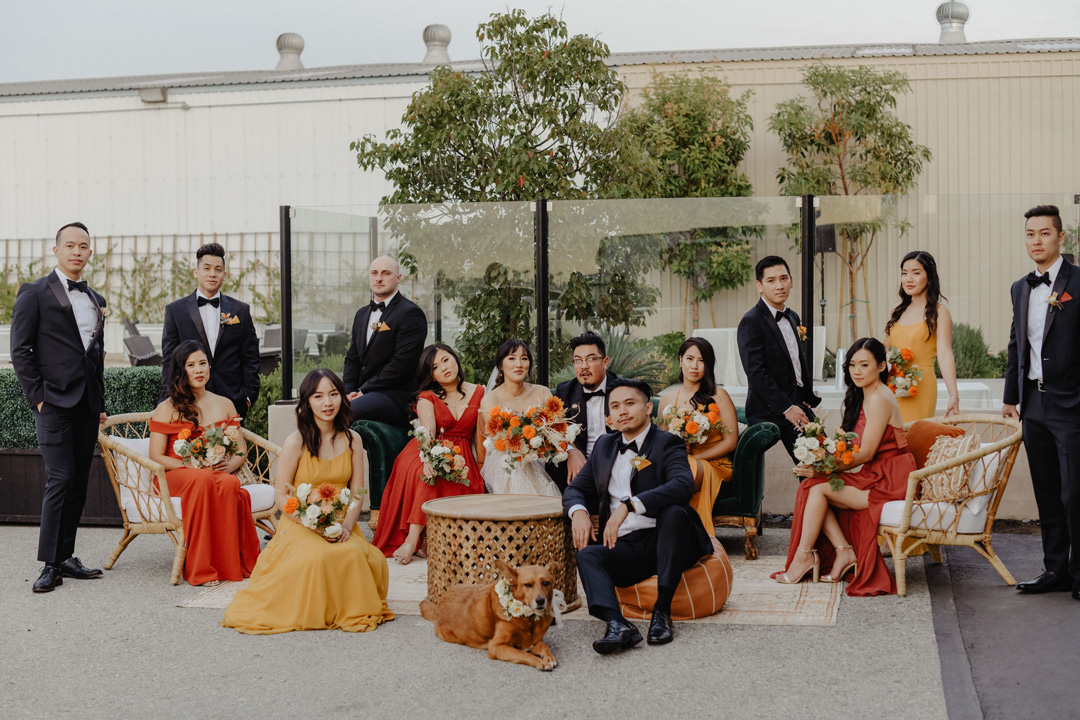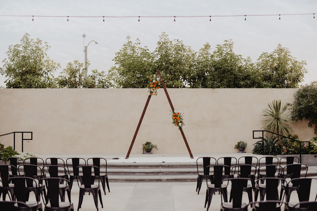 A triangular arbor was set center stage and decorated in bundles of orange and white flowers. Guests entered the side patio, signed the bride and groom’s guest book, then took a seat under romantic, hanging market lights. Music cued up and the bridal party made their entrance. Last but not least, everyone stood as Jenny walked down the aisle over to Peter. The bride and groom exchanged handwritten vows in front of their closest friends and family, exchanged rings, and were pronounced husband and wife. Their cute puppy lead the way out of the ceremony and into cocktail hour on the tarmac.