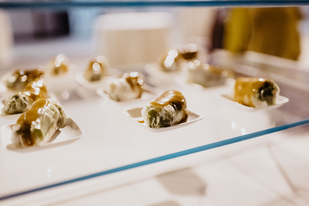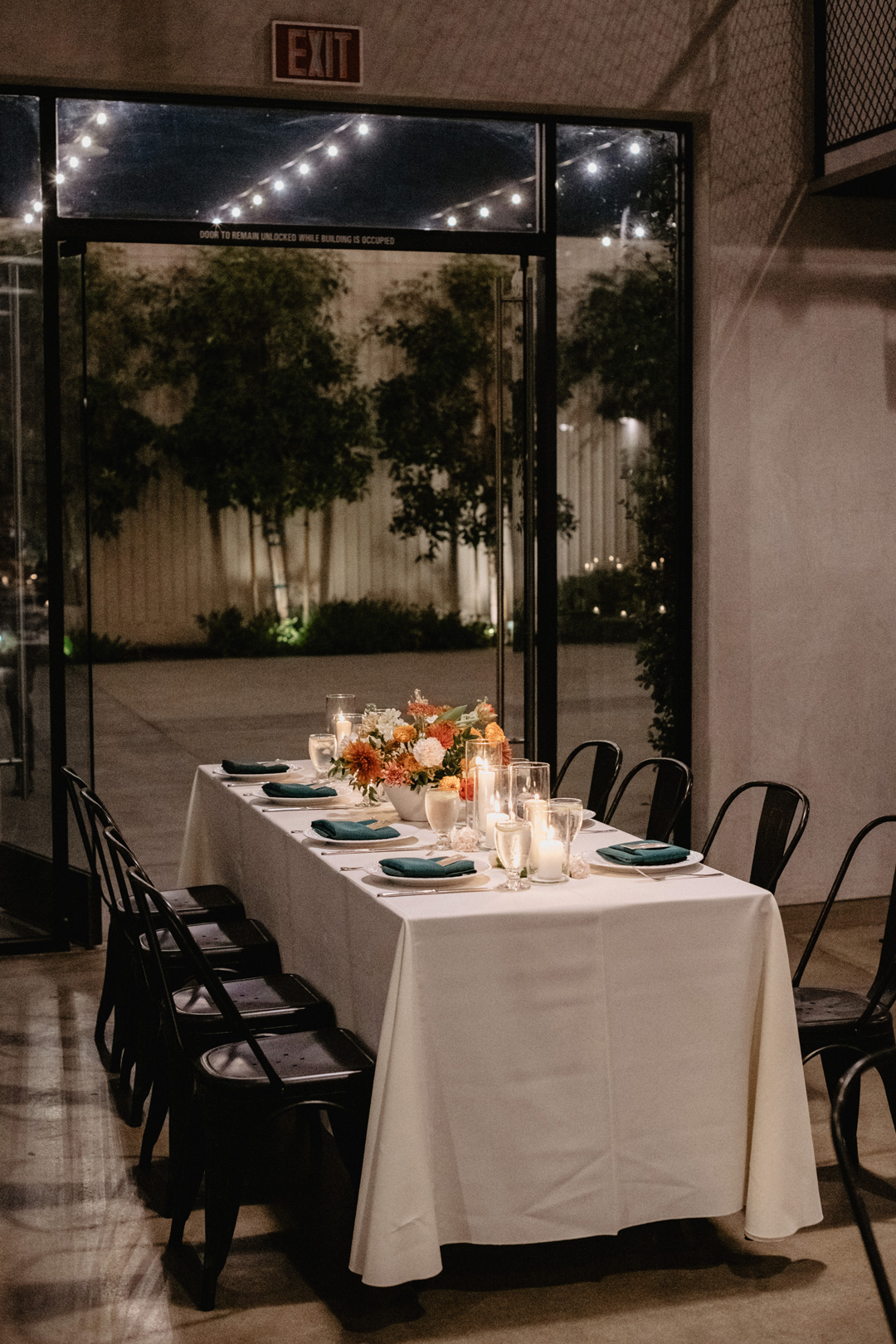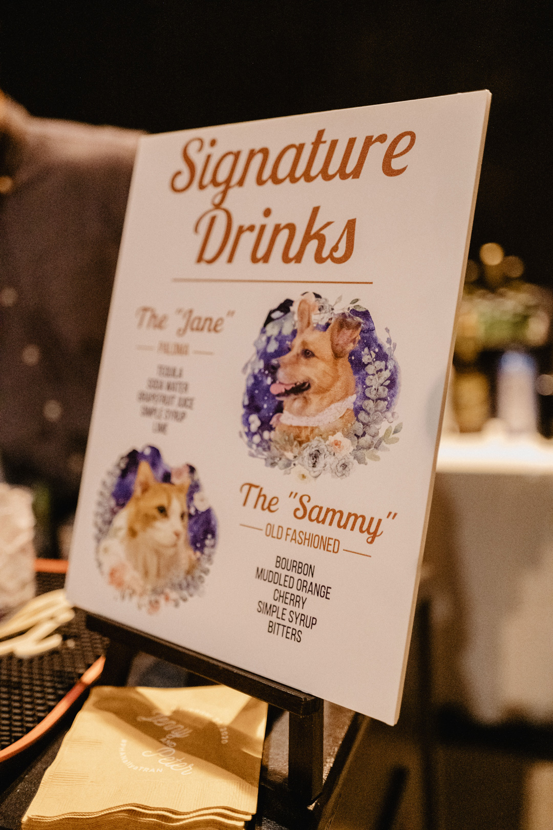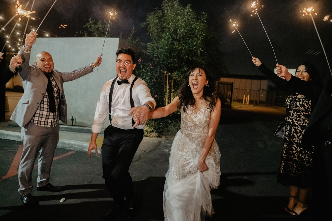A craft cocktail sign created with portraits of their cat and dog stood on the bar top with the newlyweds signature cocktails: The Old Fashioned and Paloma, or The “Jane” and The “Sammy” named after their pets. Crab Cakes and Thai Chicken Spring Rolls were individually plated and enjoyed as the bride and groom mingled with guests before being seated for dinner. Just inside the hangar, tables were draped in ivory linen and emerald napkins sat atop each plate. Floral centerpieces accompanied by candles decorated the tops of every table and a seating chart led guests to their assigned seats. Everyone cheered as the bride and groom entered into their first dance and danced like no one was watching. After, a delicious dinner was served. Our Sales Director, Hannah, along with the bride and groom pre-selected the perfect menu for their special evening. Kalua Pork with Pineapple and Brown Sugar Glaze, Thai Three Flavored BBQ Chicken, Papaya Salad, Jasmine Rice, and Stir Fry Vegetables filled plates and bellies while toasts were shared. After dinner, donuts for dessert were shared and the couple made their rounds to each table to thank guests for coming. The evening ended with a sparkler send off for the happy newlyweds just outside.