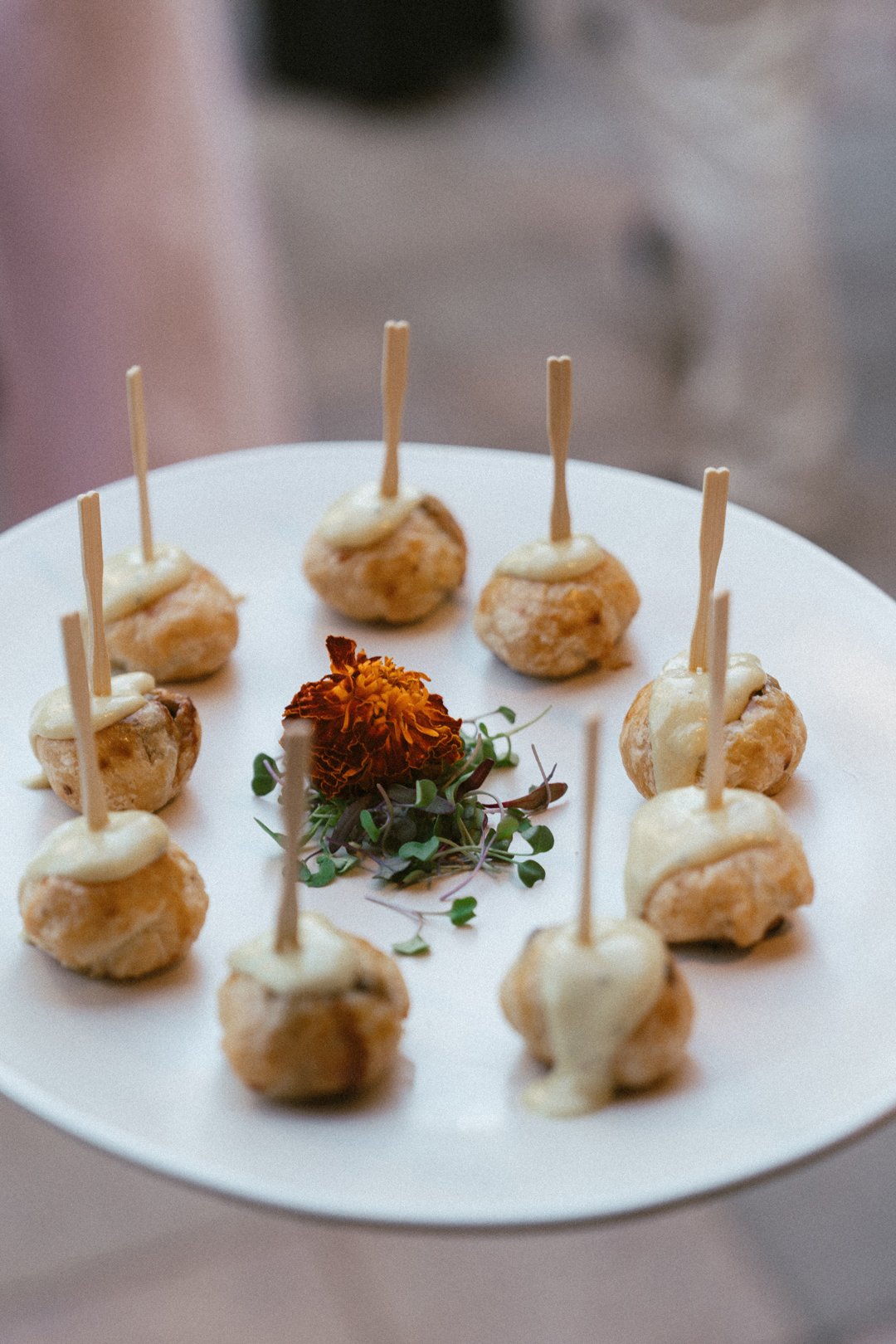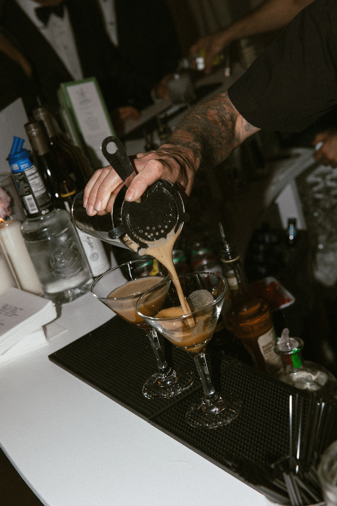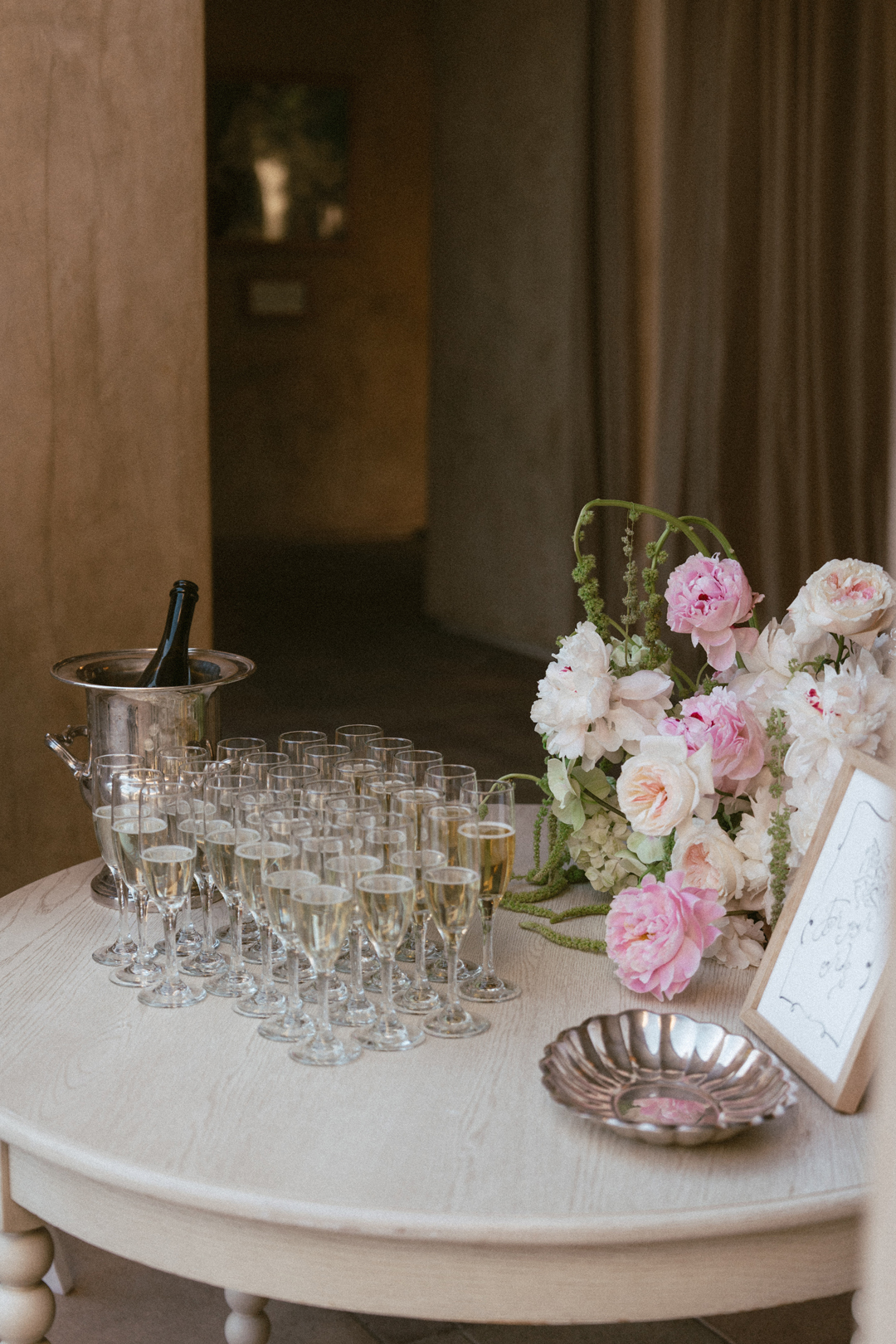 Champagne-colored linens draped tables inside the Lounge and on the Hidden Terrace. Filet and Wild Mushroom Wellingtons and Lemon Parmesan Artichoke Hearts were tray passed while the bar served up Skinny Margarita and Espresso Martini signature drinks. A modern, seafoam green lounge offered additional seating for guests during cocktail hour, and additional romantic and whimsical touches brought everything together. After lots of mixing and mingling, everyone checked the seating chart and headed back outside for the reception.