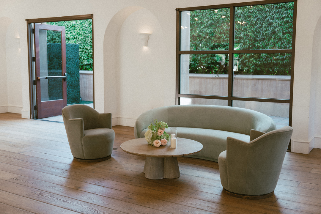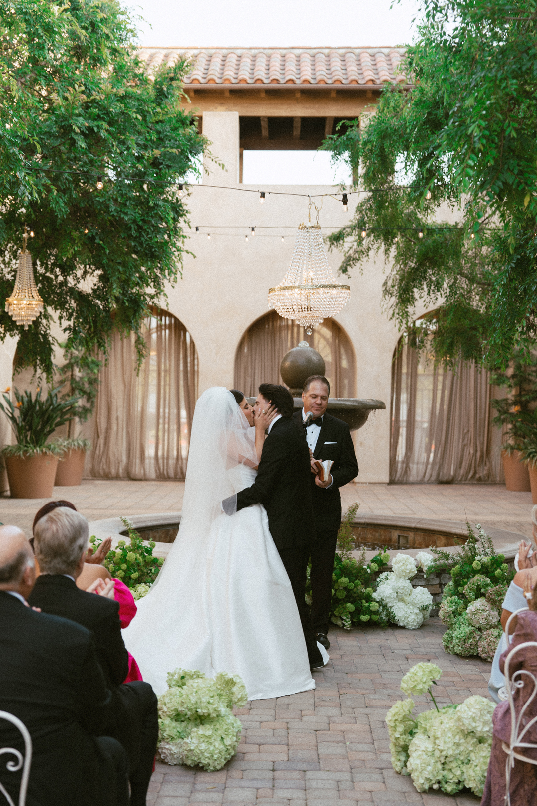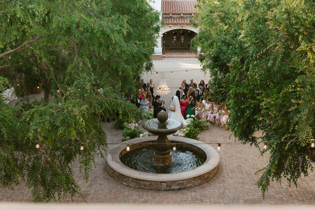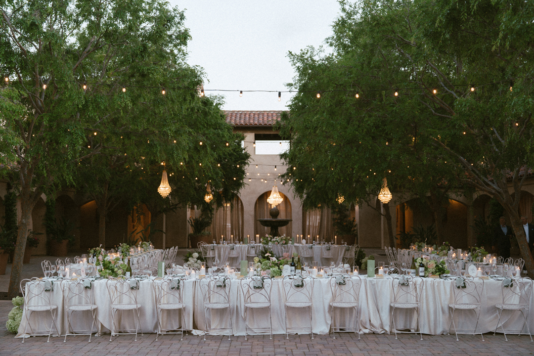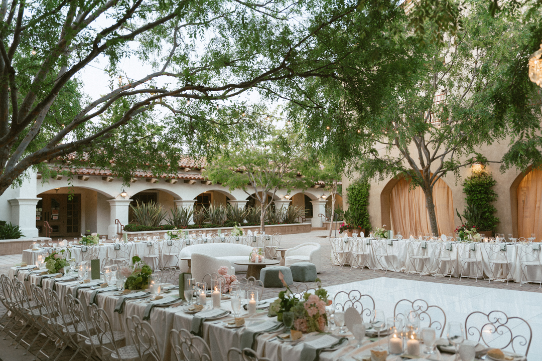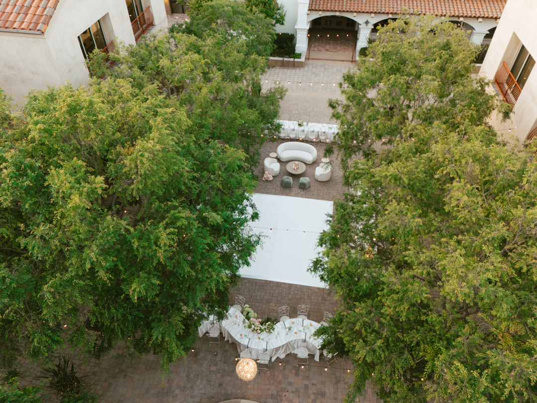 Guests dropped off their gifts, grabbed a glass of champagne, and headed into the Serra Plaza Courtyard where live string music filled the air. Sparkling chandeliers hung above garden bistro chairs, and green and pink flowers were arranged to decorate the space. Once everyone was in attendance, the wedding party made their entrances ending with Jordan. Joined together in front of all their closest friends and family, Jordan and Chris read personalized vows, exchanged rings, and sealed the ceremony with a kiss.
