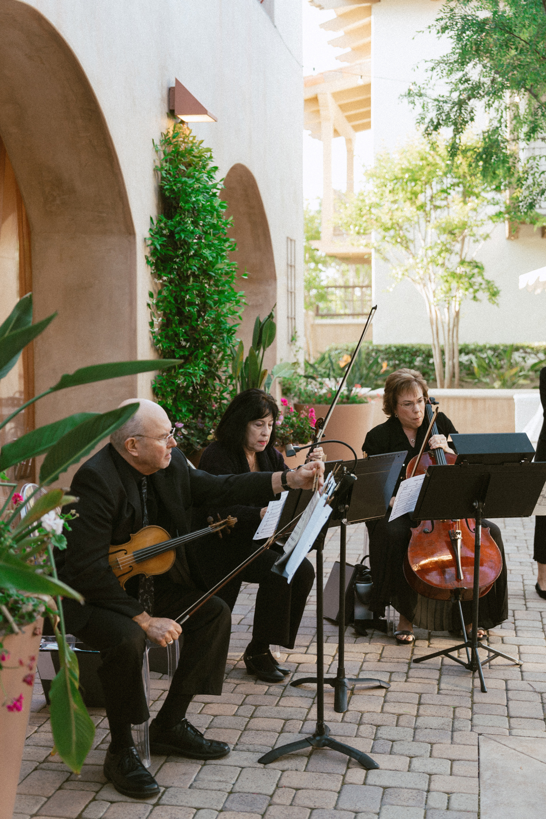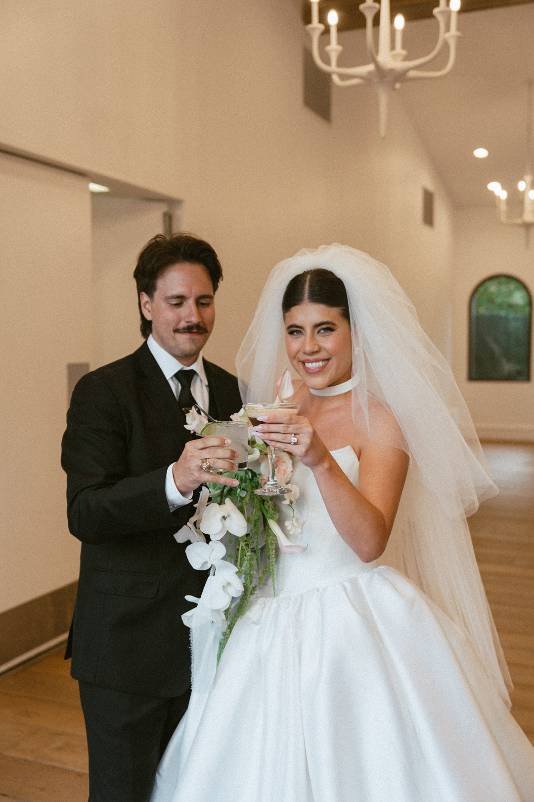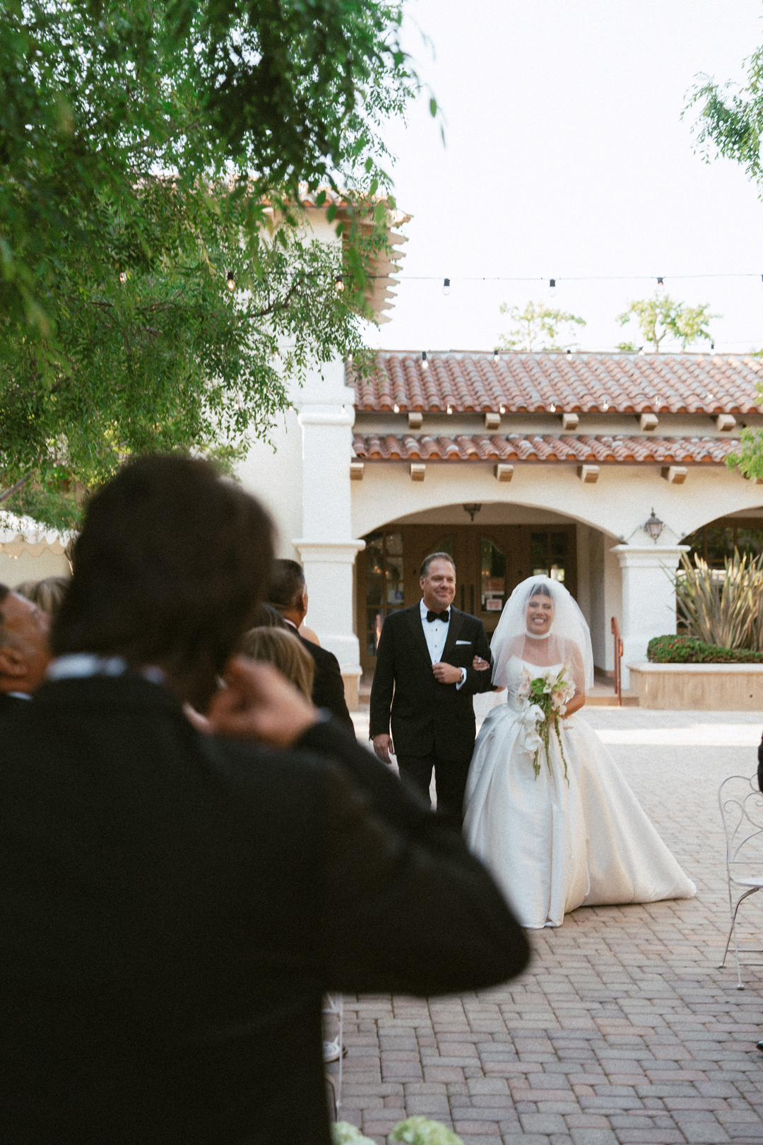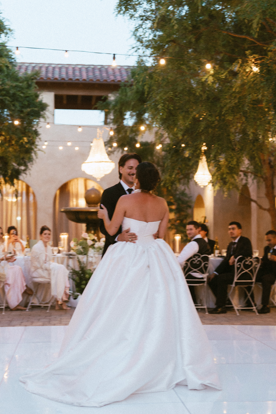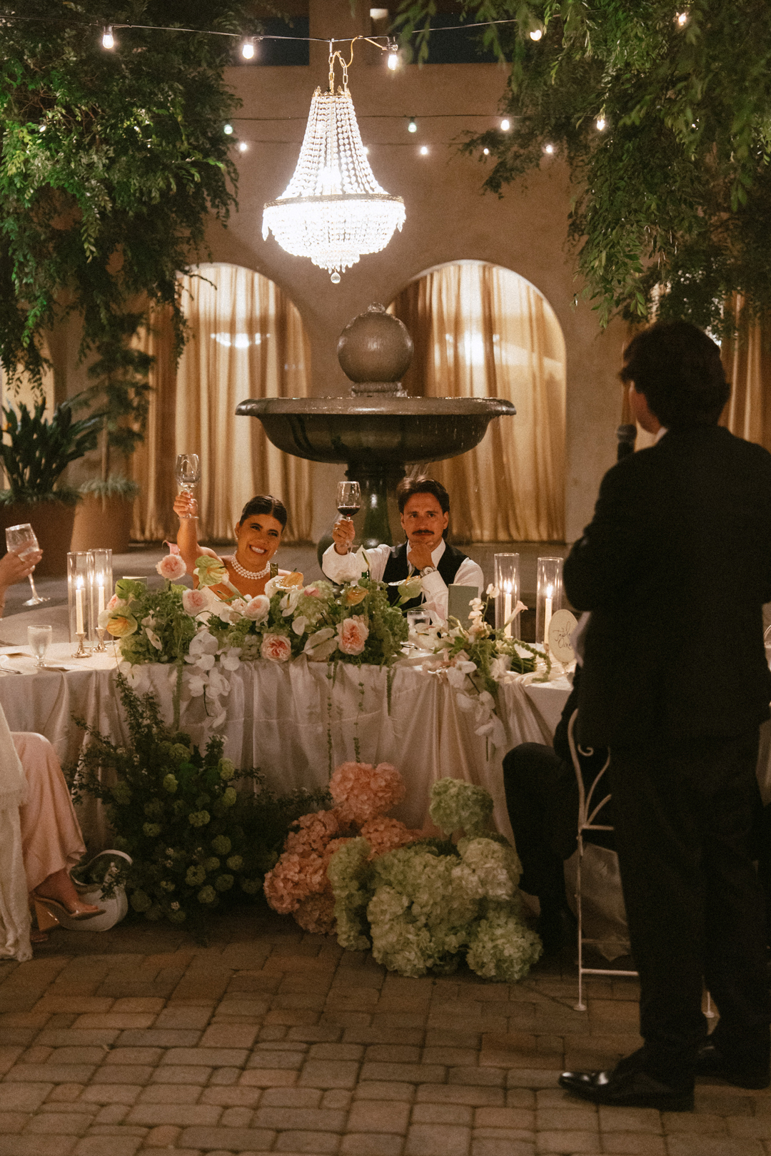 Guests dropped off their gifts, grabbed a glass of champagne, and headed into the Serra Plaza Courtyard where live string music filled the air. Sparkling chandeliers hung above garden bistro chairs, and green and pink flowers were arranged to decorate the space. Once everyone was in attendance, the wedding party made their entrances ending with Jordan. Joined together in front of all their closest friends and family, Jordan and Chris read personalized vows, exchanged rings, and sealed the ceremony with a kiss.