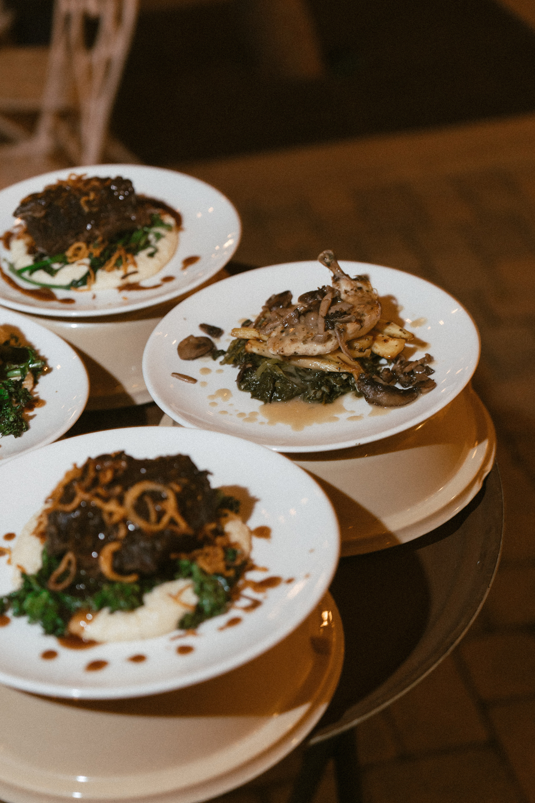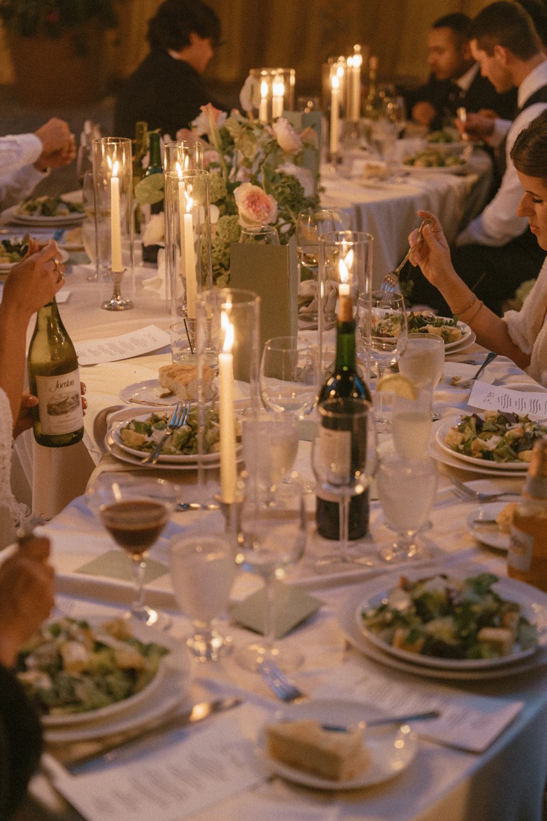 Tables were draped in ivory and topped with fresh green and pink floral centerpieces. A white dance floor was positioned under Serra Plaza’s chandeliers and bordered by the reception tables and an ivory and seafoam lounge. Chris and Jordan made their grand entrance, shared their first dance, and took a seat at their serpentine head table. Our Ultimate Caesar Salad was served while toasts were shared, followed by plates of Frenched Chicken with Roasted Parsnips, Wild Mushrooms, and Bloomsdale Spinach, Braised Short Ribs with Parmesan Polenta, Fried Shallots, and Broccoli De Ciccio, and Wild Mushroom and Black Truffle Pasta. The dinner menu was selected by the bride and groom with help from our event specialist, Selena. After dinner everyone hit the dance floor to show off their best moves. The cake was cut, guests indulged in dessert, and well wishes were shared with the newlyweds as the evening came to a close.