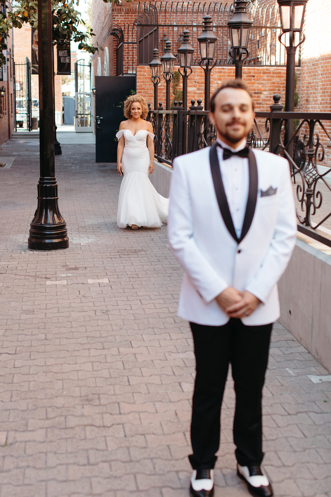 The sun was shining through The Attic windows at The Estate on Second as Breanna slipped into her mermaid-style wedding gown, grabbed her bouquet filled with white roses, and awaited her first look with her bridesmaids. A countdown from 3 began and all together, the bridesmaids dressed in black turned around to see Breanna glowing in her wedding look. Hugs were shared and compliments were given all around, then the girls posed for group photos together before the bride left for her first look with her groom.