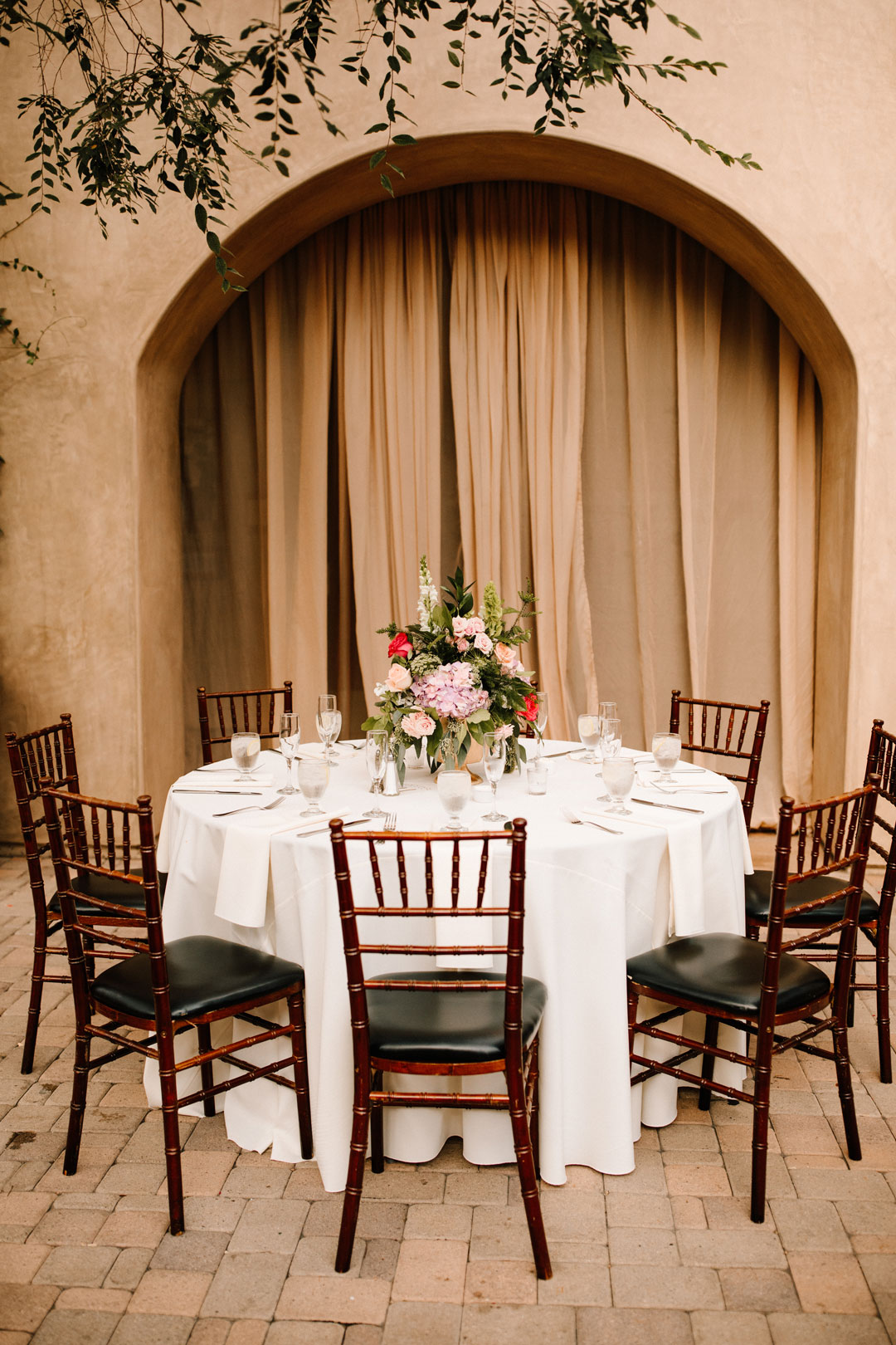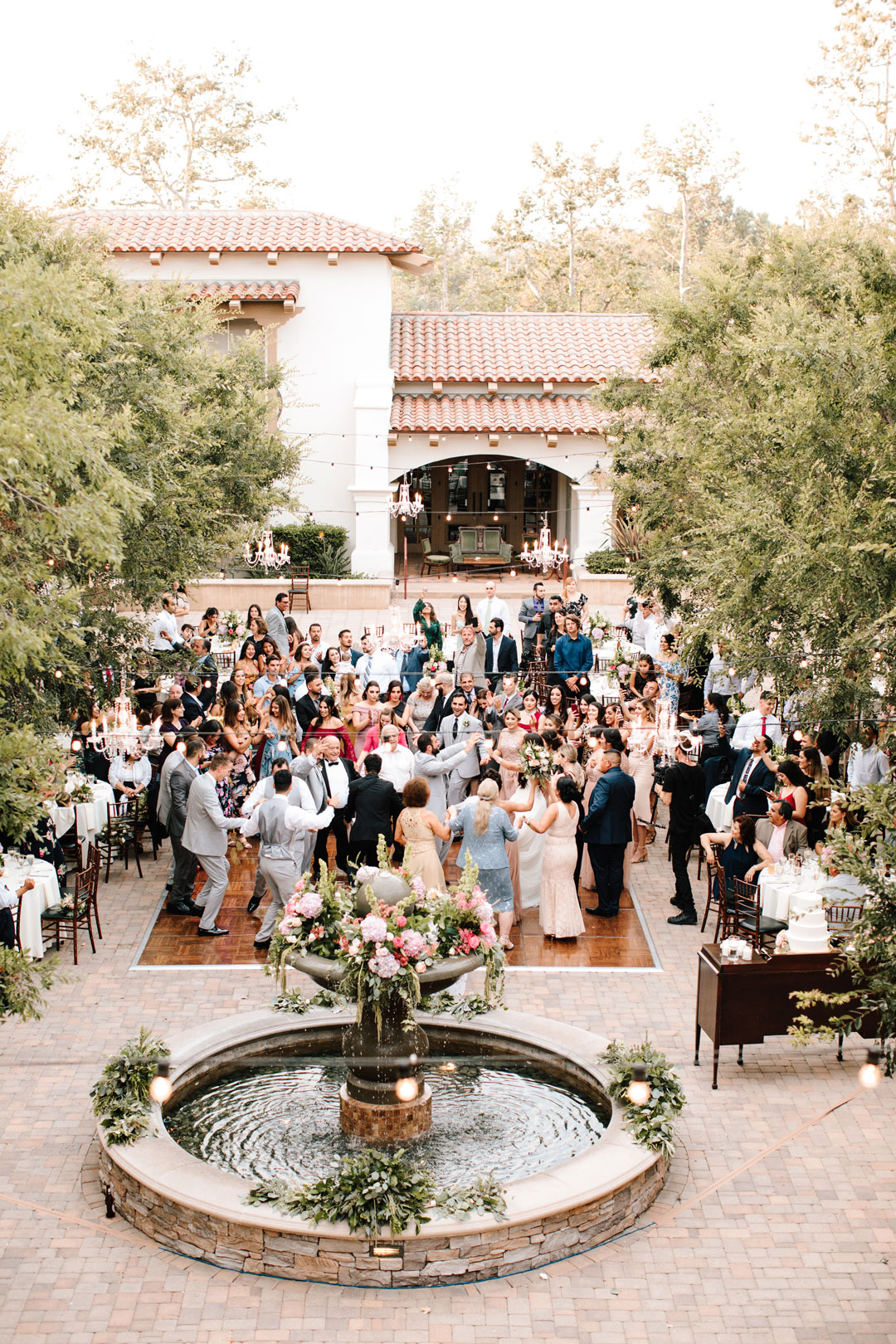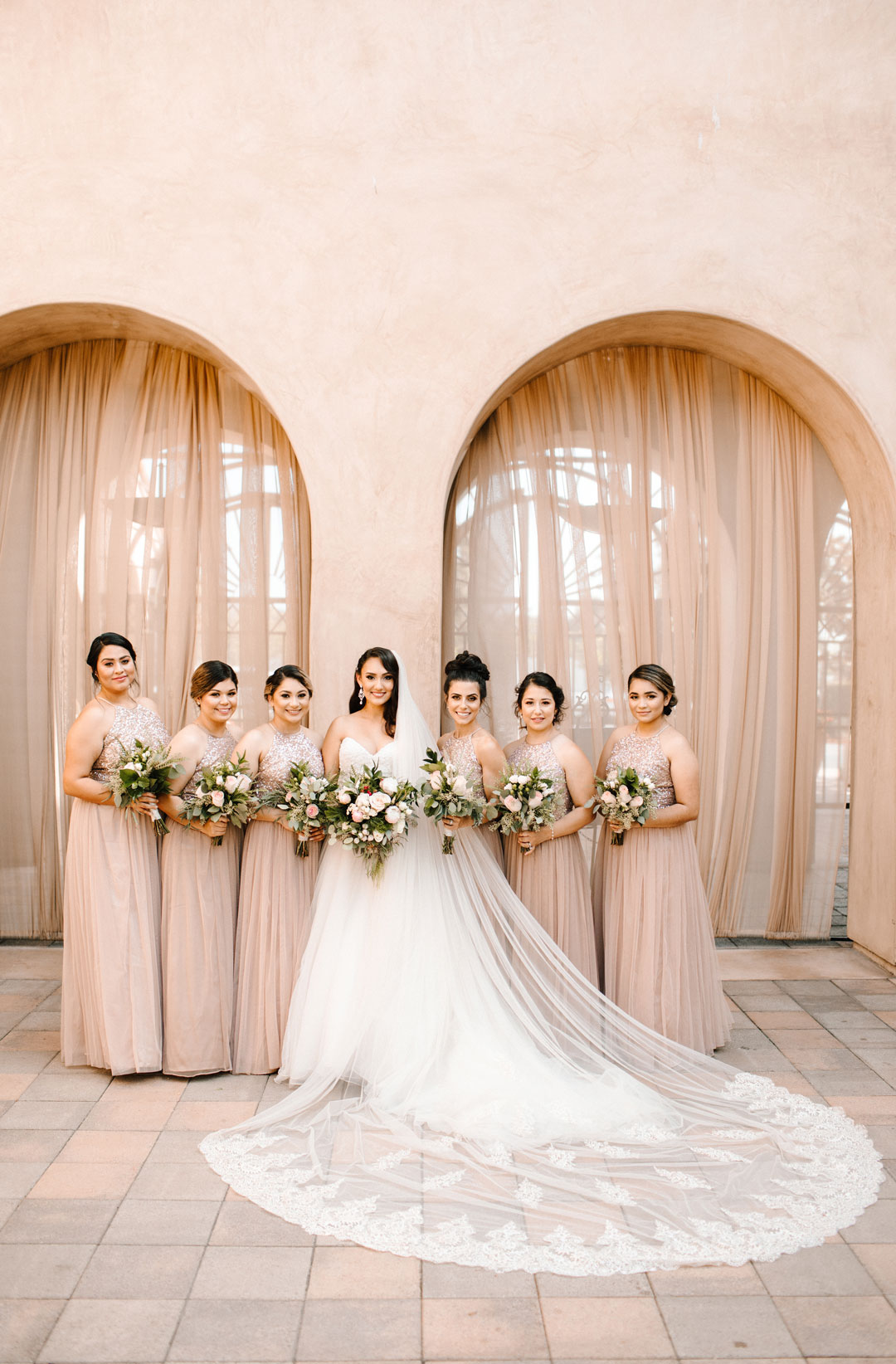 Serra Plaza was dressed in greenery and pink and purple florals for Araceli and David’s wedding. The aisle was lined with wooden boards that had love quotes handwritten on them and bouquets attached to the tops of chairs. Before guests arrived for the ceremony, the bridesmaids and groomsmen posed for a few group shots. The bridesmaids wore champagne colored maxi dresses with sequin detailing while the groomsmen were suited up in light grey. Araceli, the bride, wore a breathtaking wedding gown with a beaded bustier accented with a statement veil with lace trim. After pictures, the wedding party made their way down the aisle followed by the bride arm in arm with her mother and father. Araceli met David at the altar where they recited loving vows, exchanged rings, and sealed the deal with a kiss.